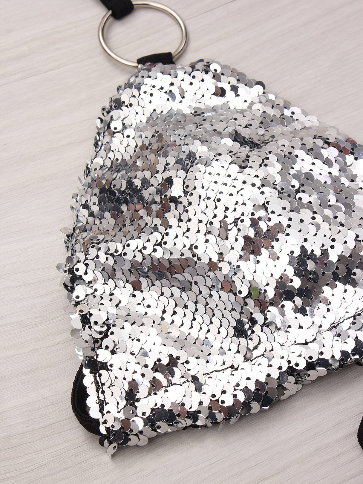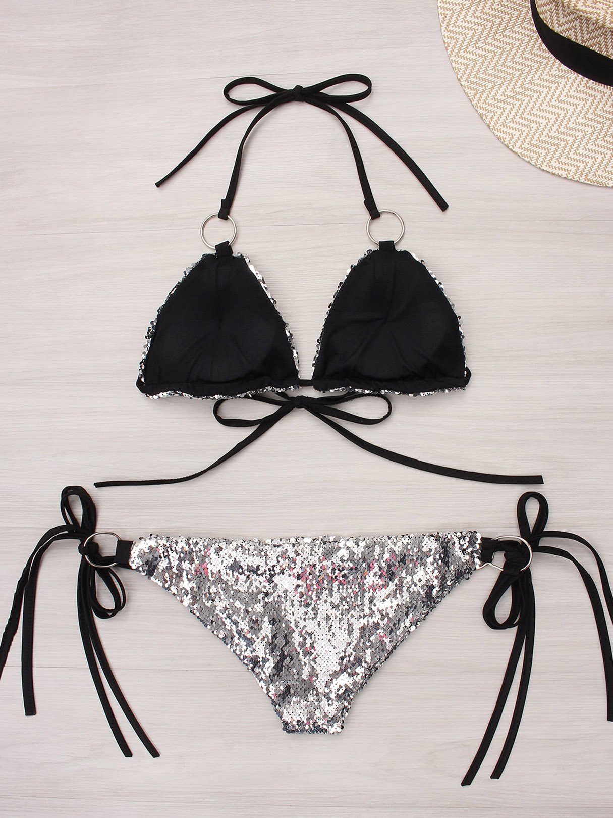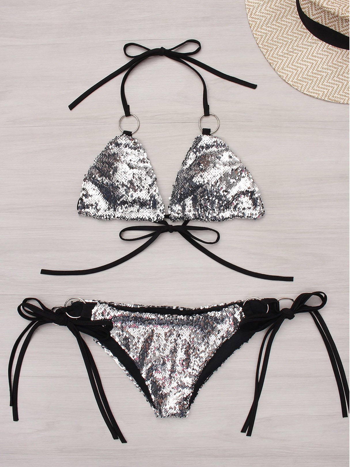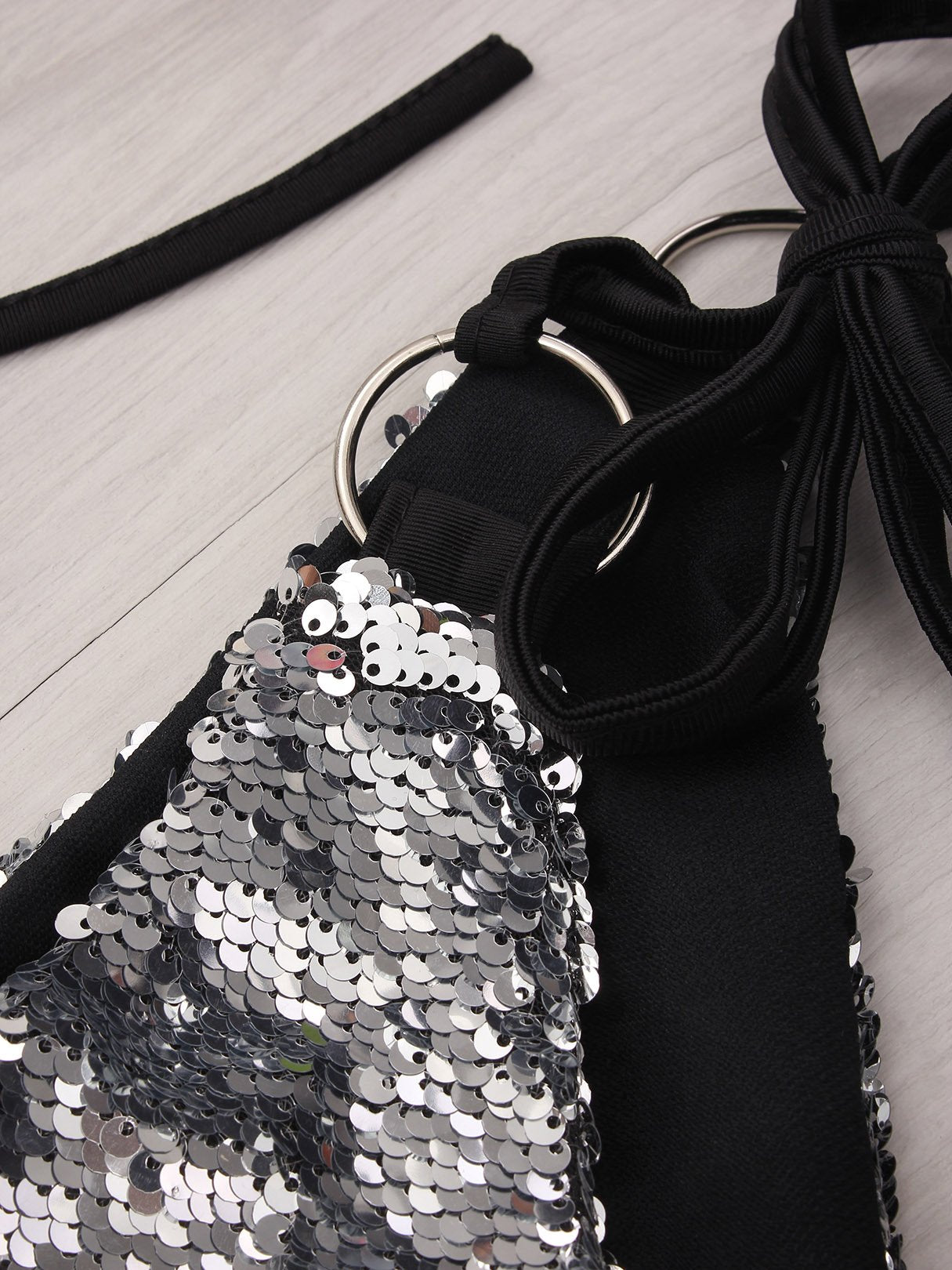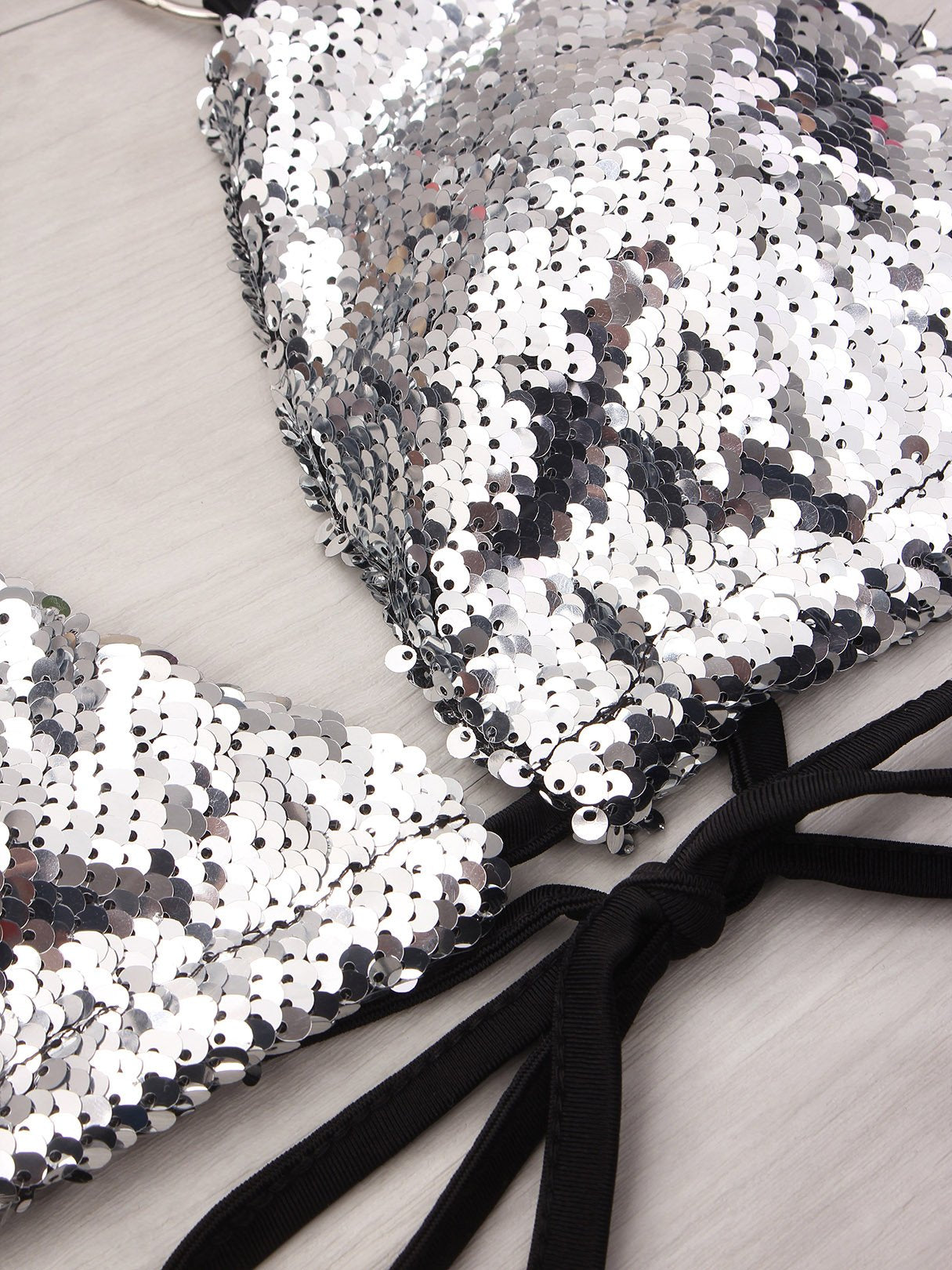 Silver Halter Sequins Embellished Sleeveless Bikinis