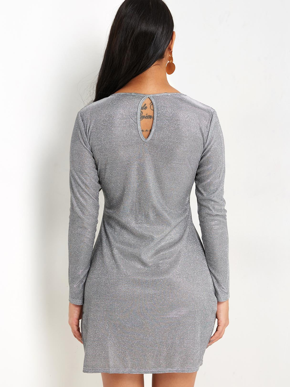Silver Round Neck Long Sleeve Plain Slit Hem Sexy Dress