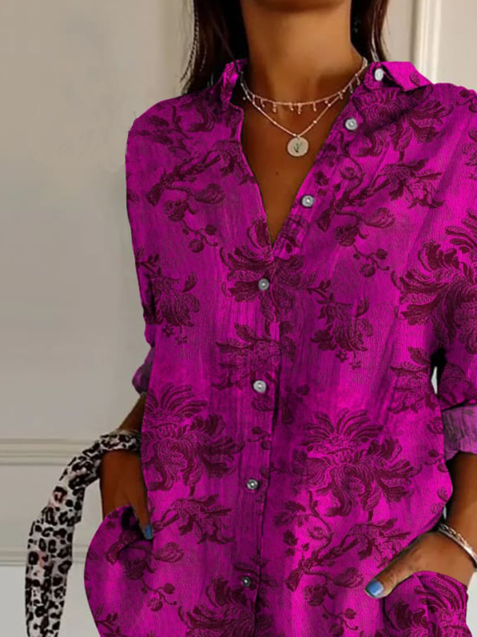 Simple Long Sleeve Shawl Collar Floral Loose Mid-Long Shirt - Rose Red / S is backordered and will ship as soon as it is back in stock.