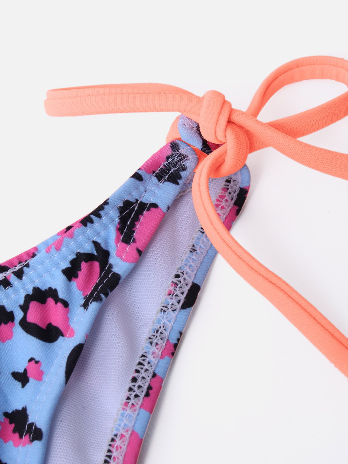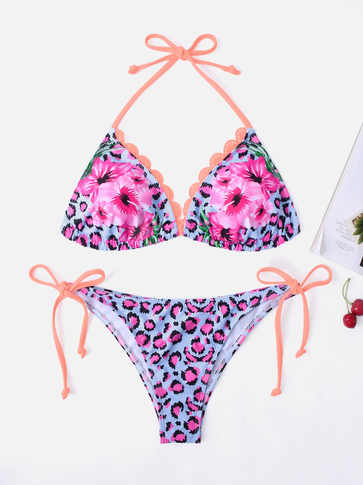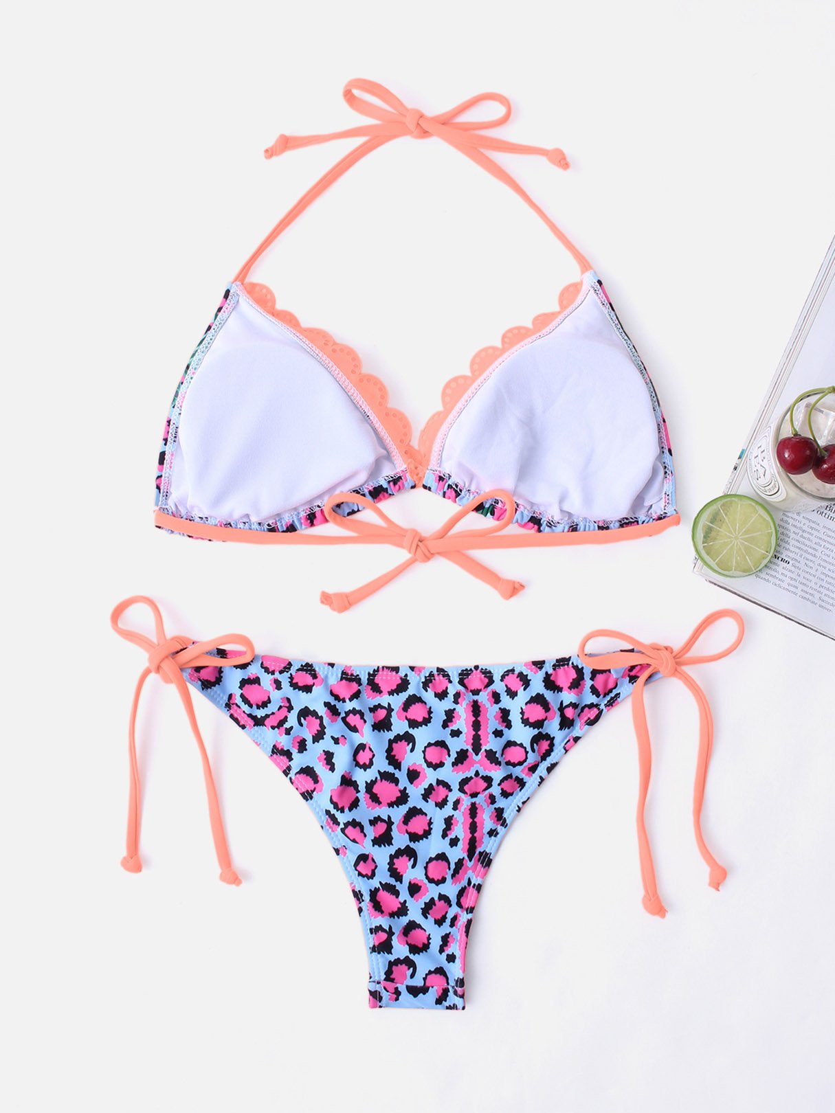 Sky Blue Halter Sleeveless Leopard Floral Print Lace-Up Two Piece Bikinis