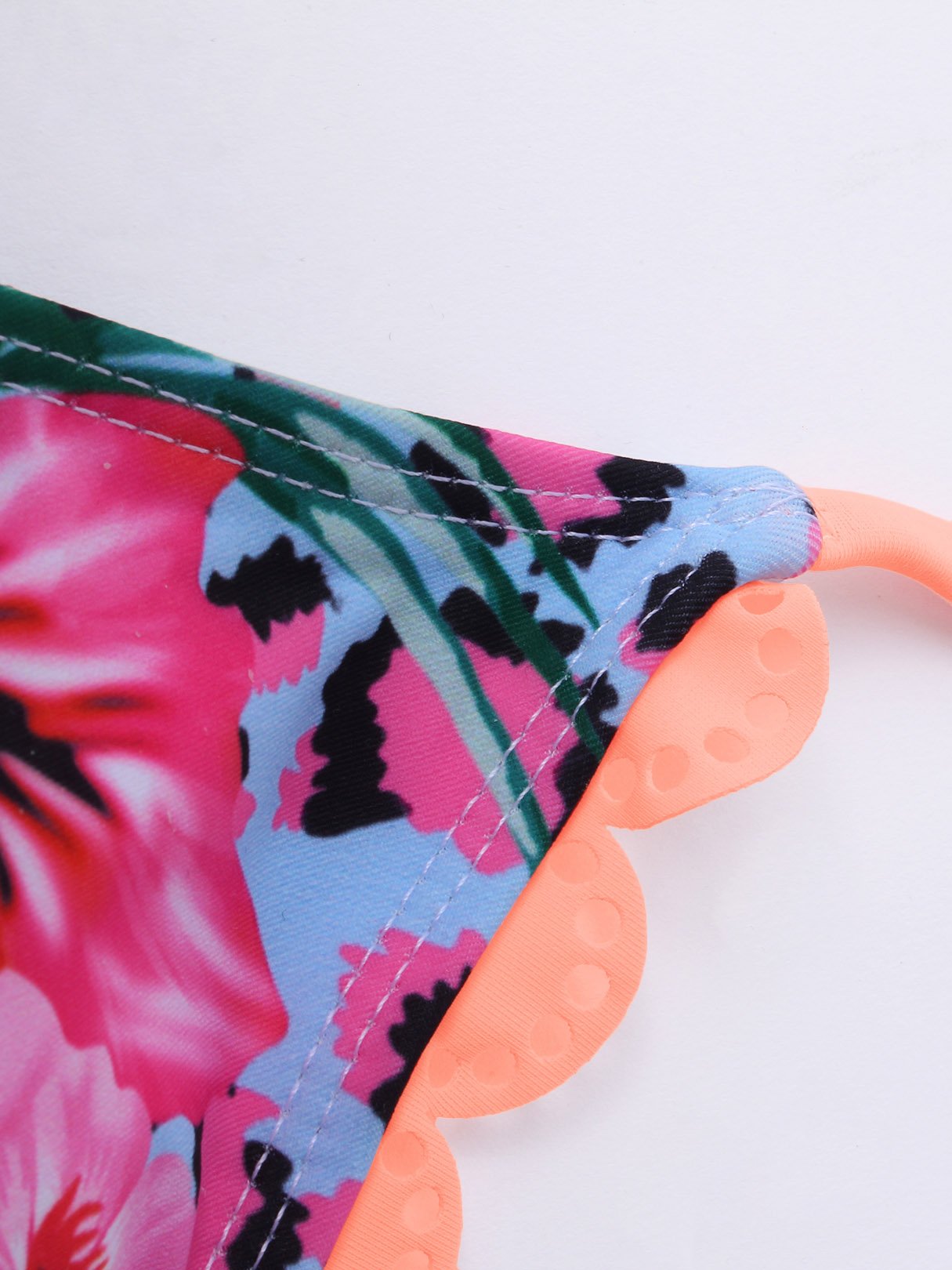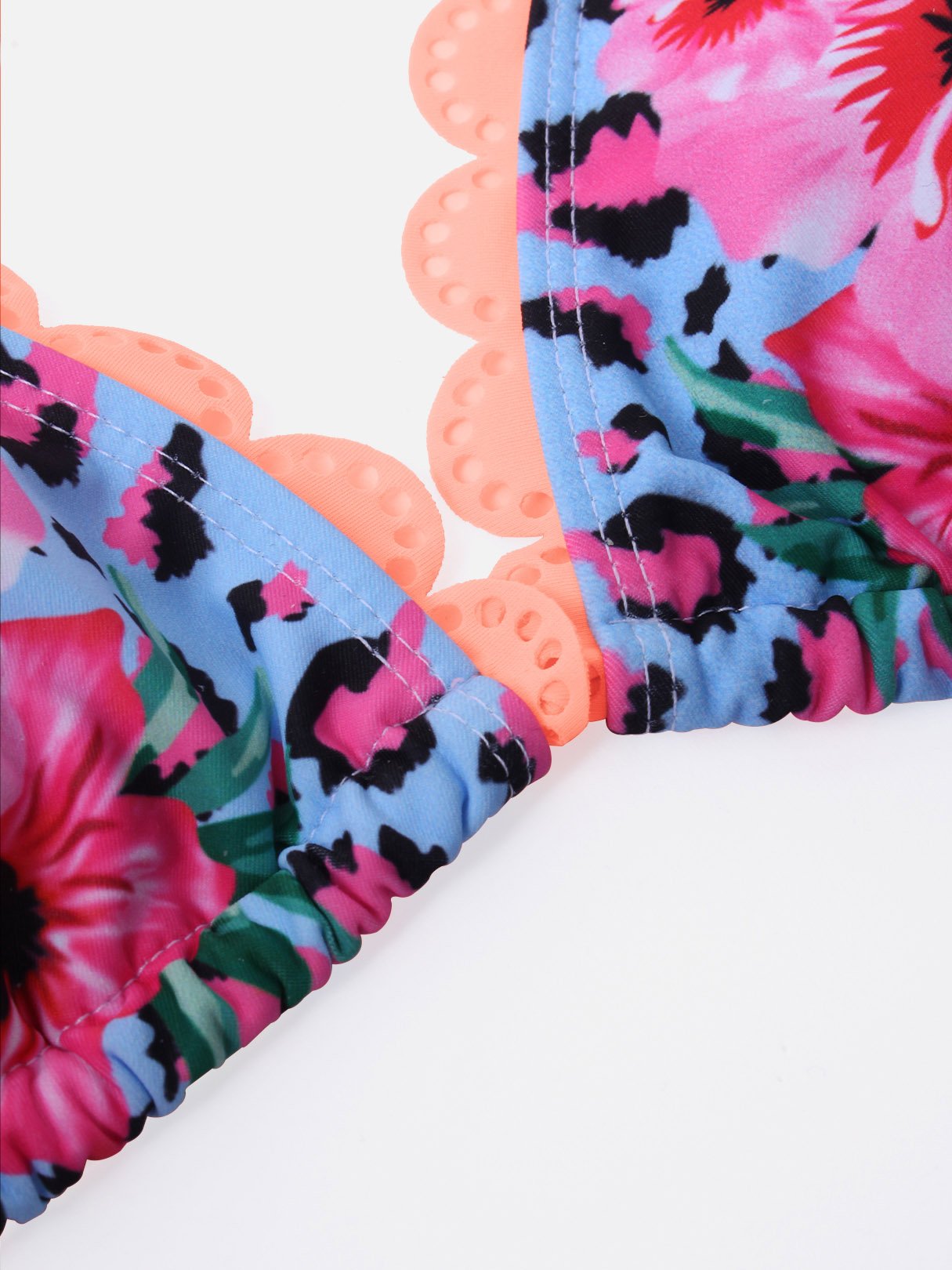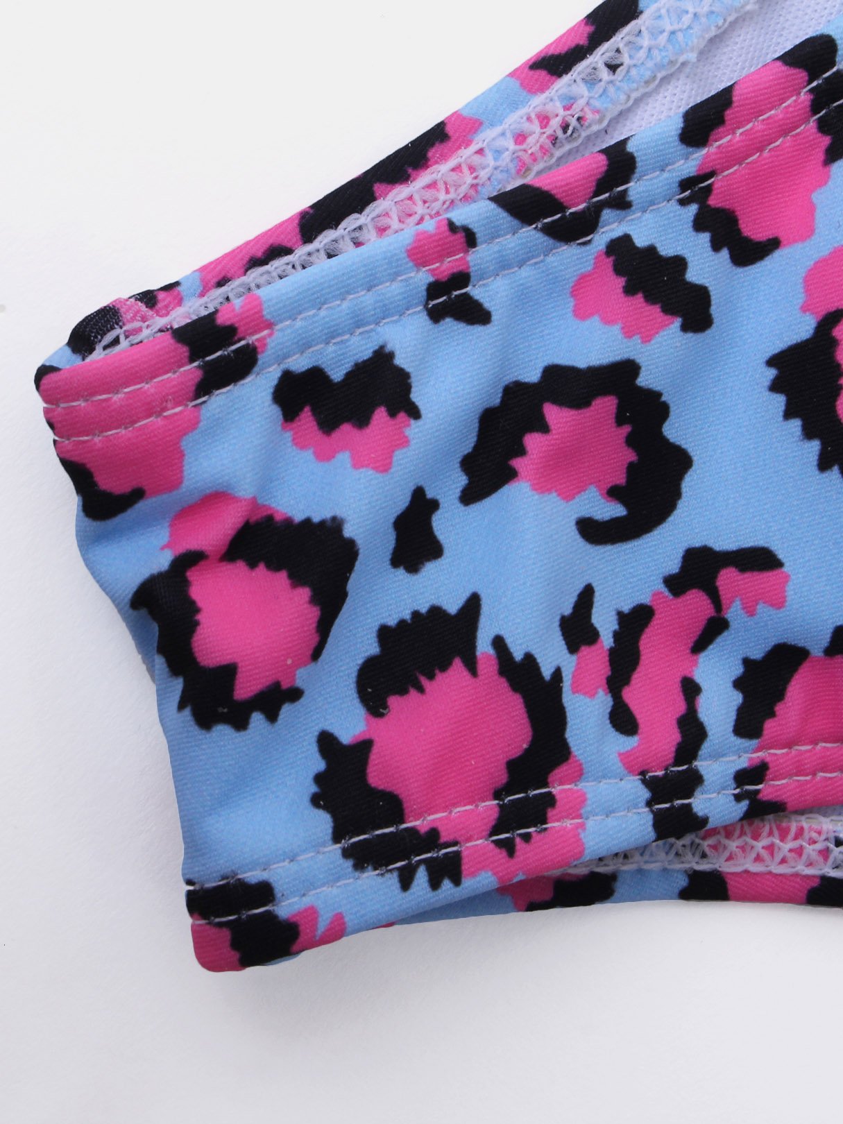 Sky Blue Halter Sleeveless Leopard Floral Print Lace-Up Two Piece Bikinis