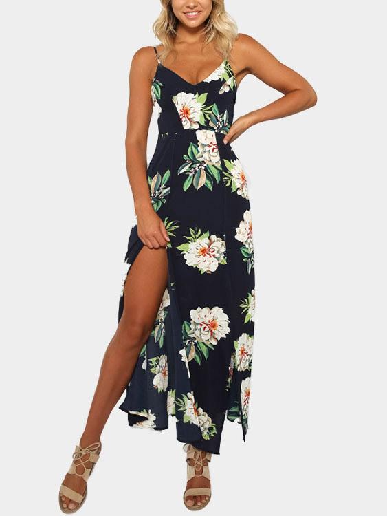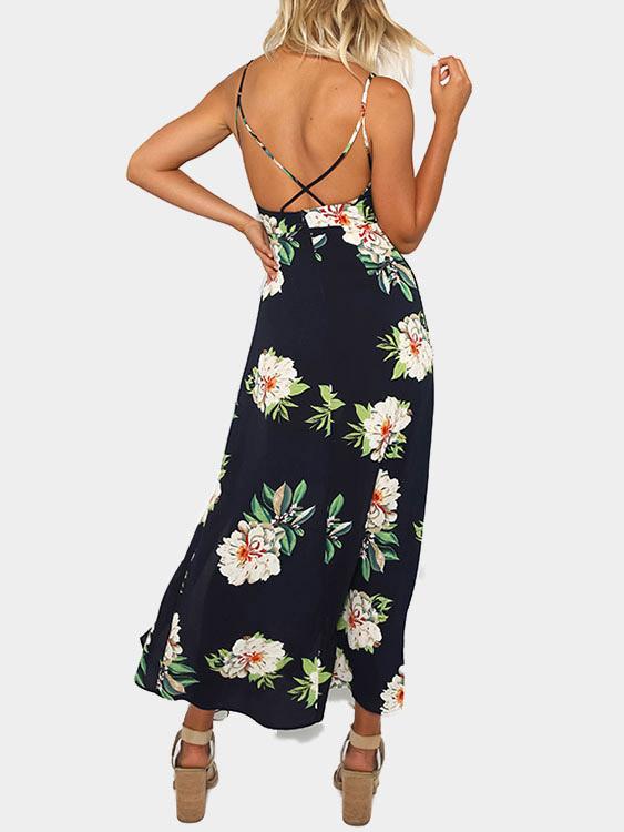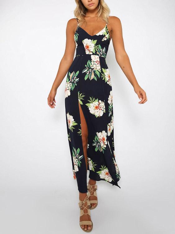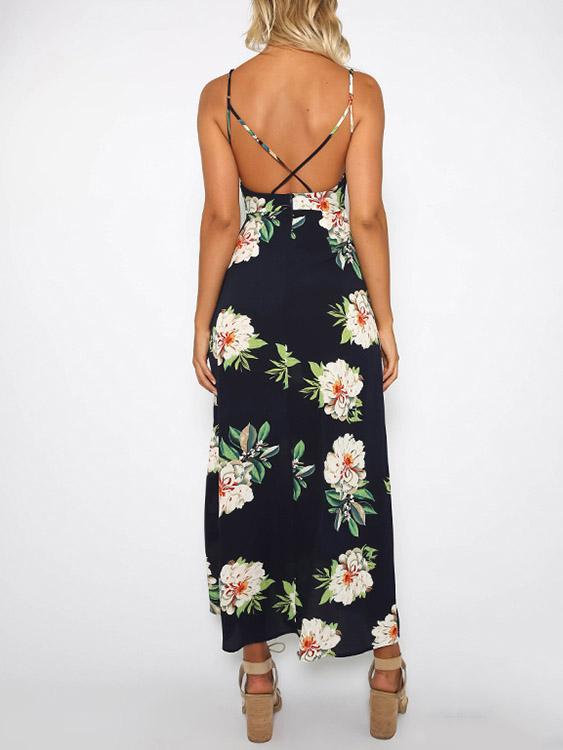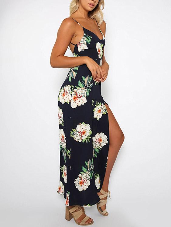 Sleeveless Floral Print Backless Slit Hem Dresses