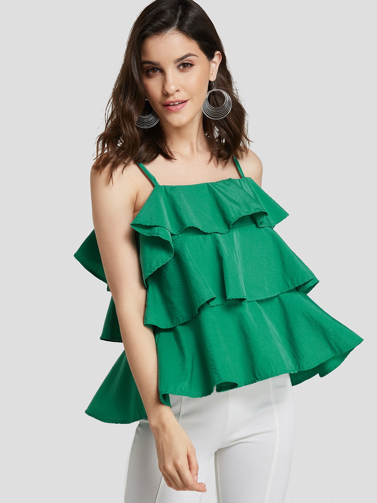 Square Neck Plain Tiered Spaghetti Strap Sleeveless Green Camis