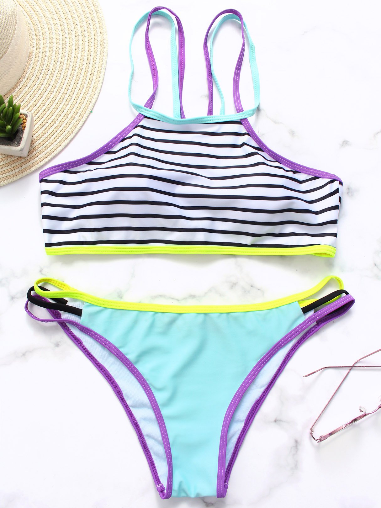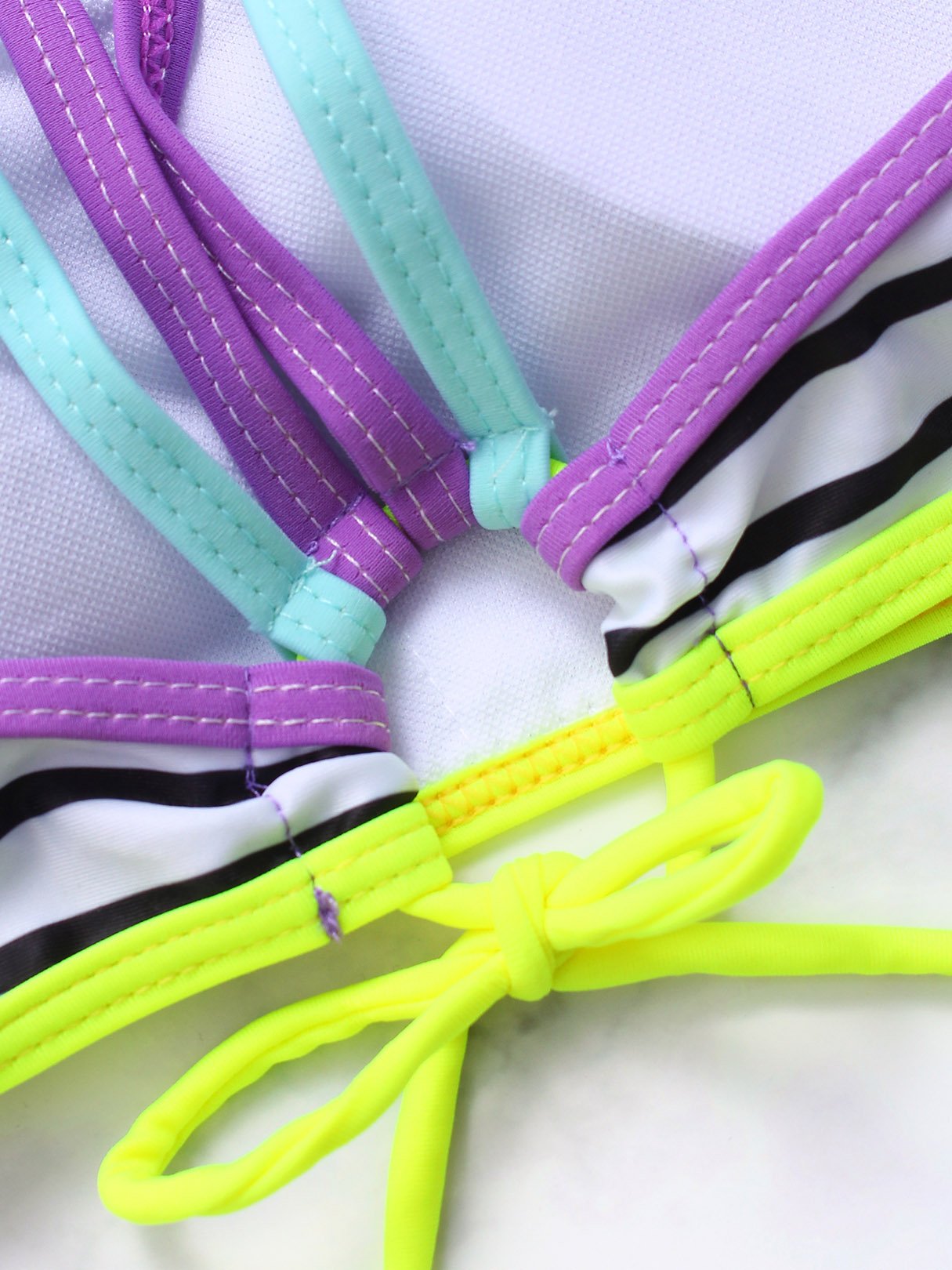Square Neck Sleeveless Stripe Lace-Up Slit Bikini Set
