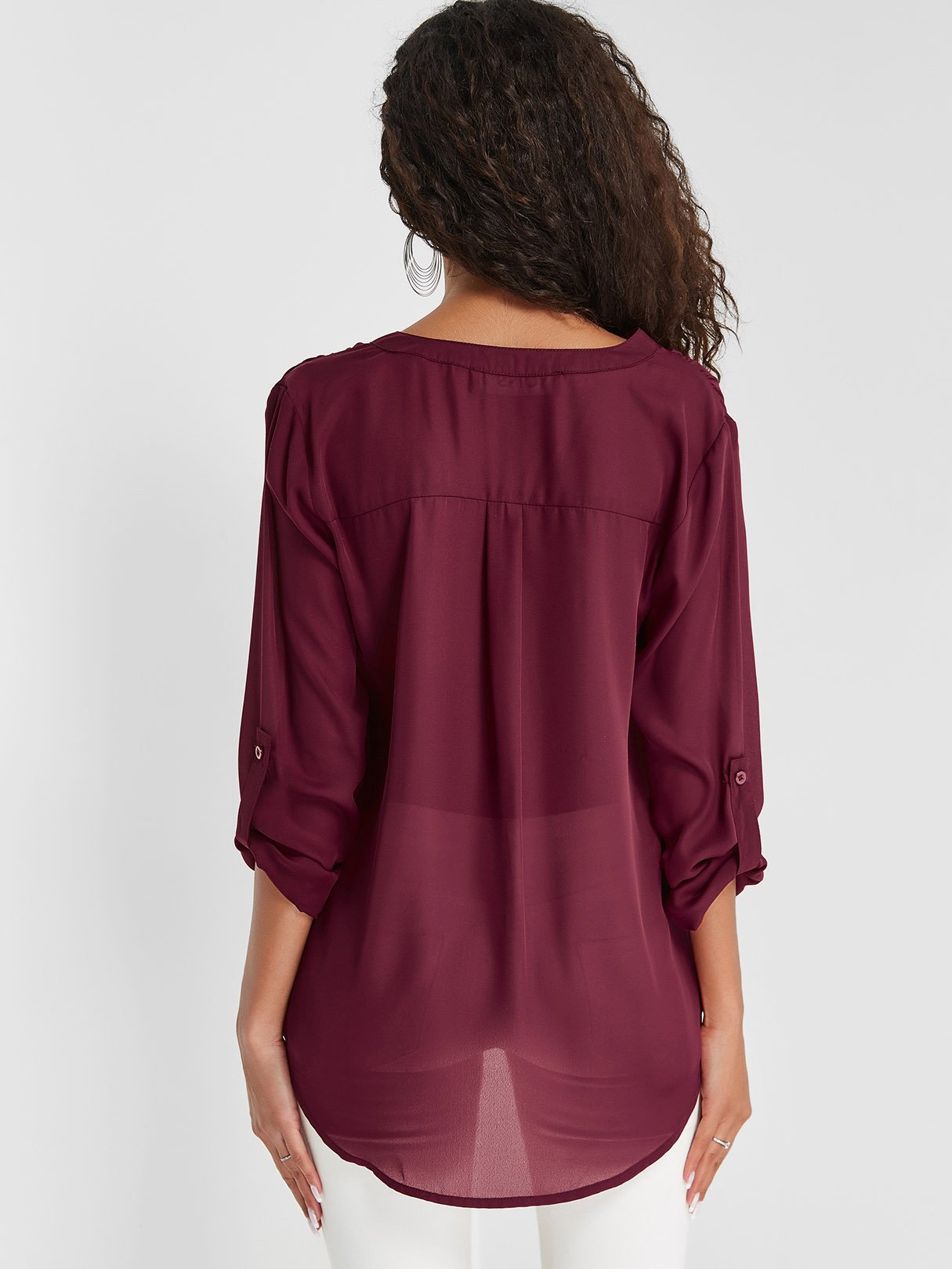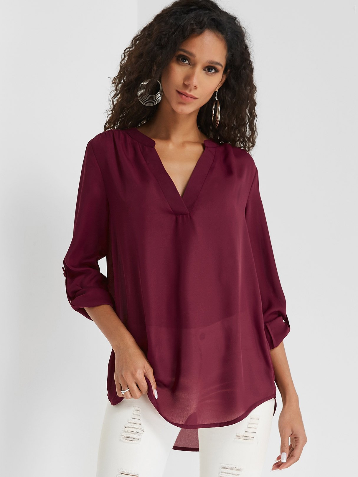 V-Neck 3/4 Sleeve Curved Hem Burgundy Blouses