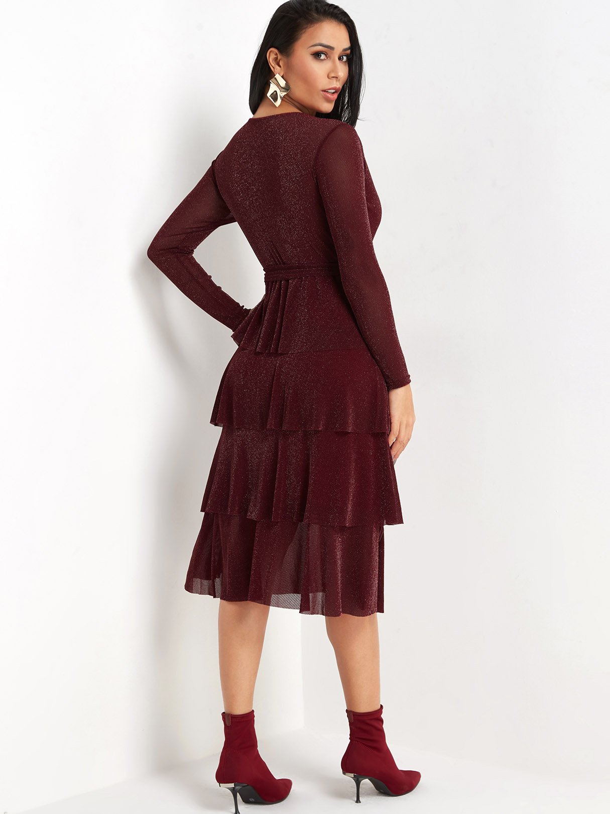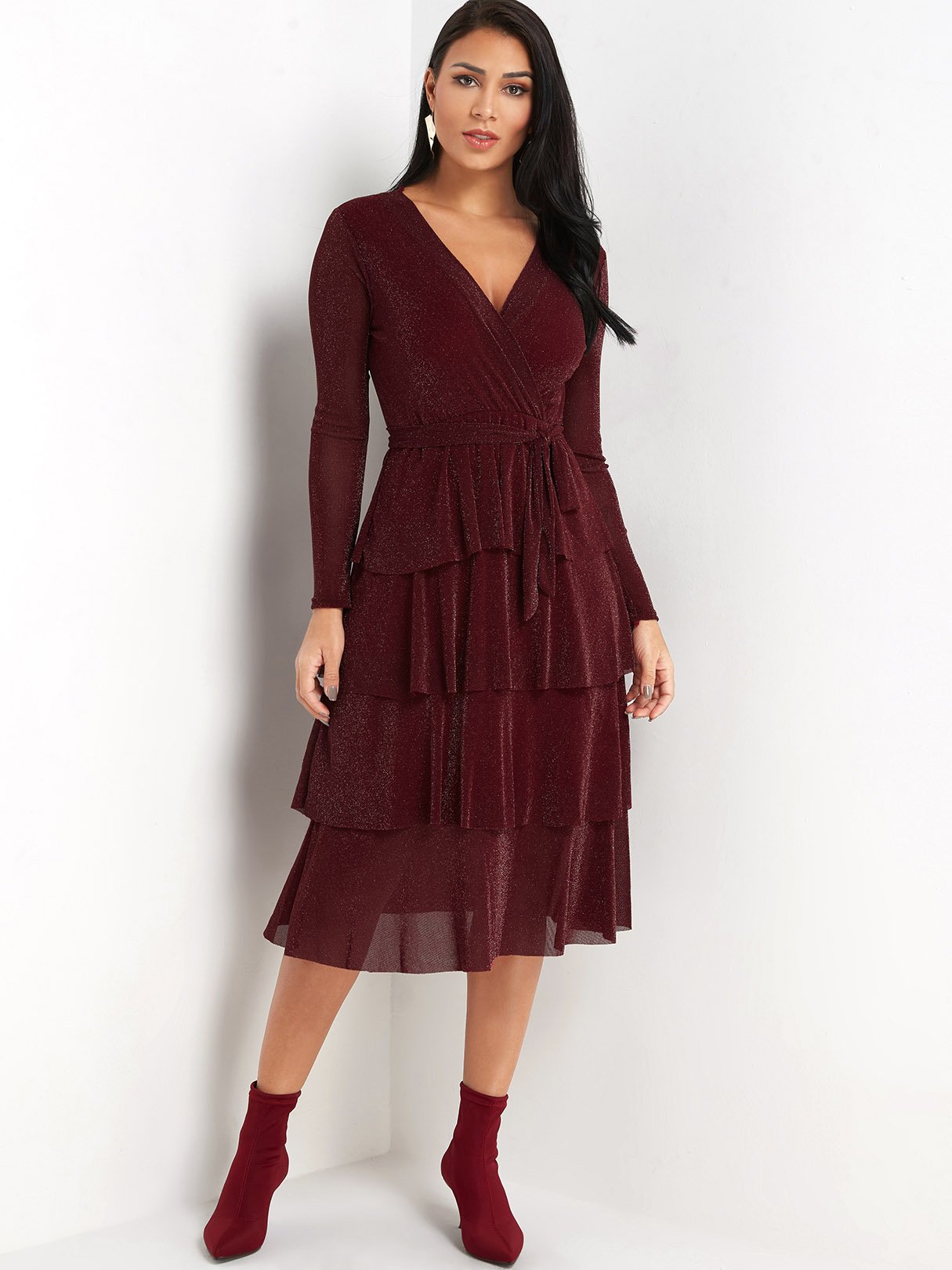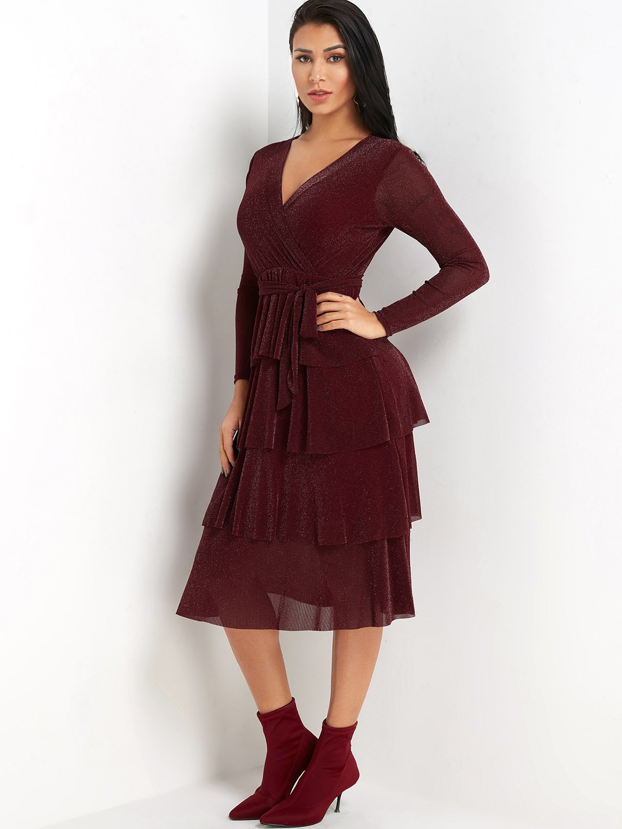 V-Neck Belt Wrap Long Sleeve Burgundy Sexy Dresses