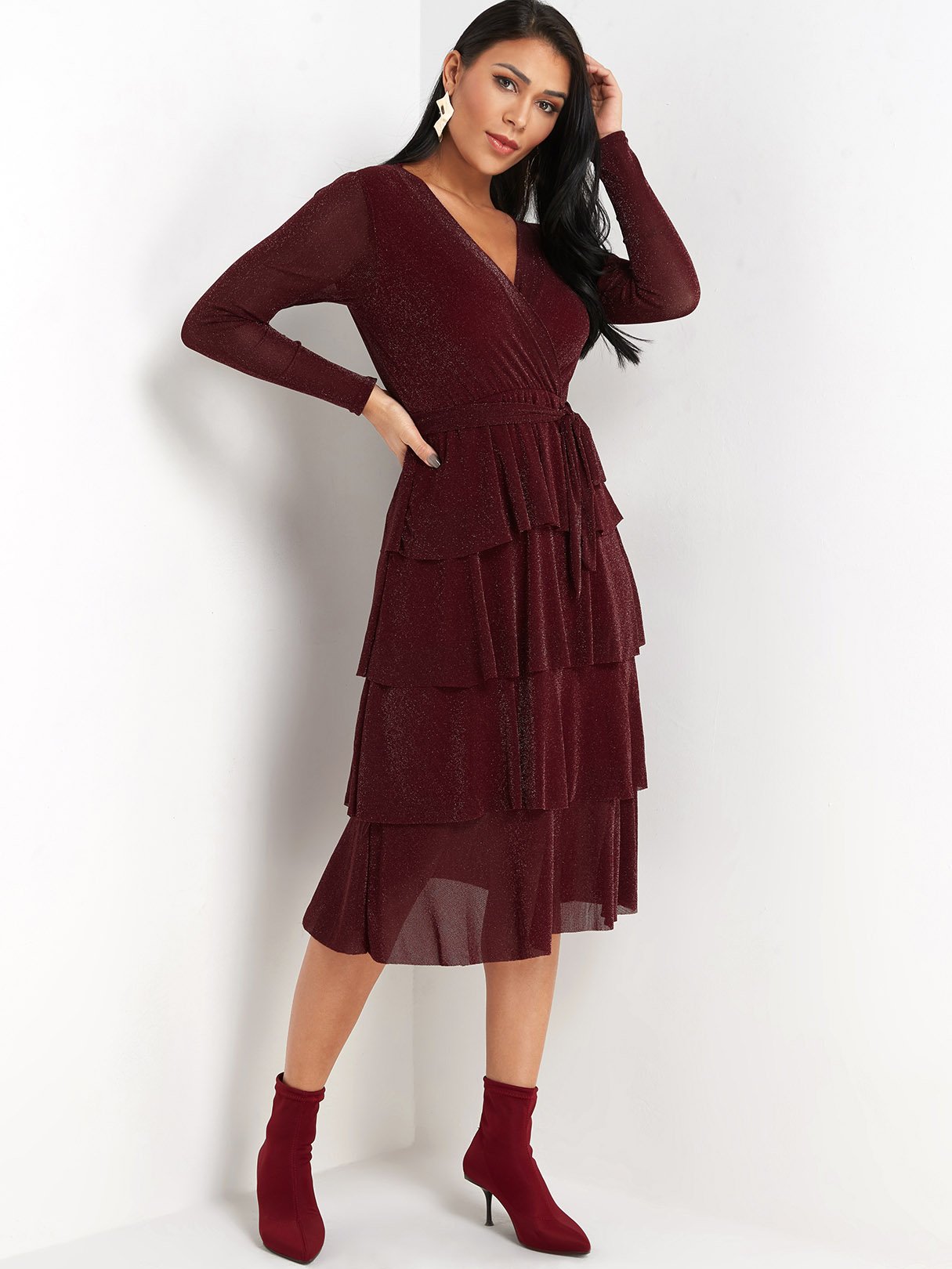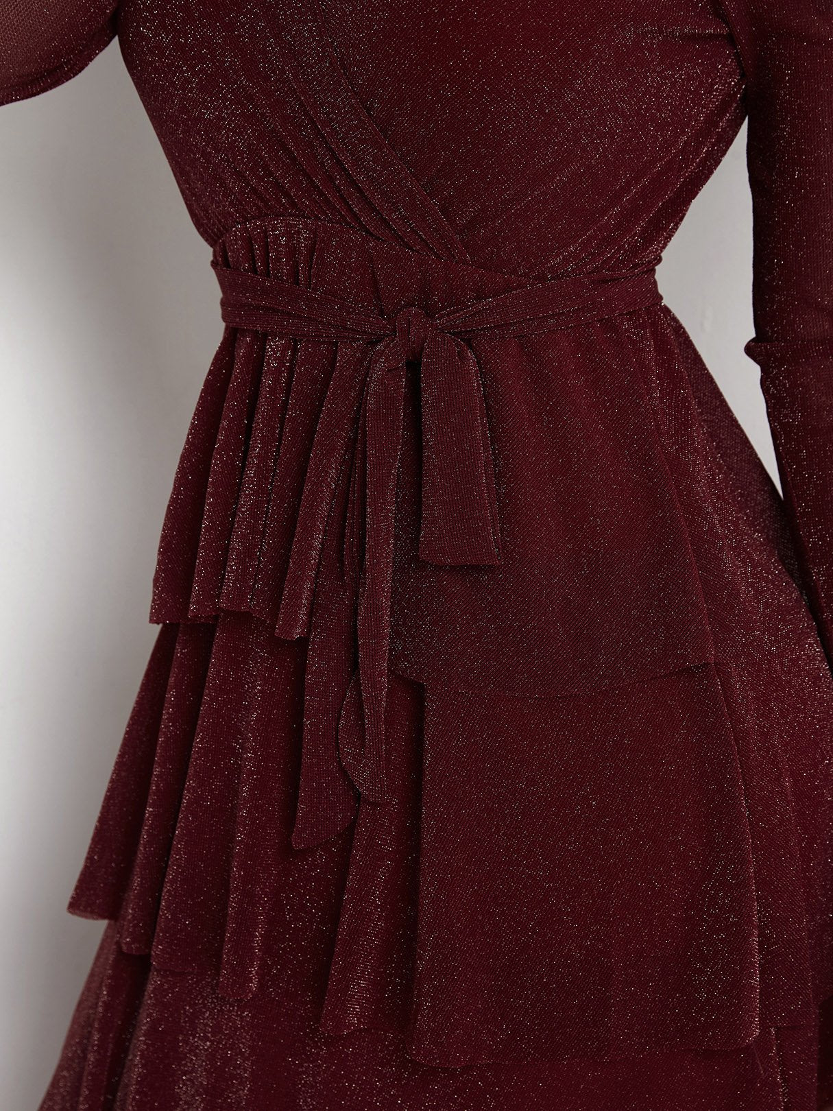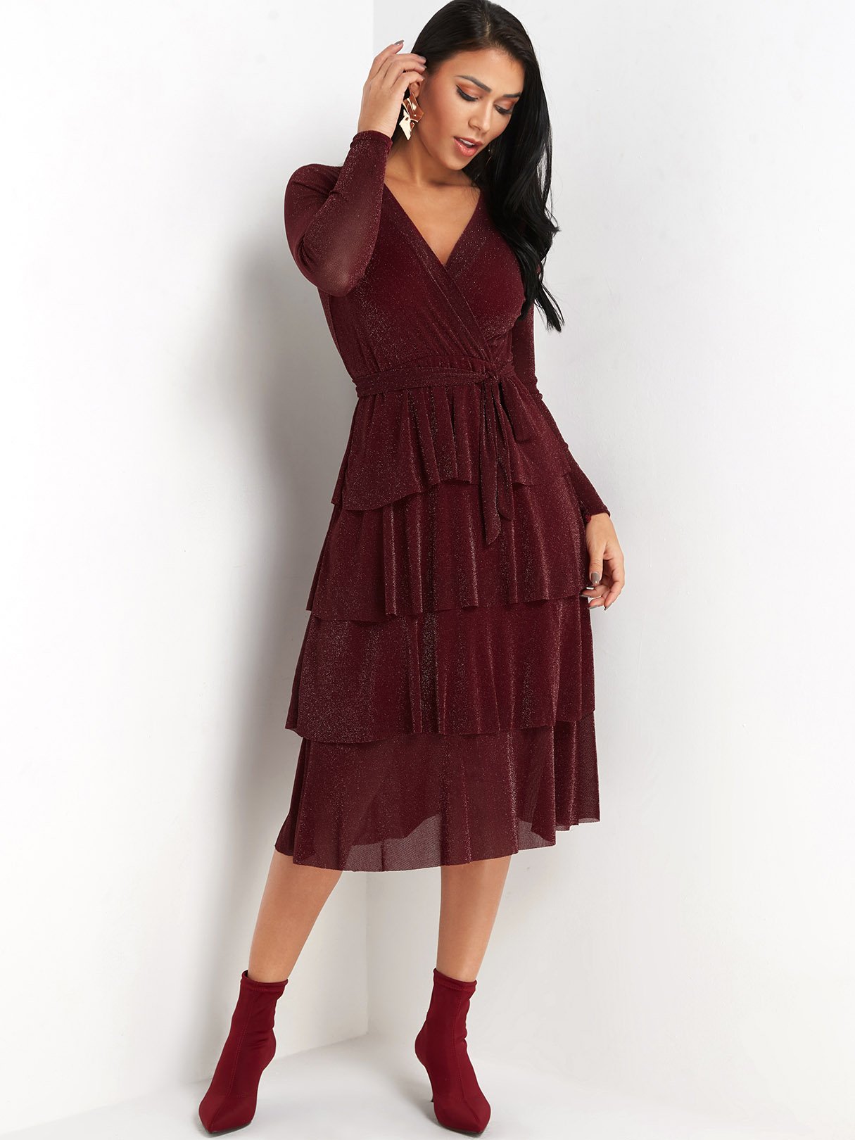 V-Neck Belt Wrap Long Sleeve Burgundy Sexy Dresses