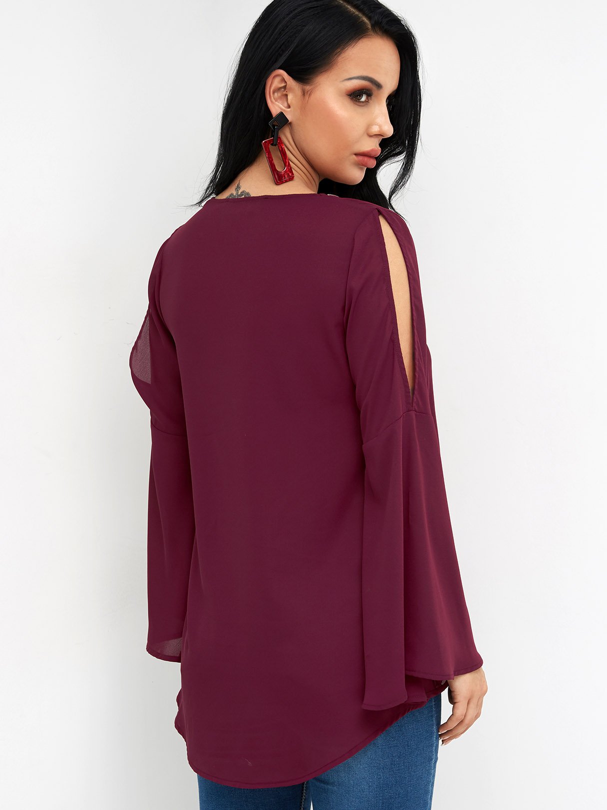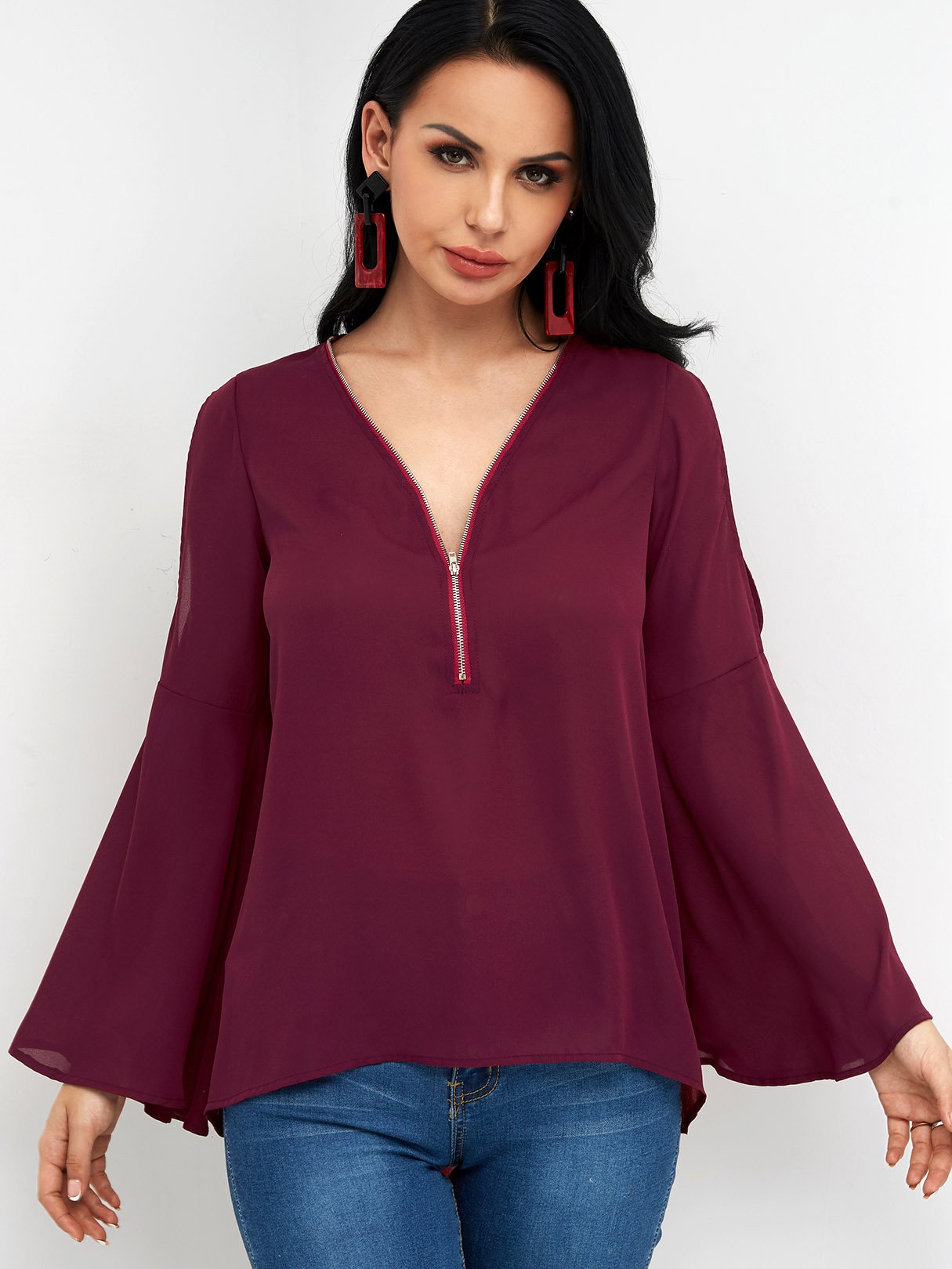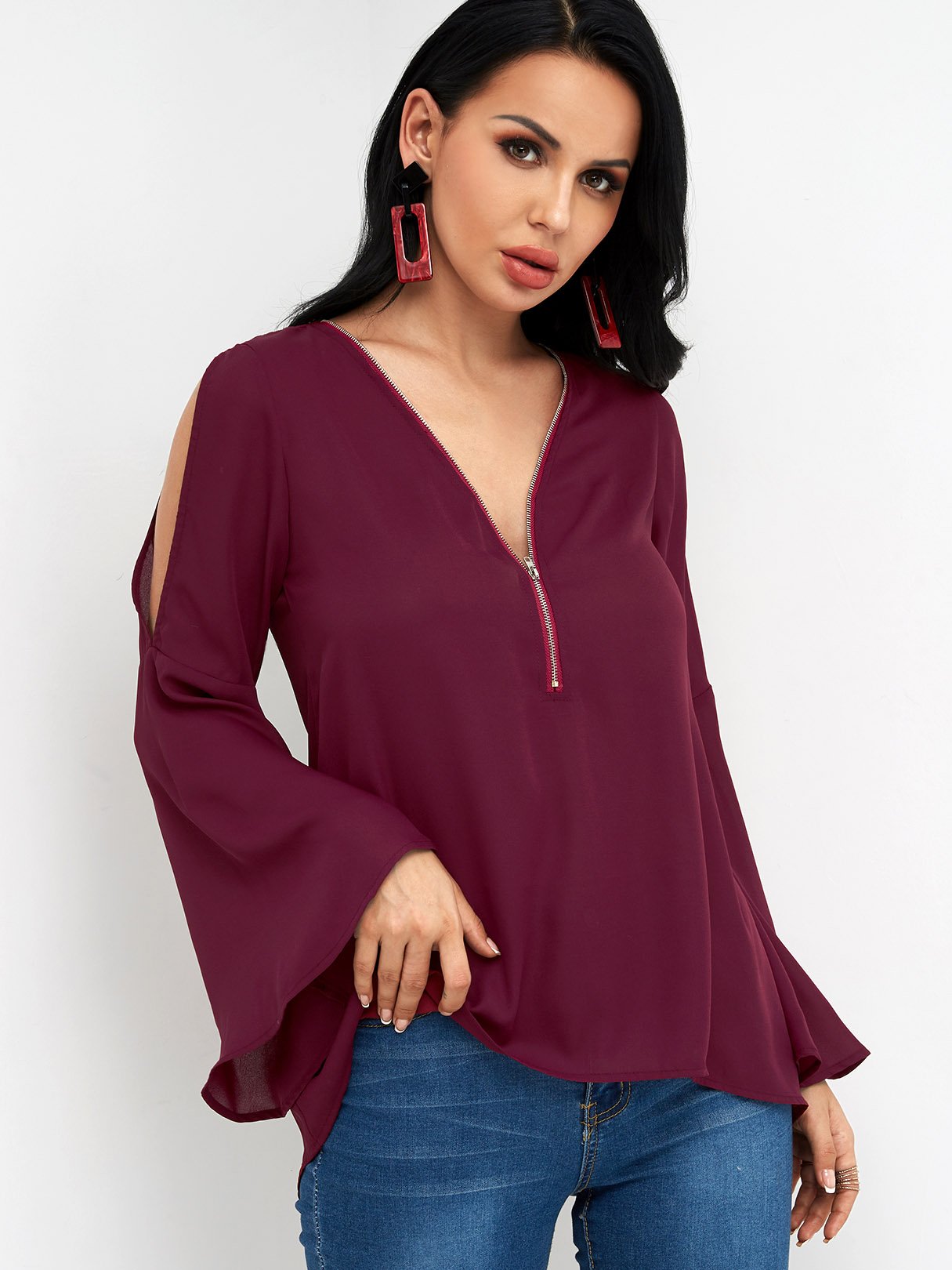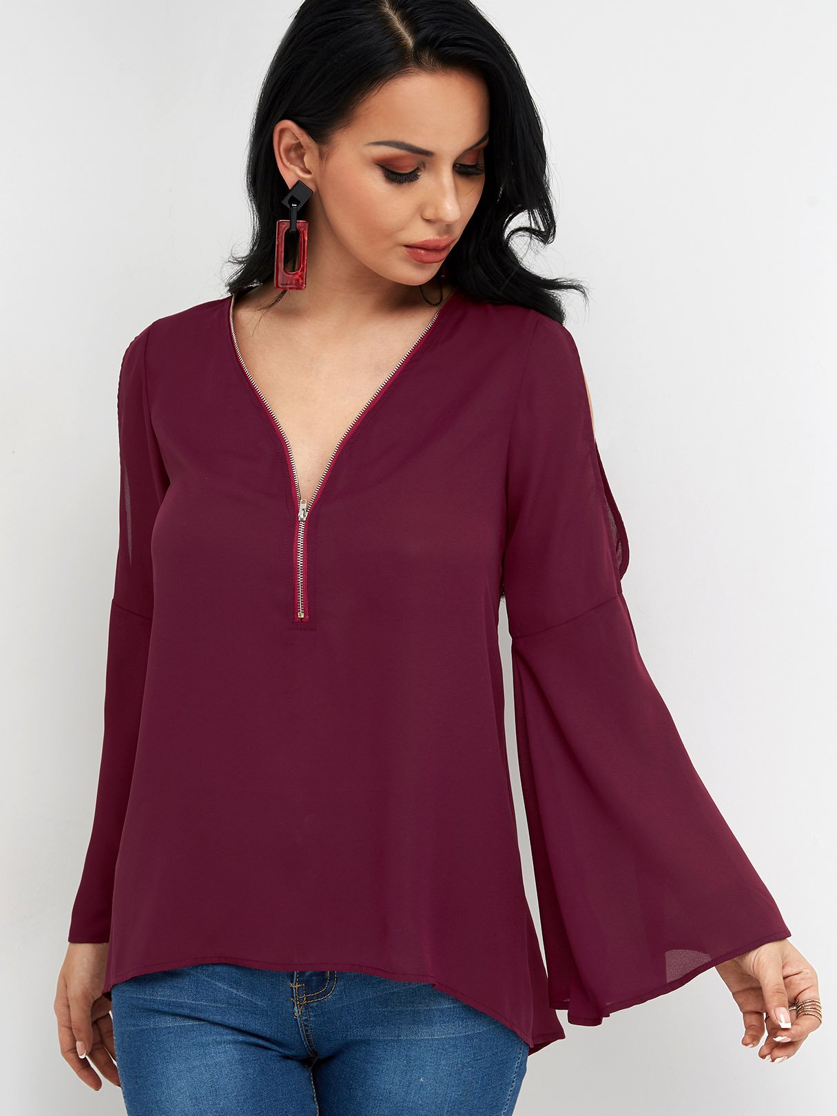 V-Neck Cold Shoulder Plain Zip Back Cut Out Long Sleeve Purple Blouses