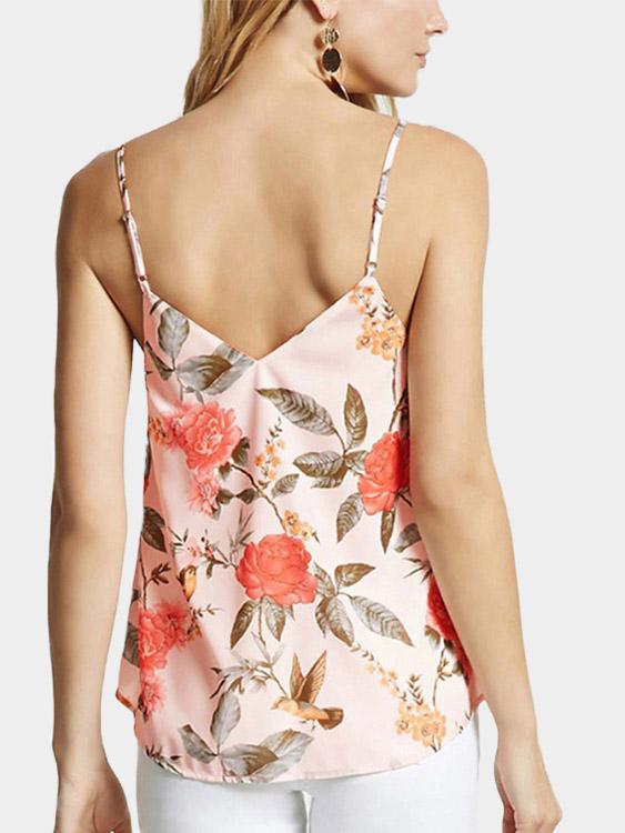 V-Neck Floral Print Backless Spaghetti Strap Sleeveless Curved Hem Camis