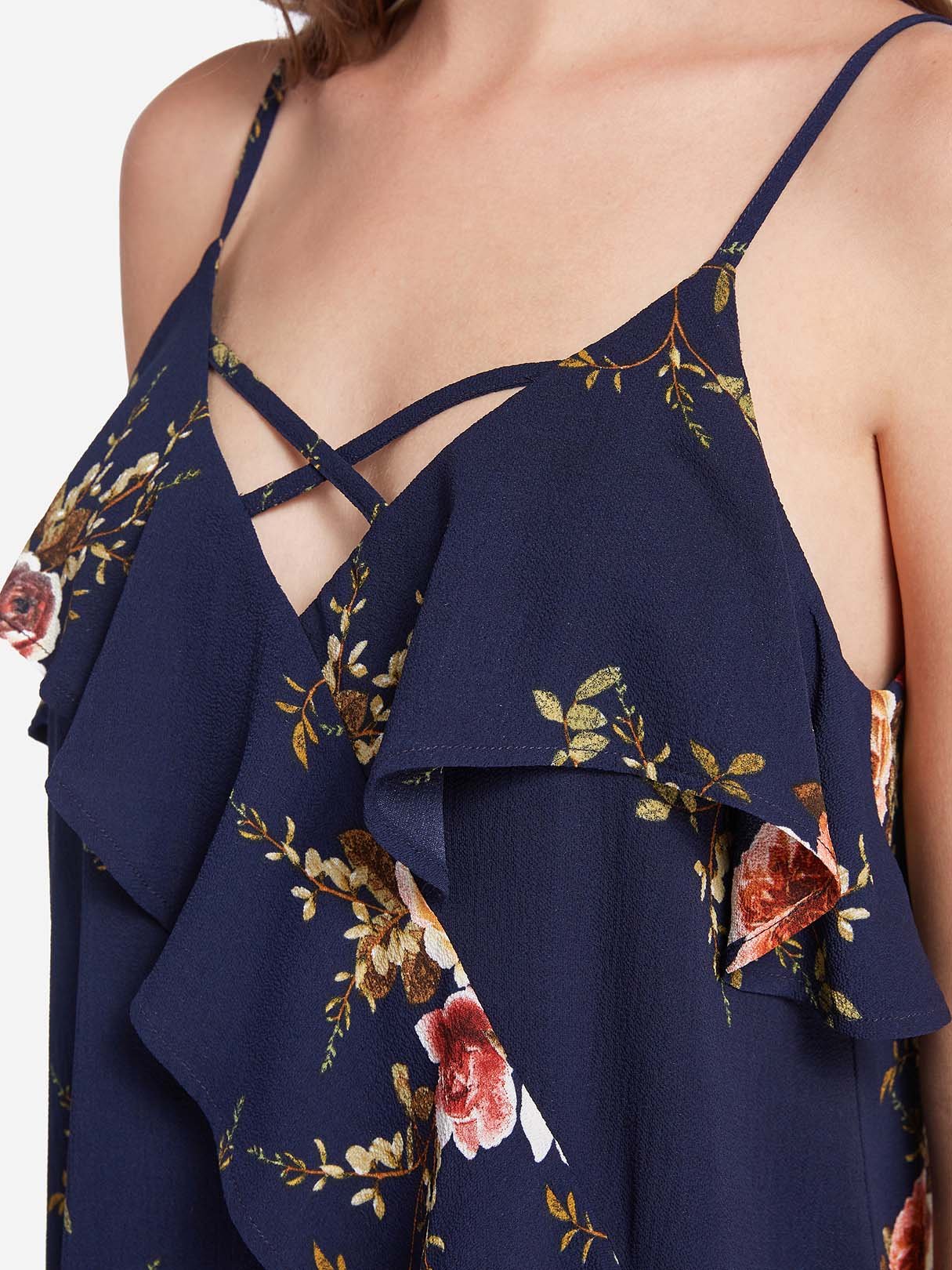 V-Neck Floral Print Crossed Front Backless Spaghetti Strap Sleeveless Flounced Hem Navy Camis