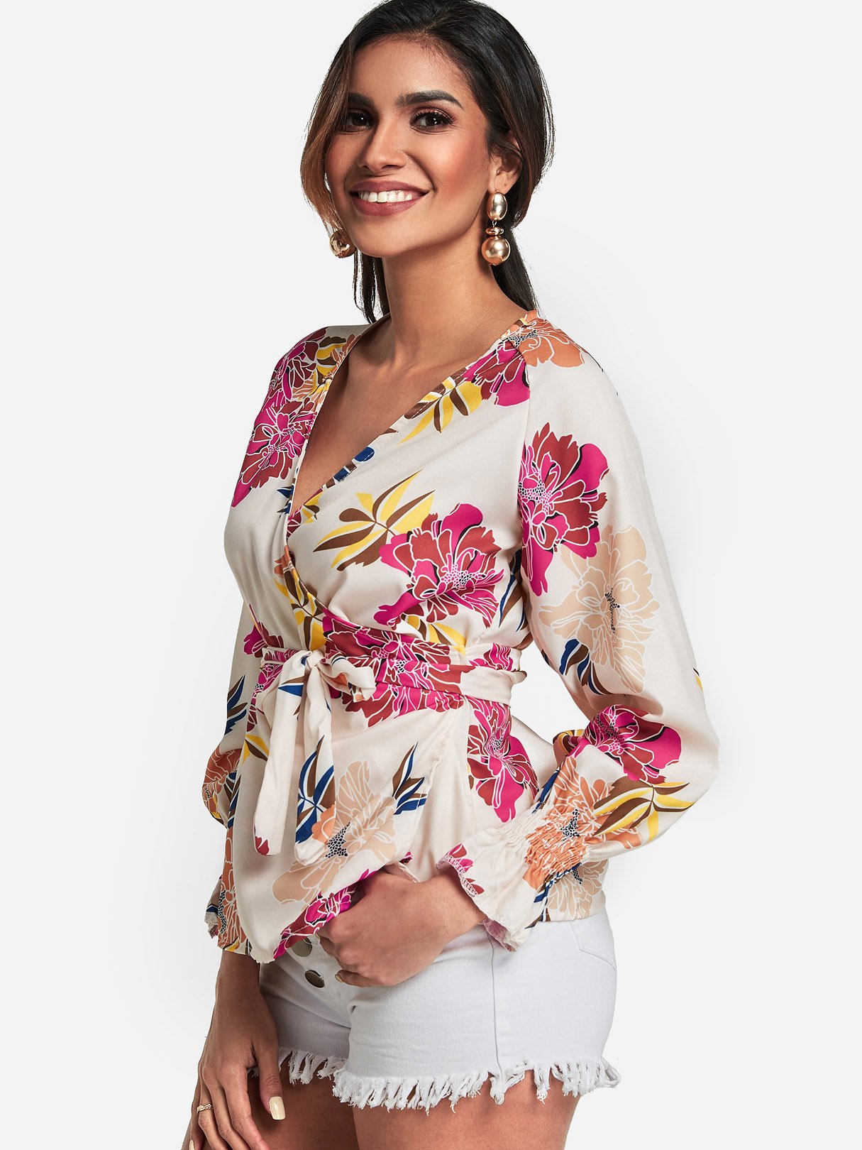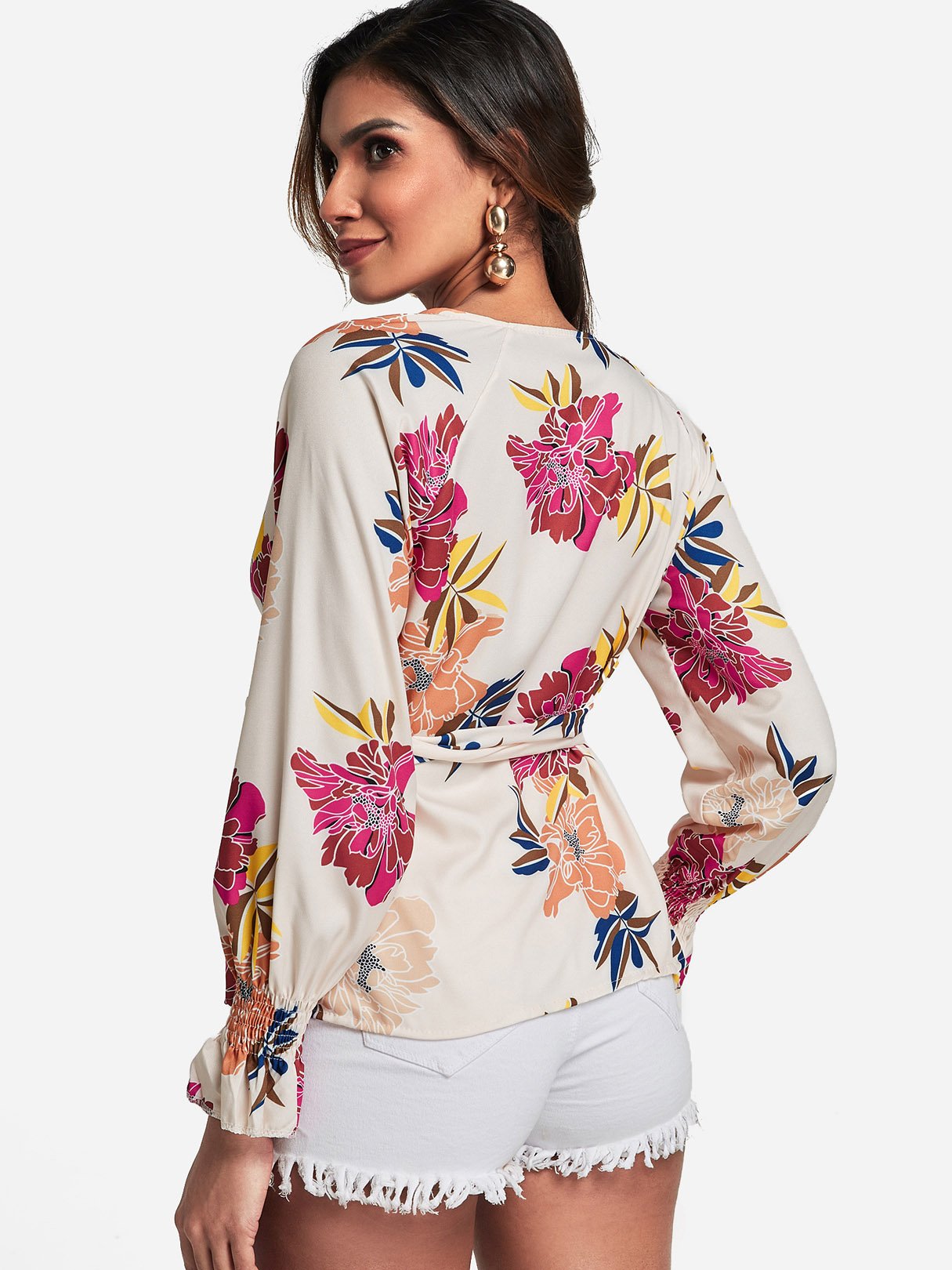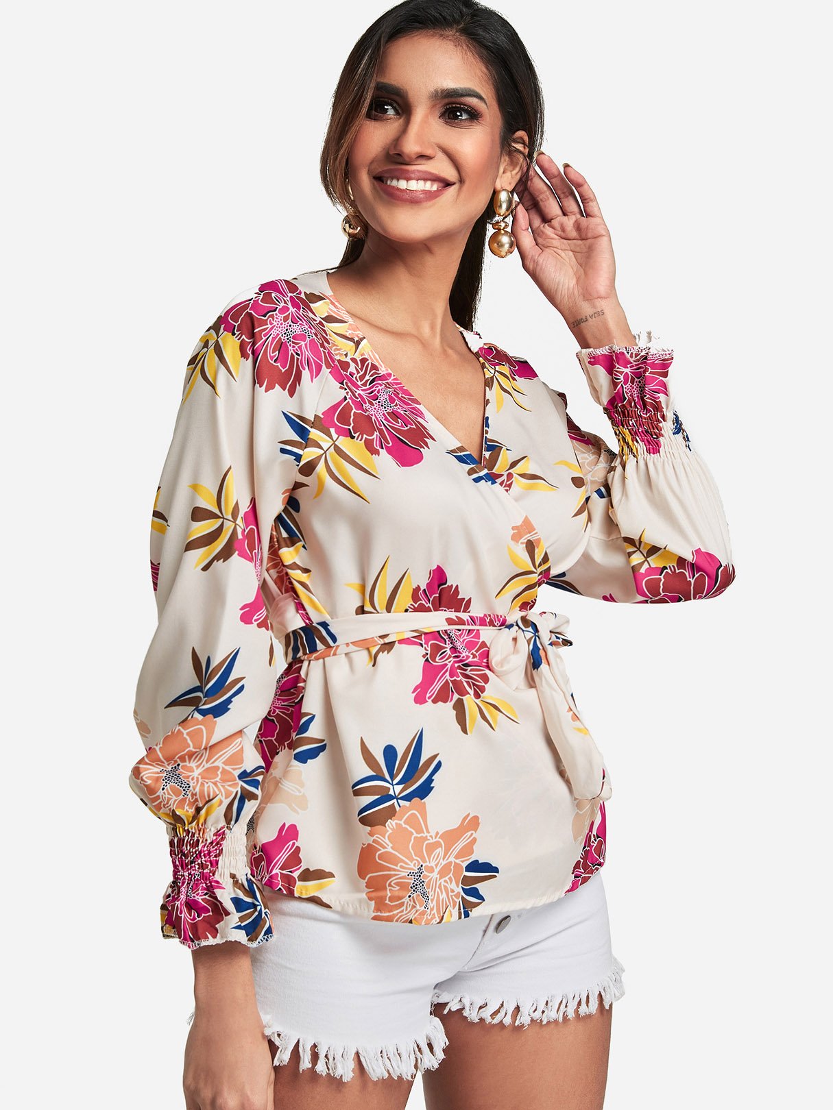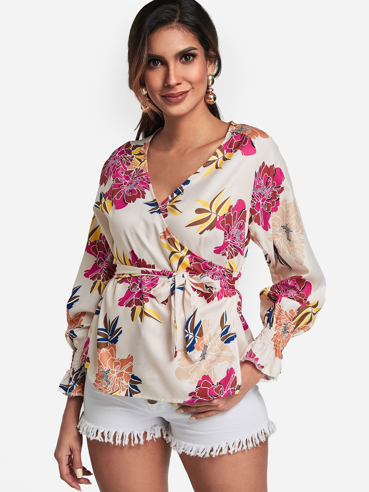 V-Neck Floral Print Crossed Front Self-Tie Long Sleeve Blouses