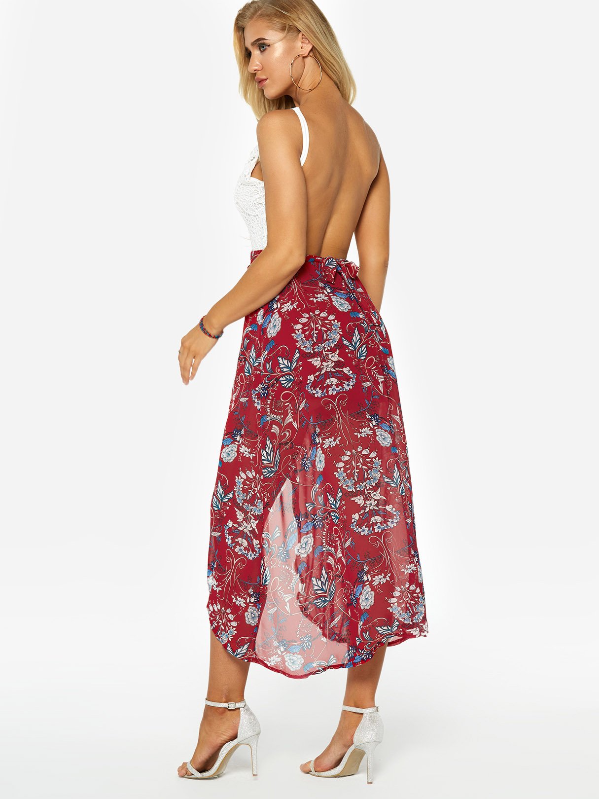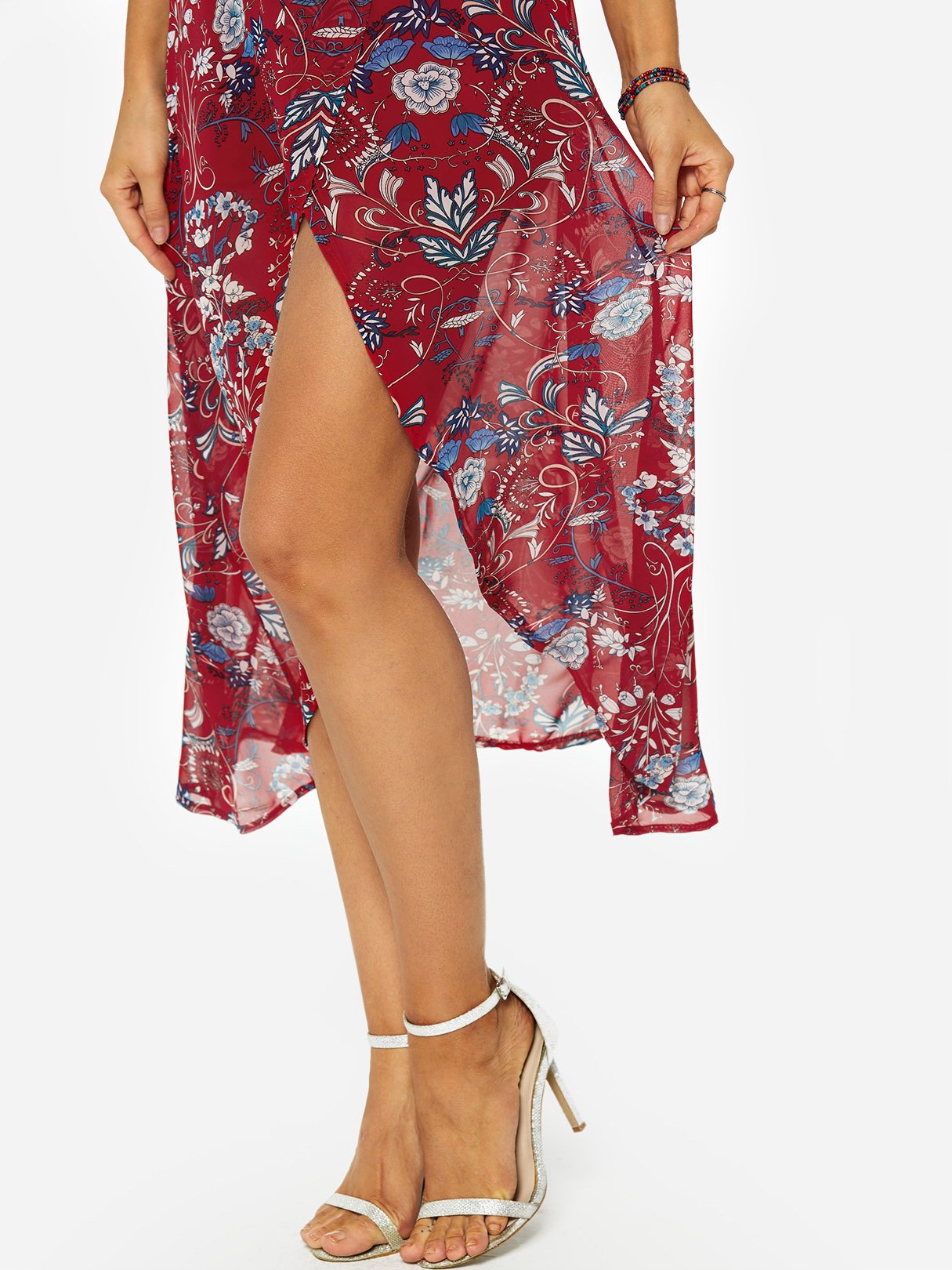 V-Neck Floral Print Lace Backless Sleeveless Slit Hem Burgundy Dresses