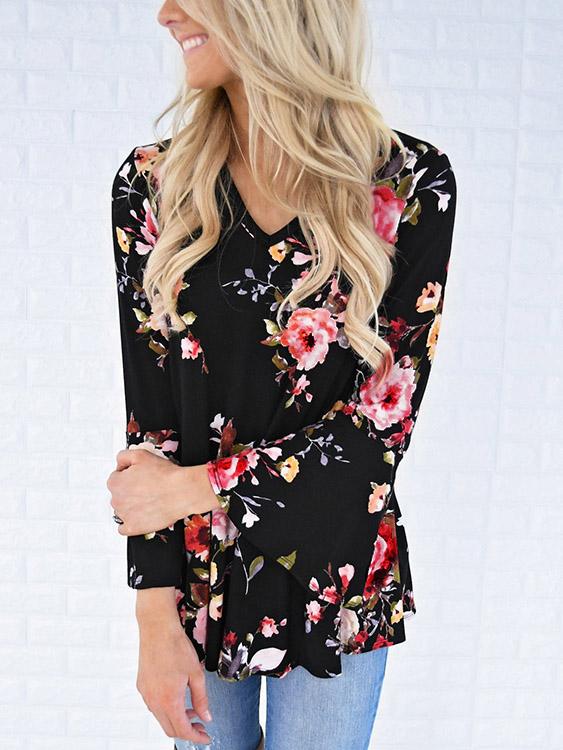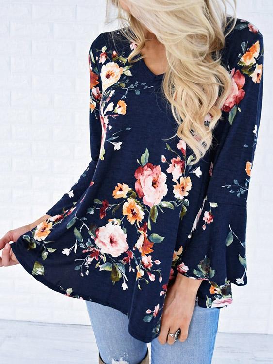 Material:PolyesterNeckline:V-NeckSeason:Spring,Summer,AutumnSleeves:Long SleevesPattern:Floral PrintStyle:Vacation StyleFit:Regular FitSleeves Type:Bell Sleeves