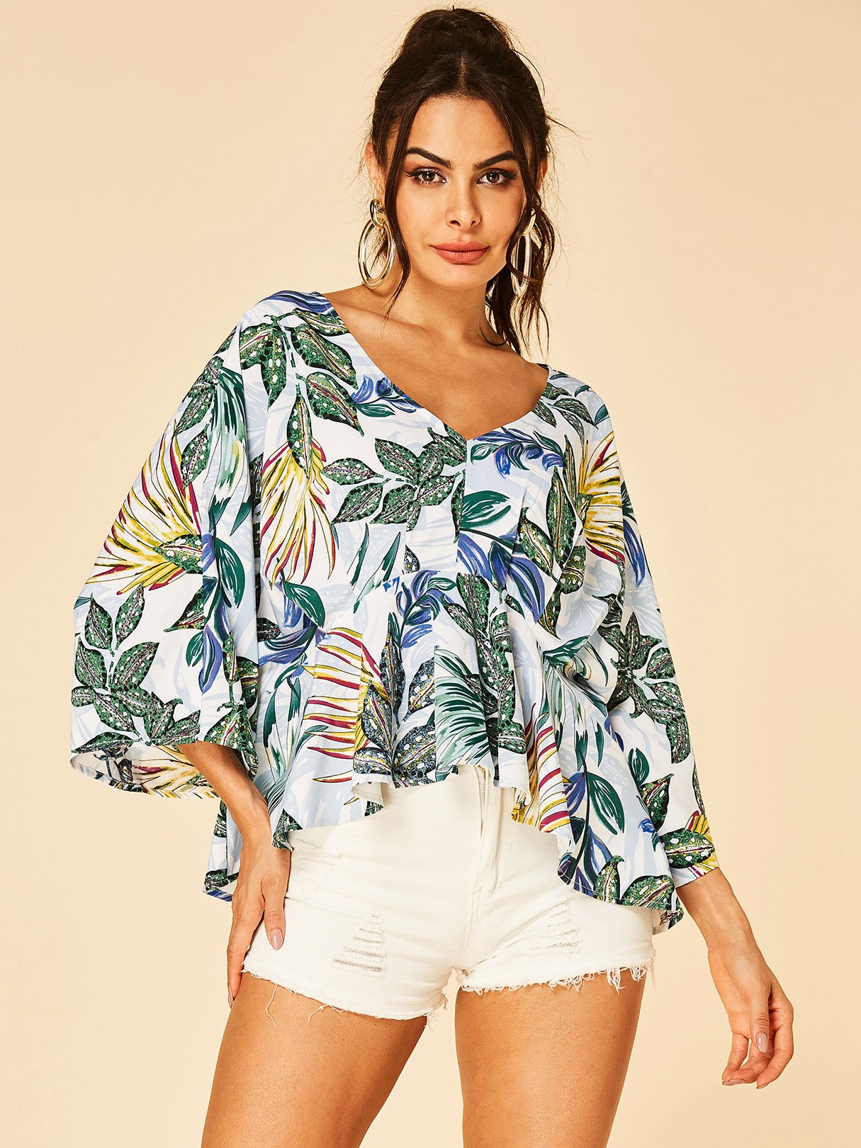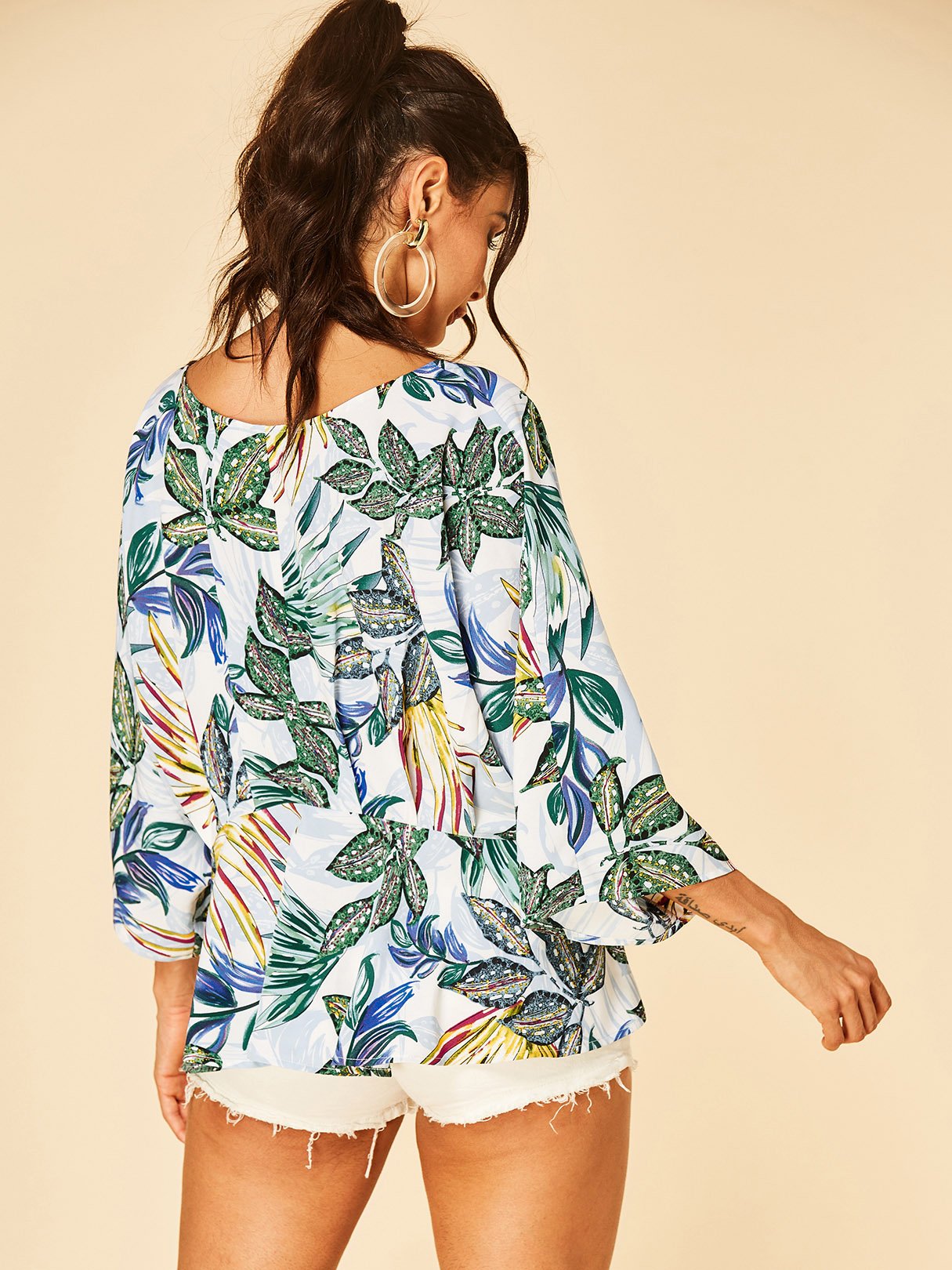 V-Neck Floral Print Long Sleeve White Blouse