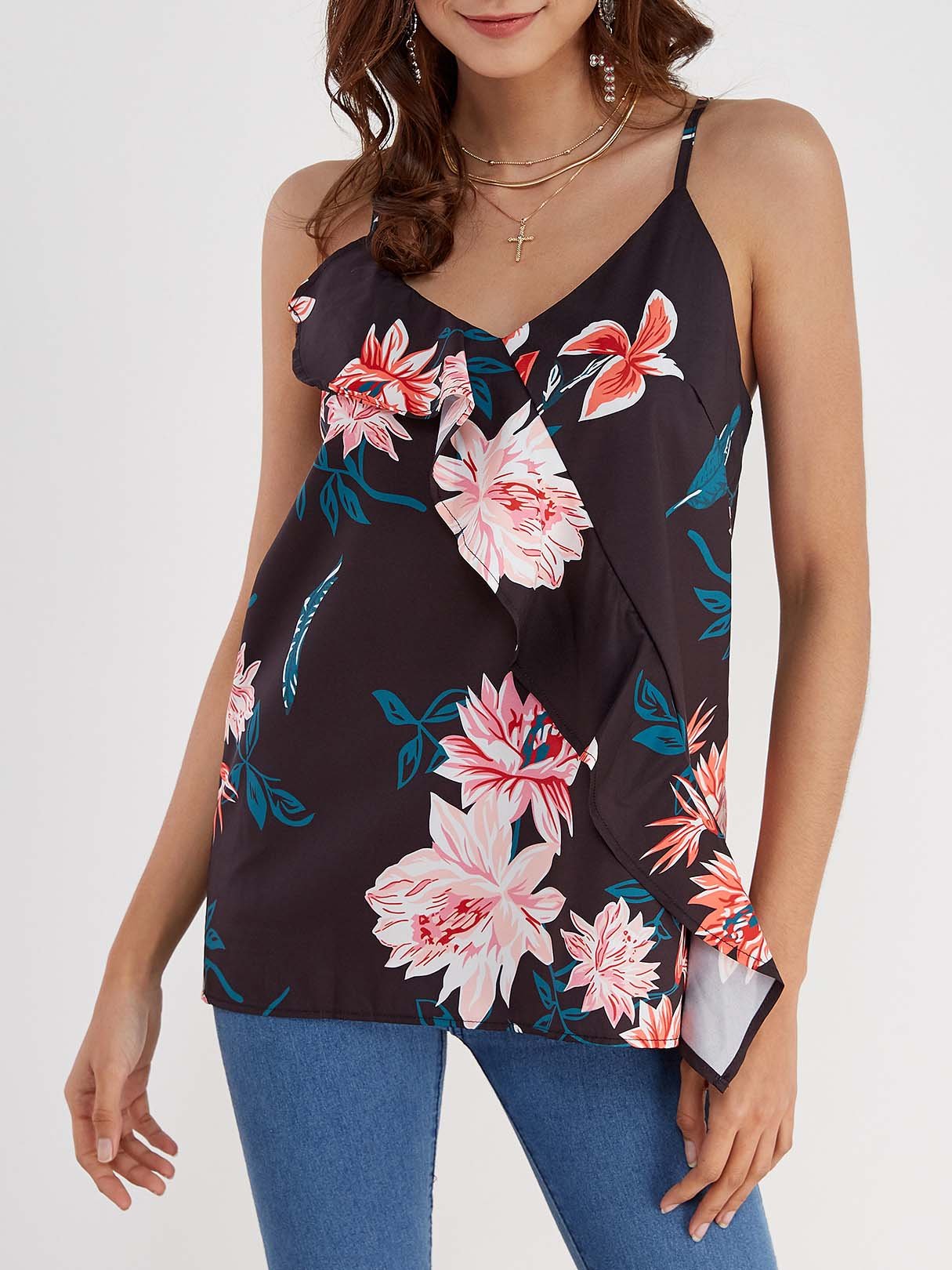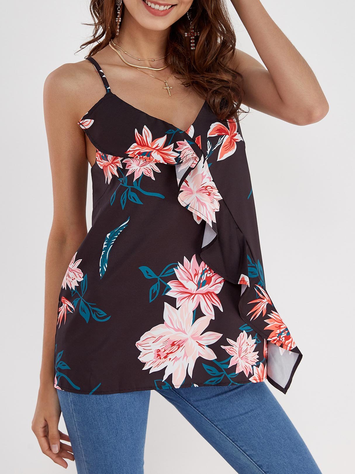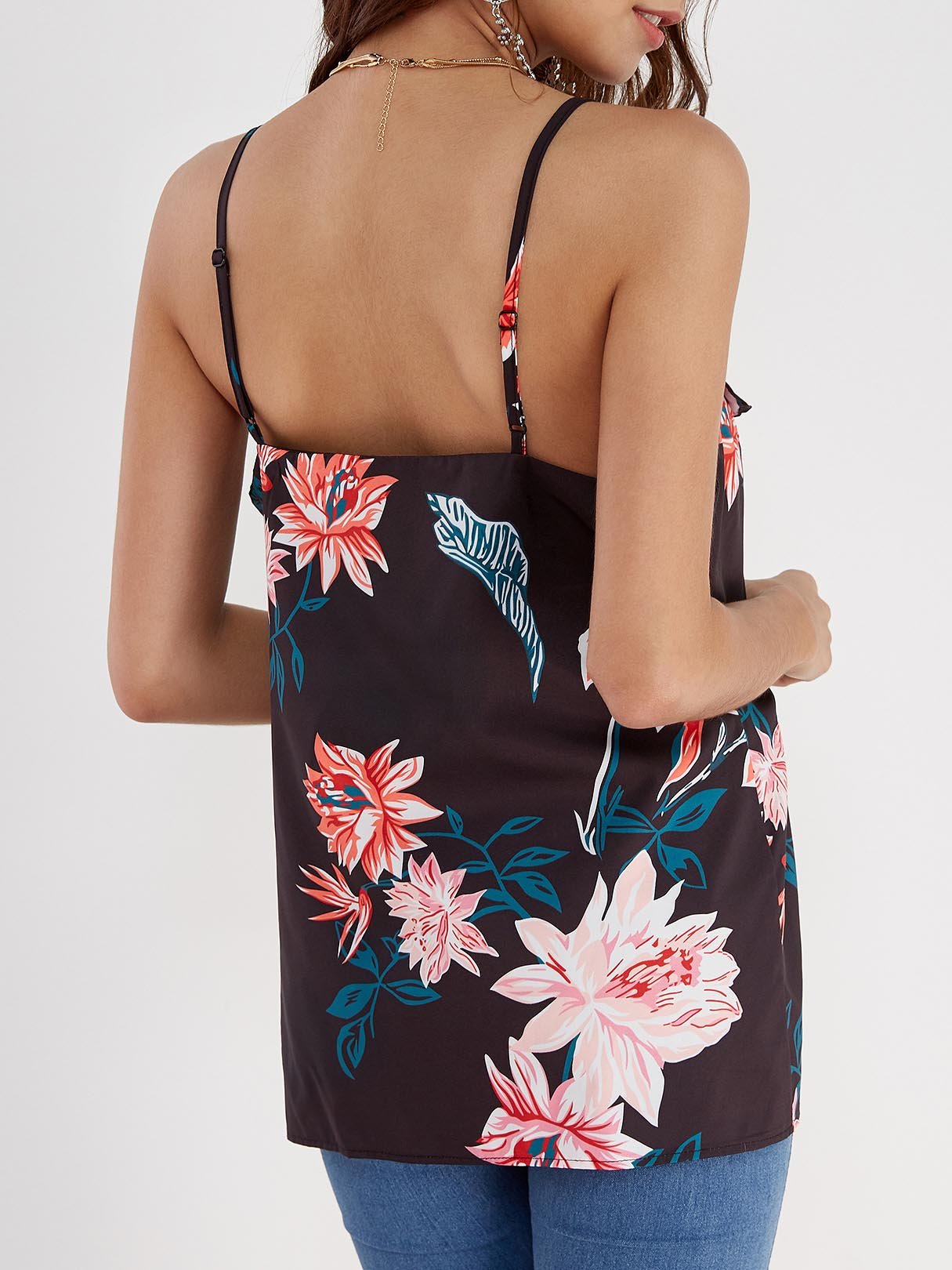 Material:Polyester,SpandexNeckline:V-NeckSeason:Summer,AutumnSleeves:SleevelessPattern:Floral PrintStyle:Casual Style,Vacation StyleDetail:Adjustable Shoulder StrapsType:Camis &Amp; VestsFit:Loose Fit