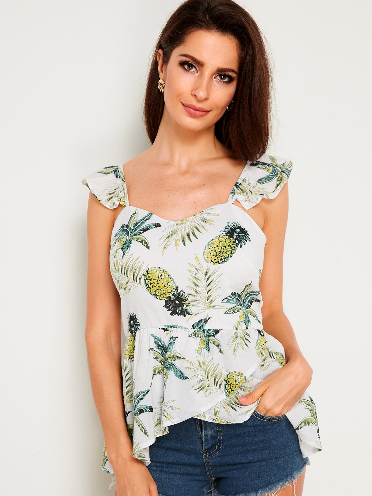 V-Neck Floral Print Zip Back Backless Sleeveless Ruffle Hem Tank Top