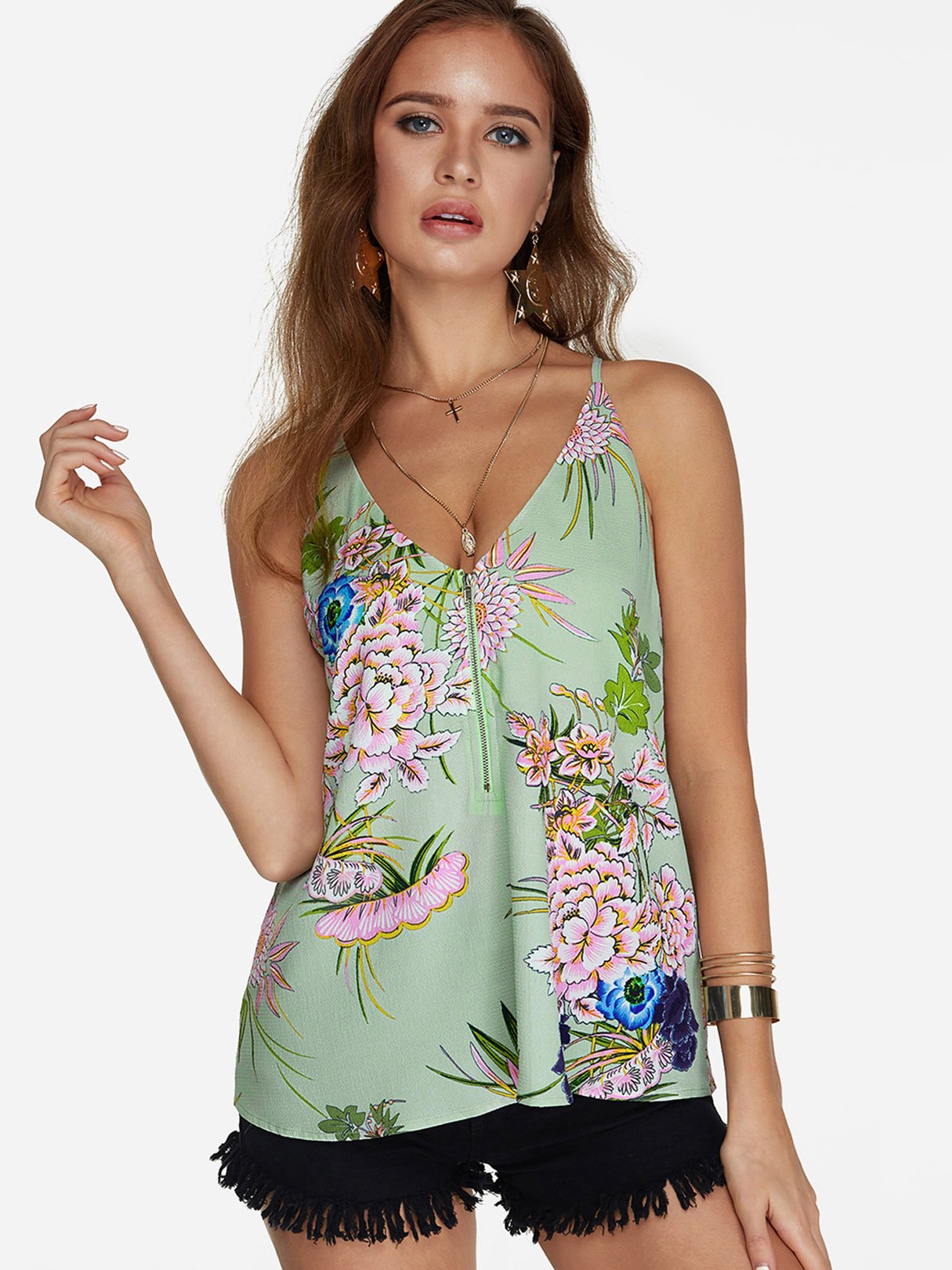 V-Neck Floral Print Zip Back Sleeveless Green Camis