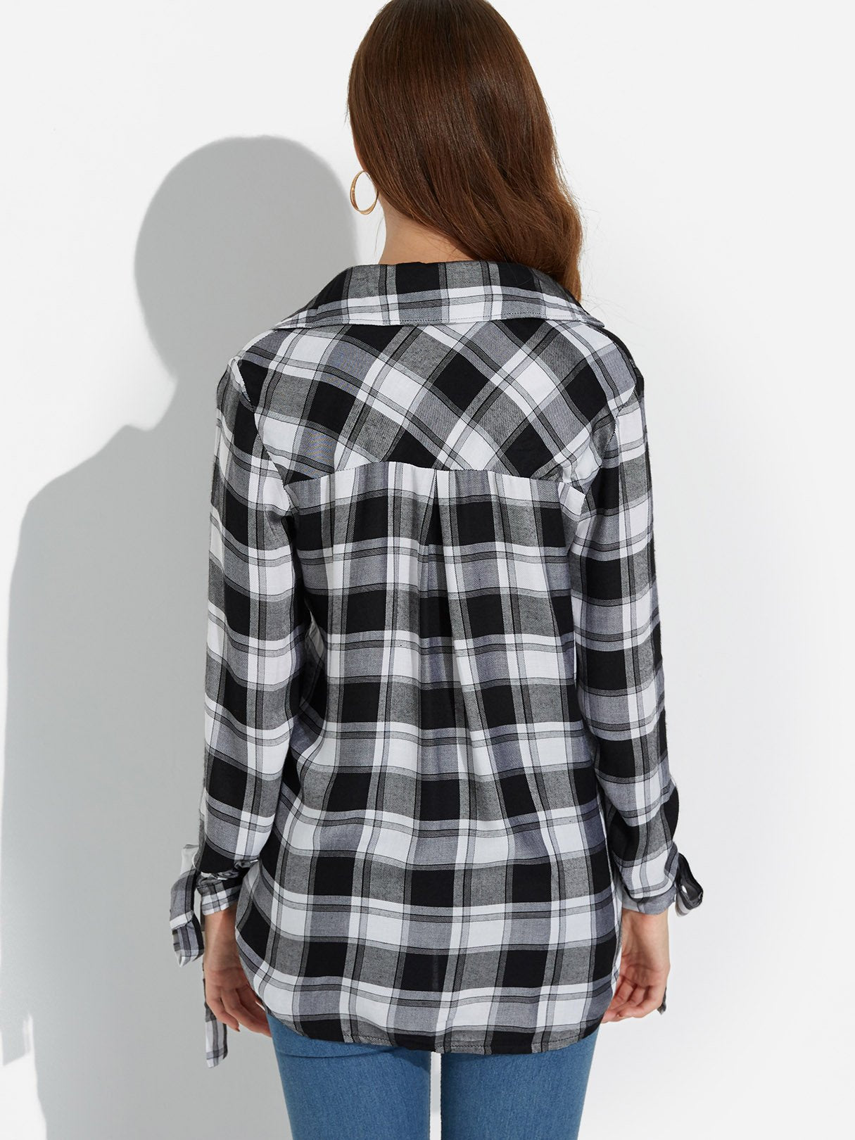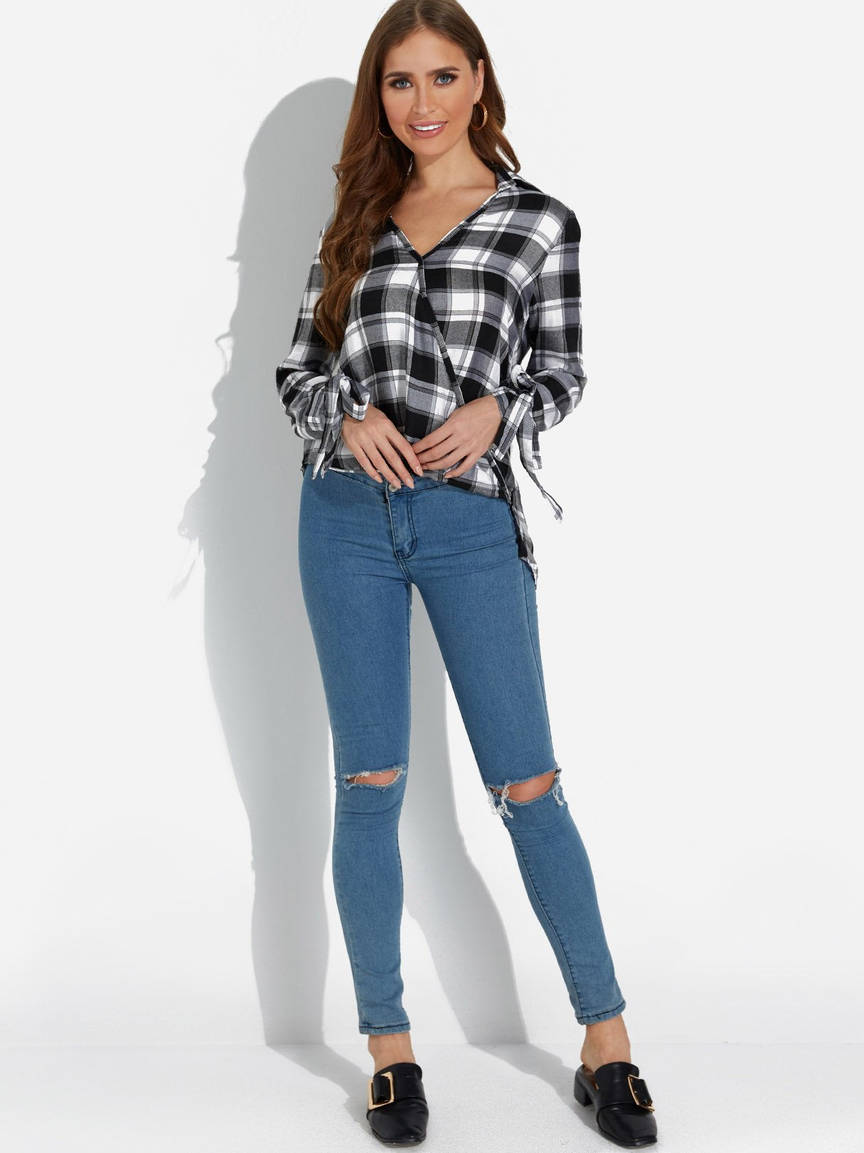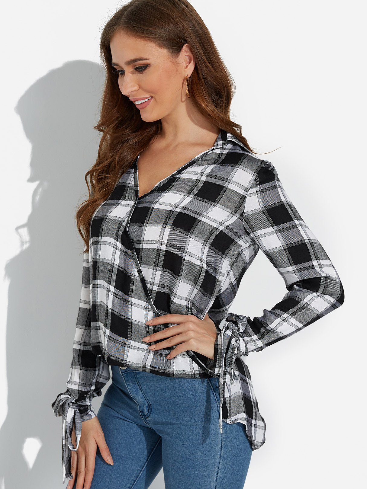 V-Neck Grid Crossed Front Long Sleeve Curved Hem Black Blouses