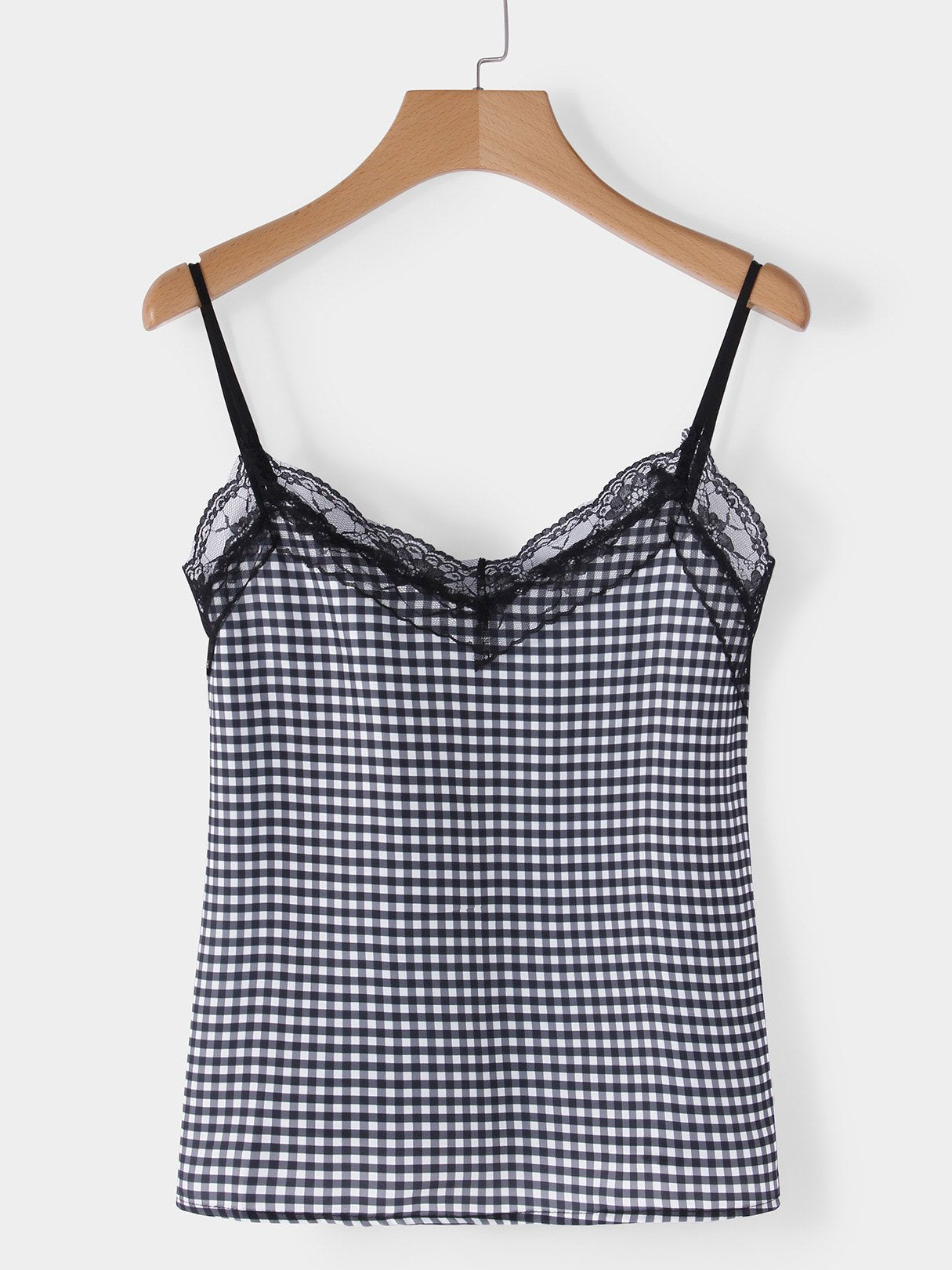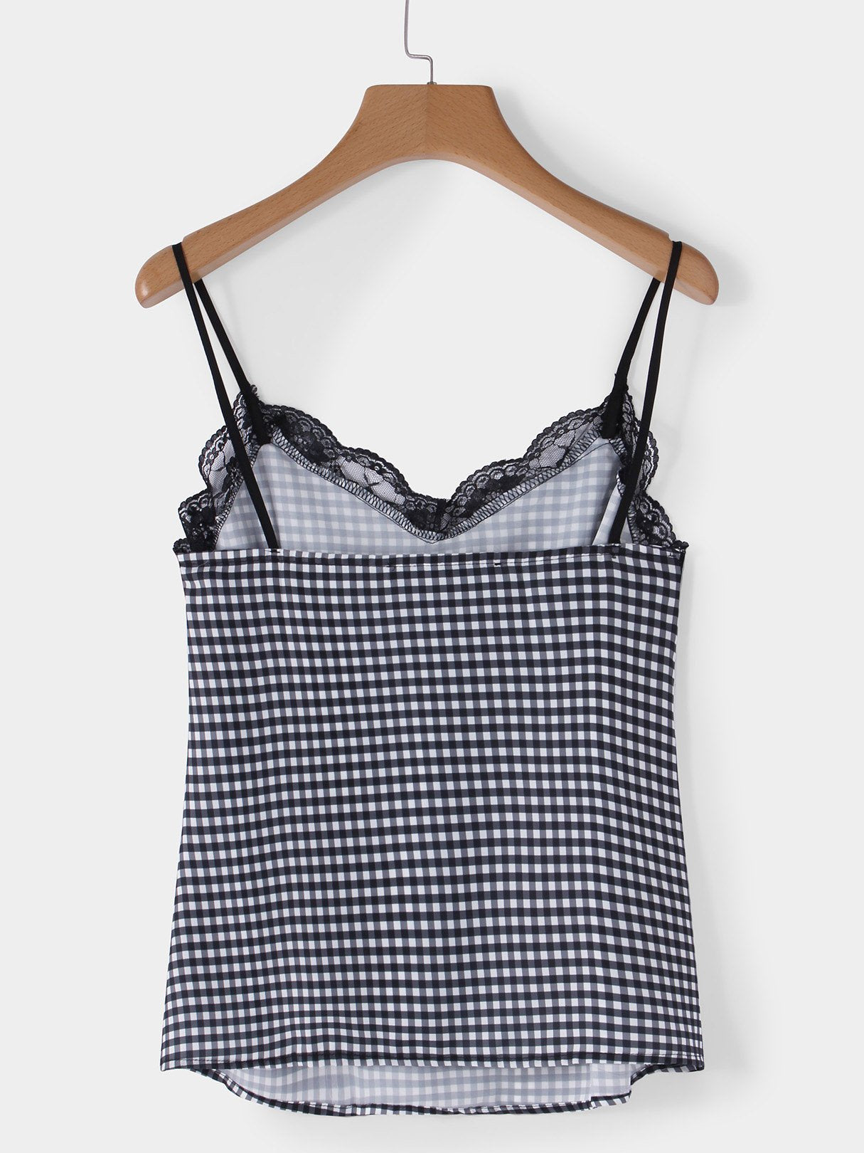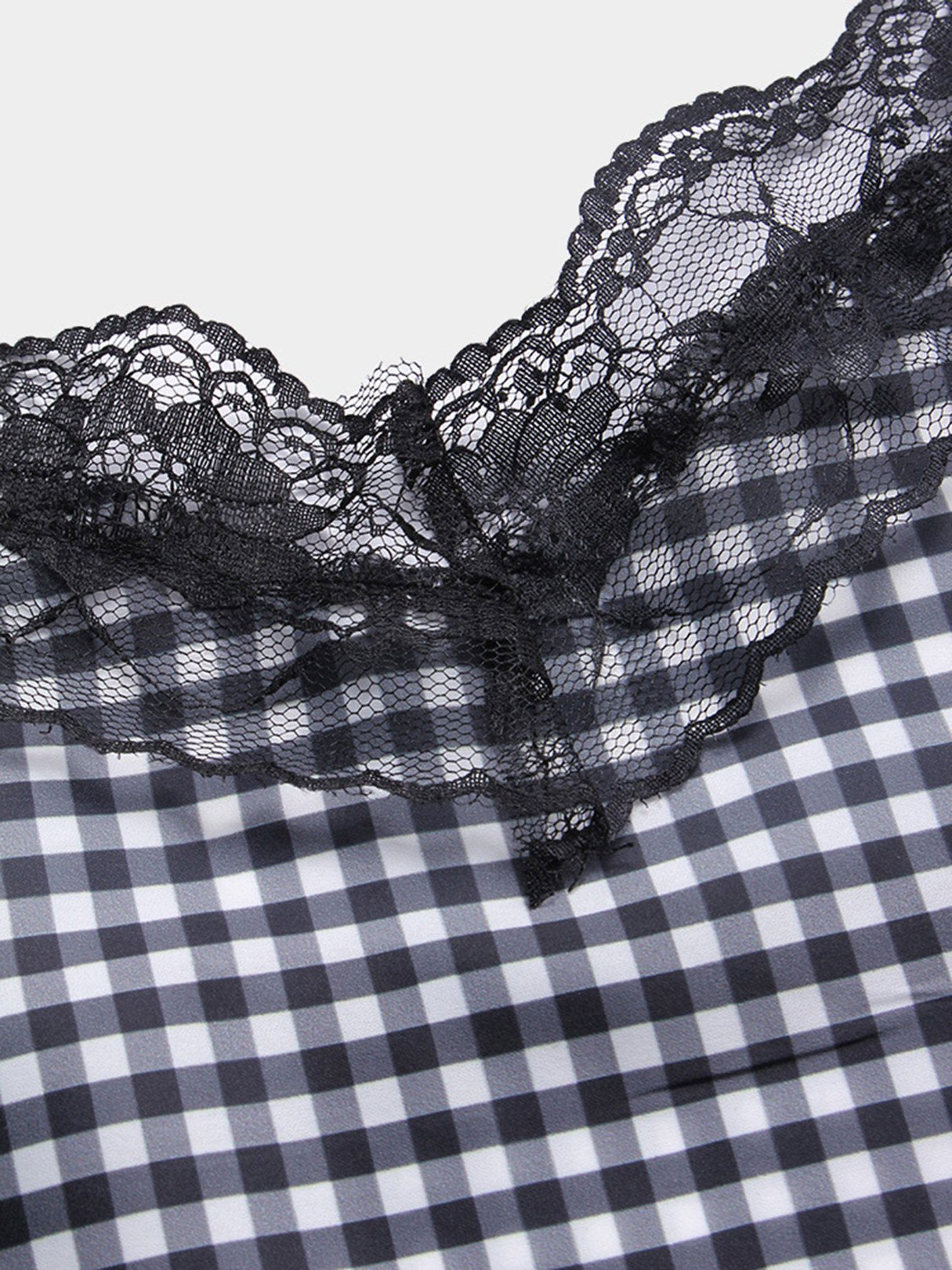 V-Neck Grid Lace Backless Spaghetti Strap Sleeveless Curved Hem Black Camis