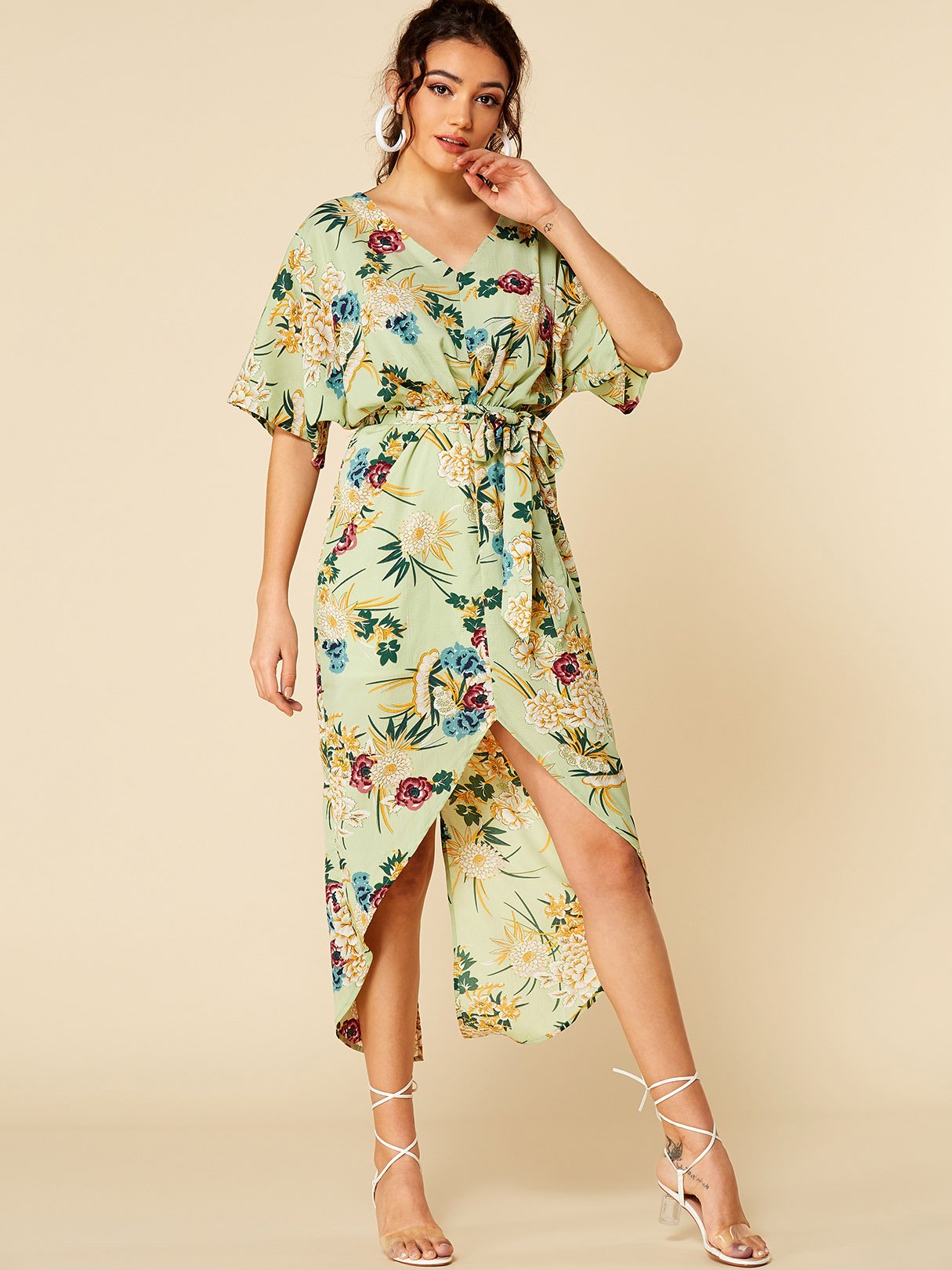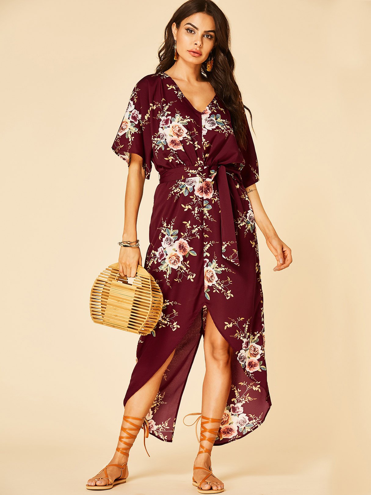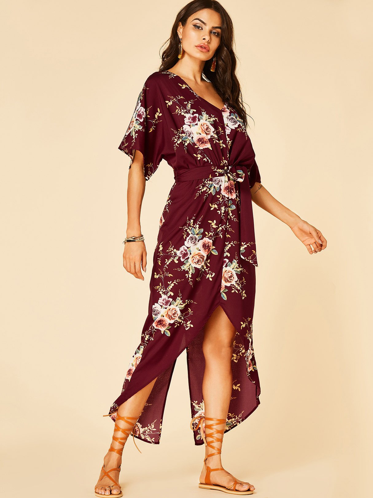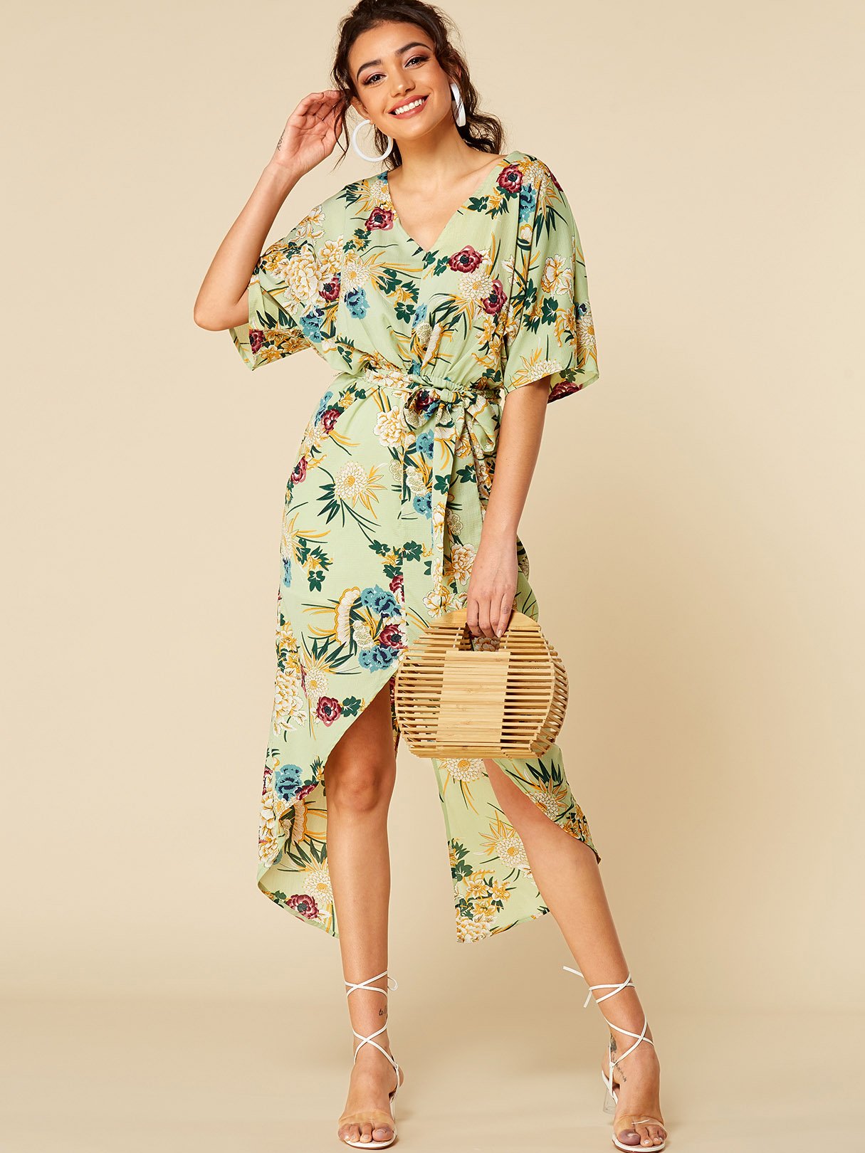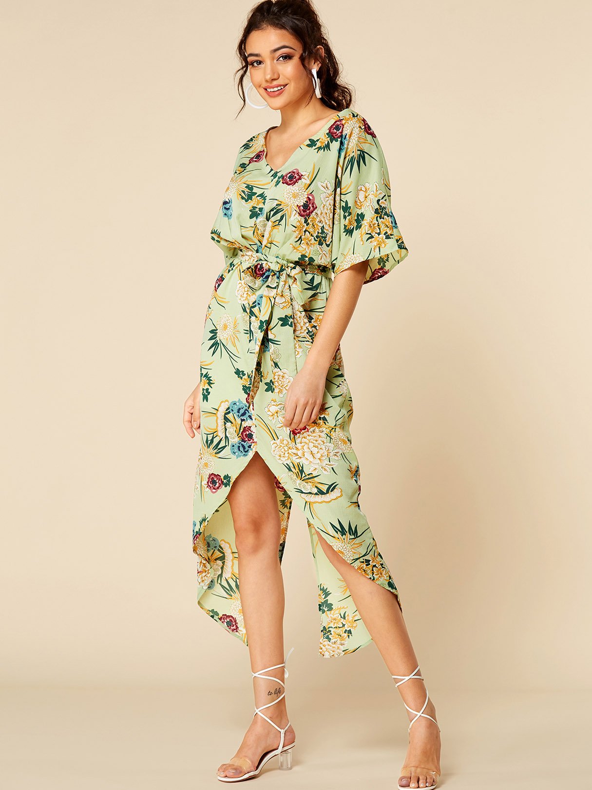 V-Neck Half Sleeve Floral Print Pleated Slit Self-Tie High-Low Hem Dresses