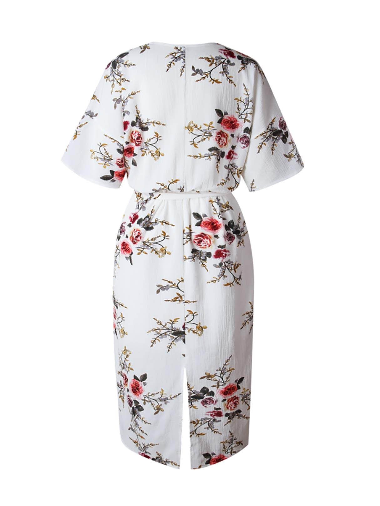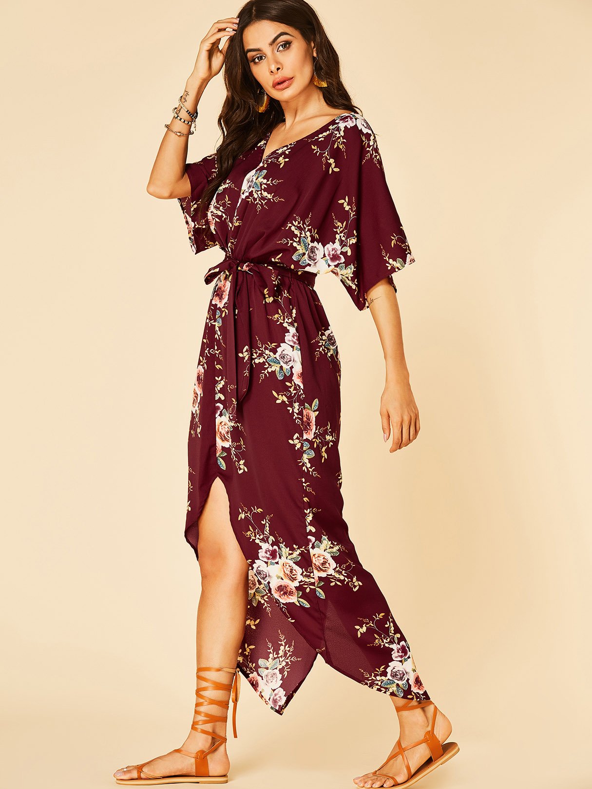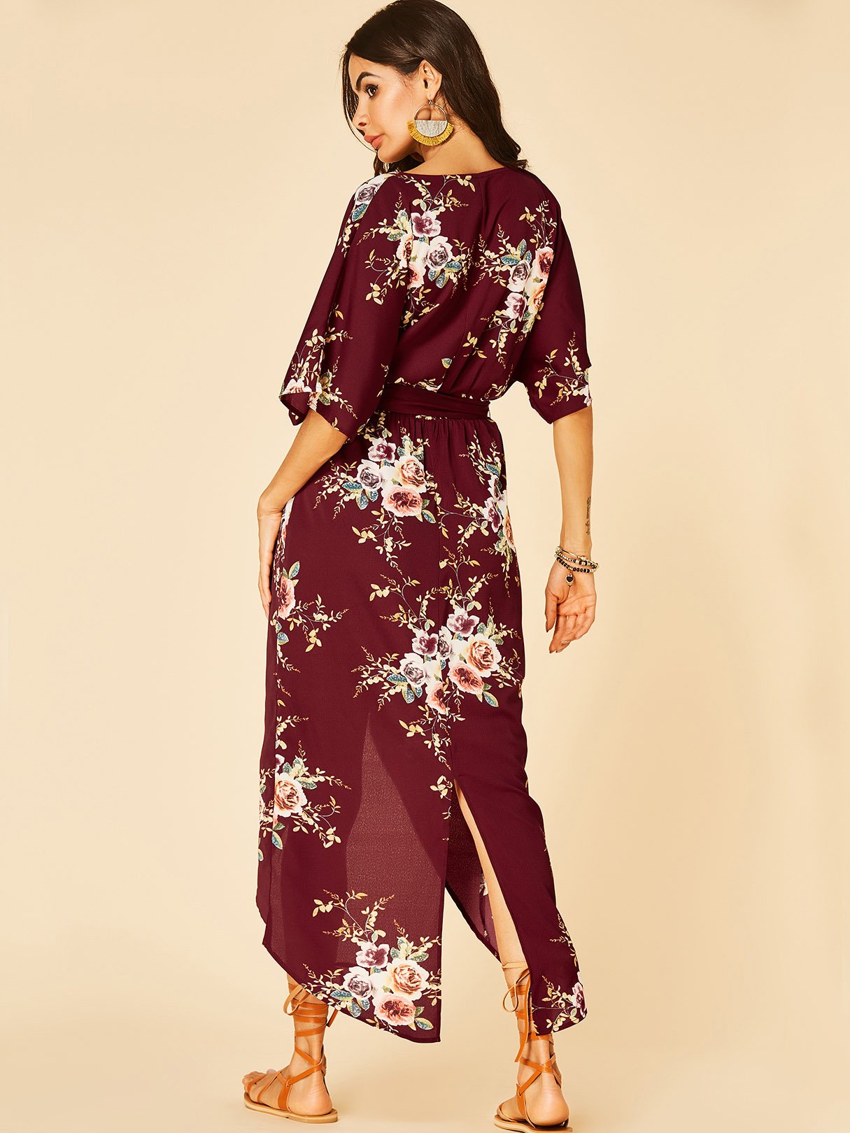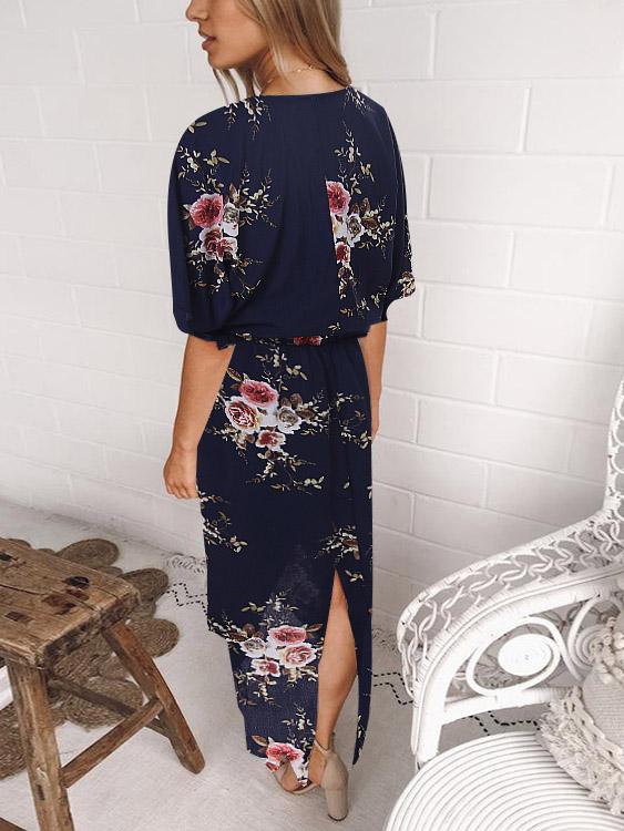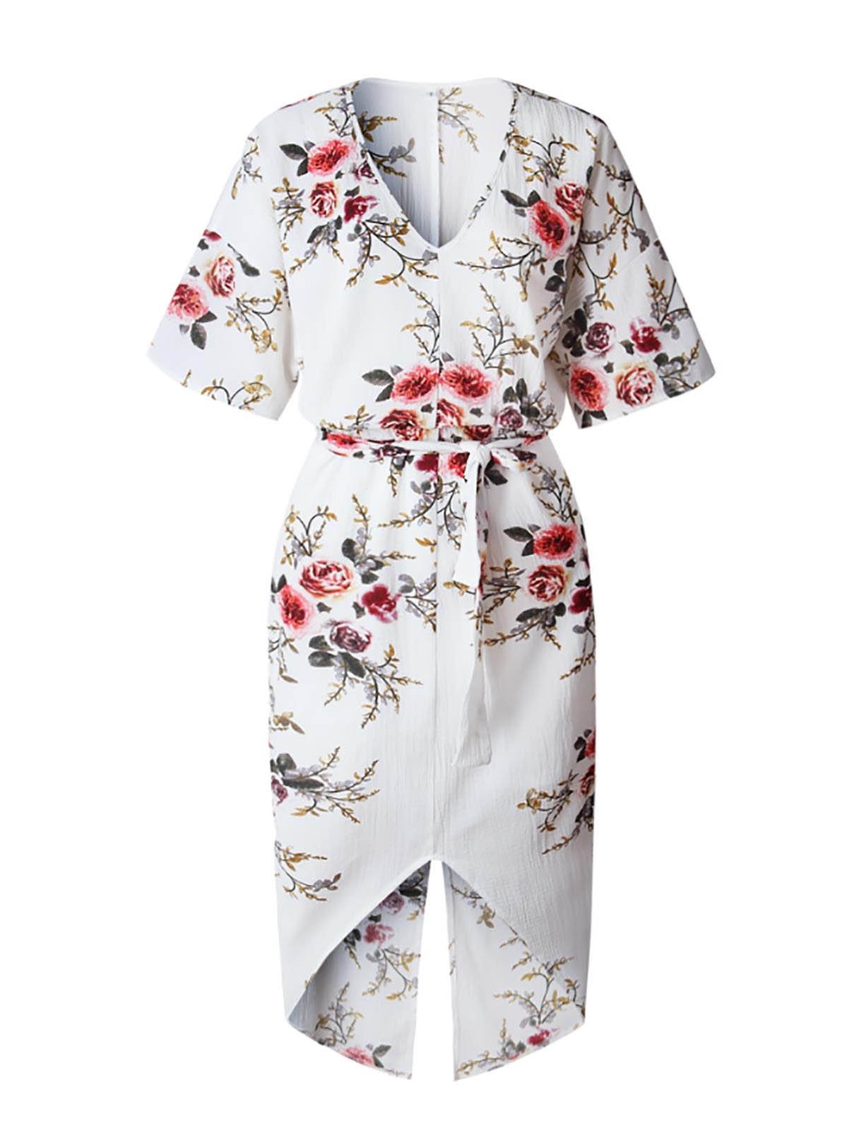 V-Neck Half Sleeve Floral Print Pleated Slit Self-Tie High-Low Hem Dresses