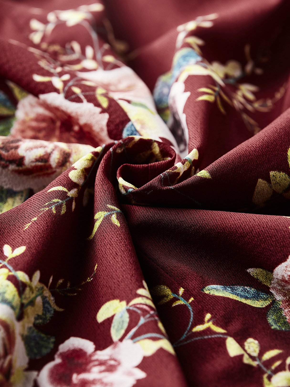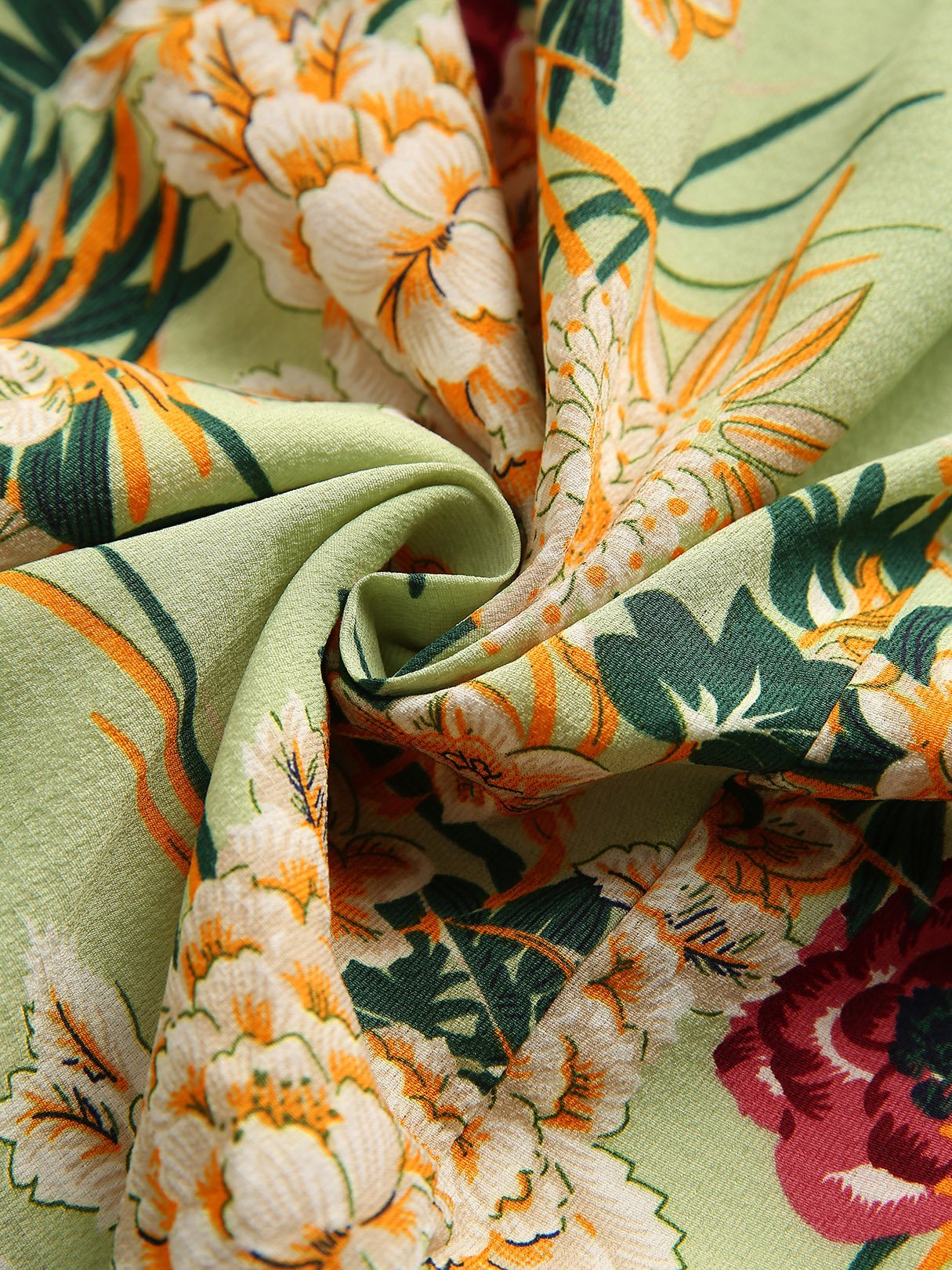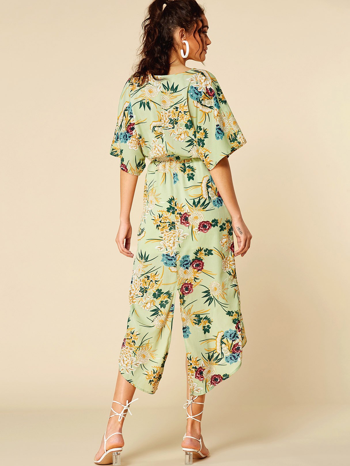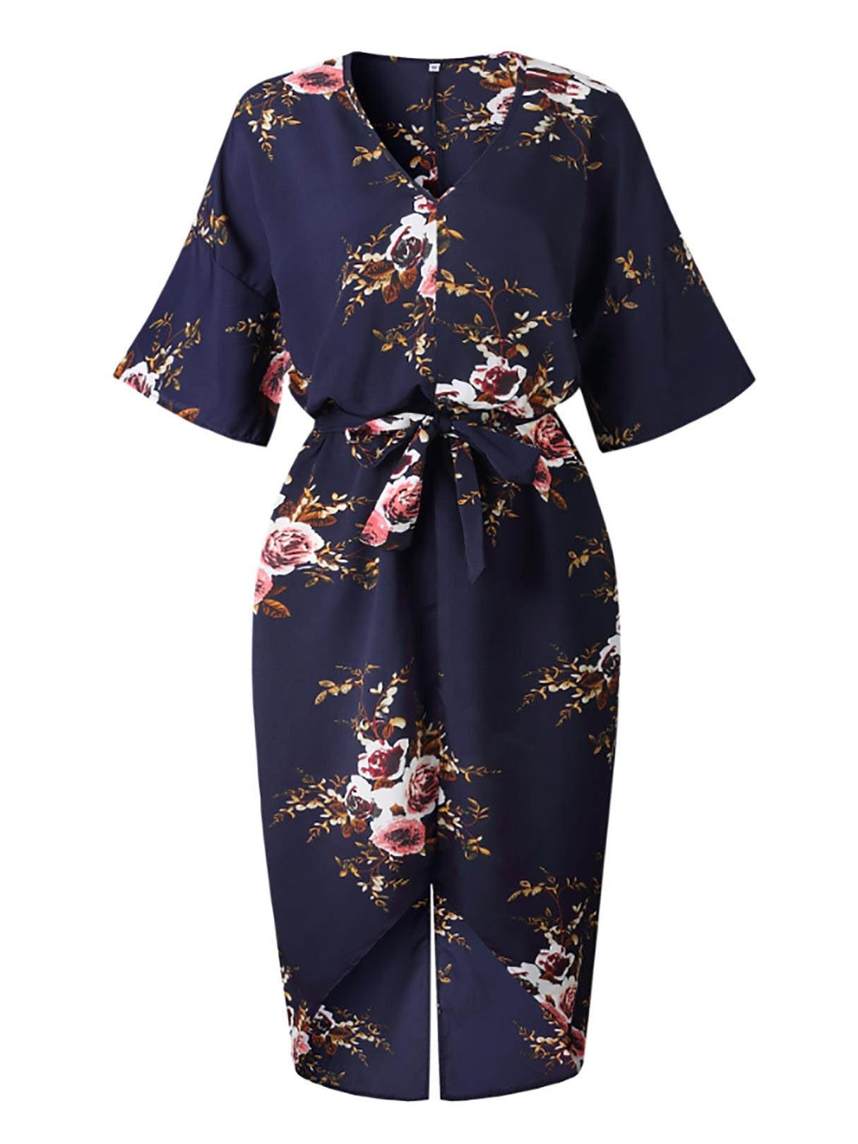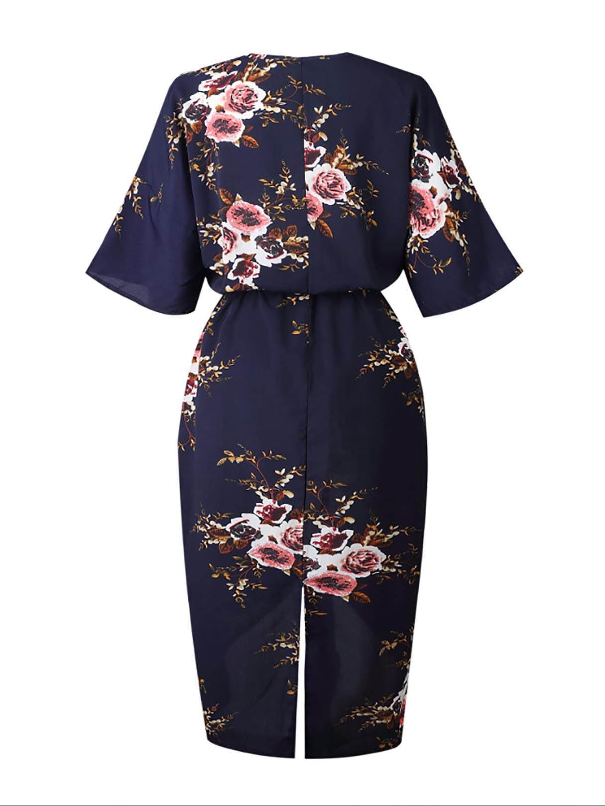 V-Neck Half Sleeve Floral Print Pleated Slit Self-Tie High-Low Hem Dresses