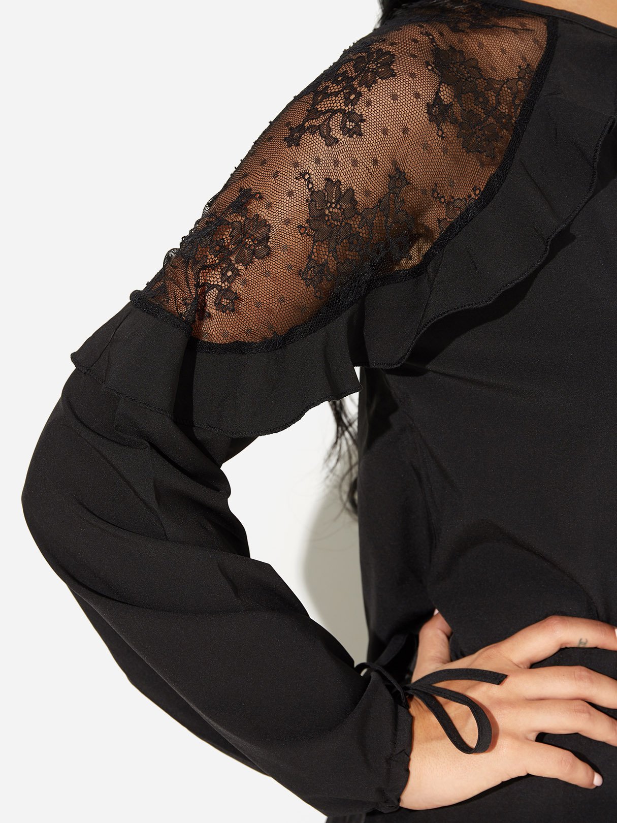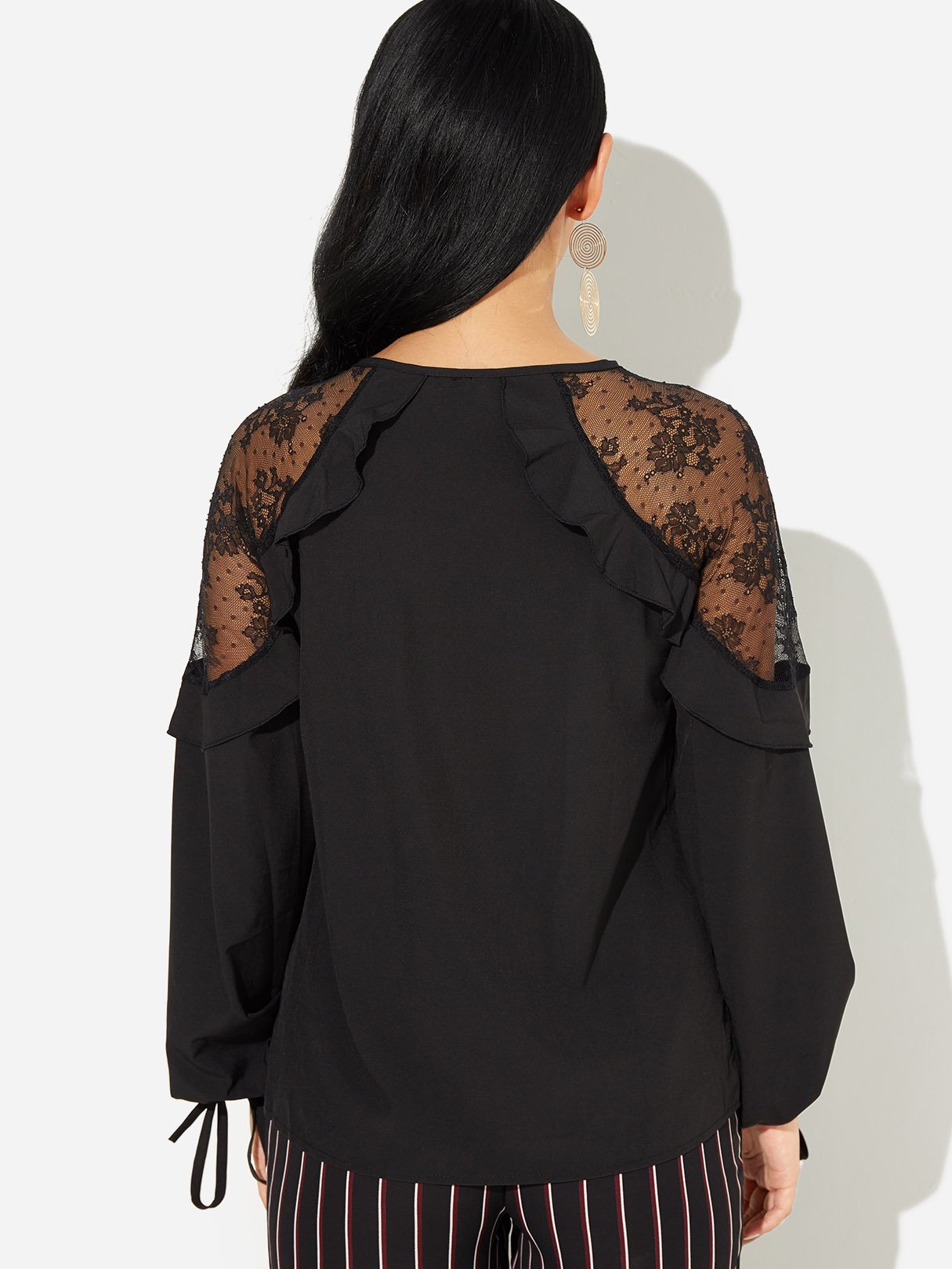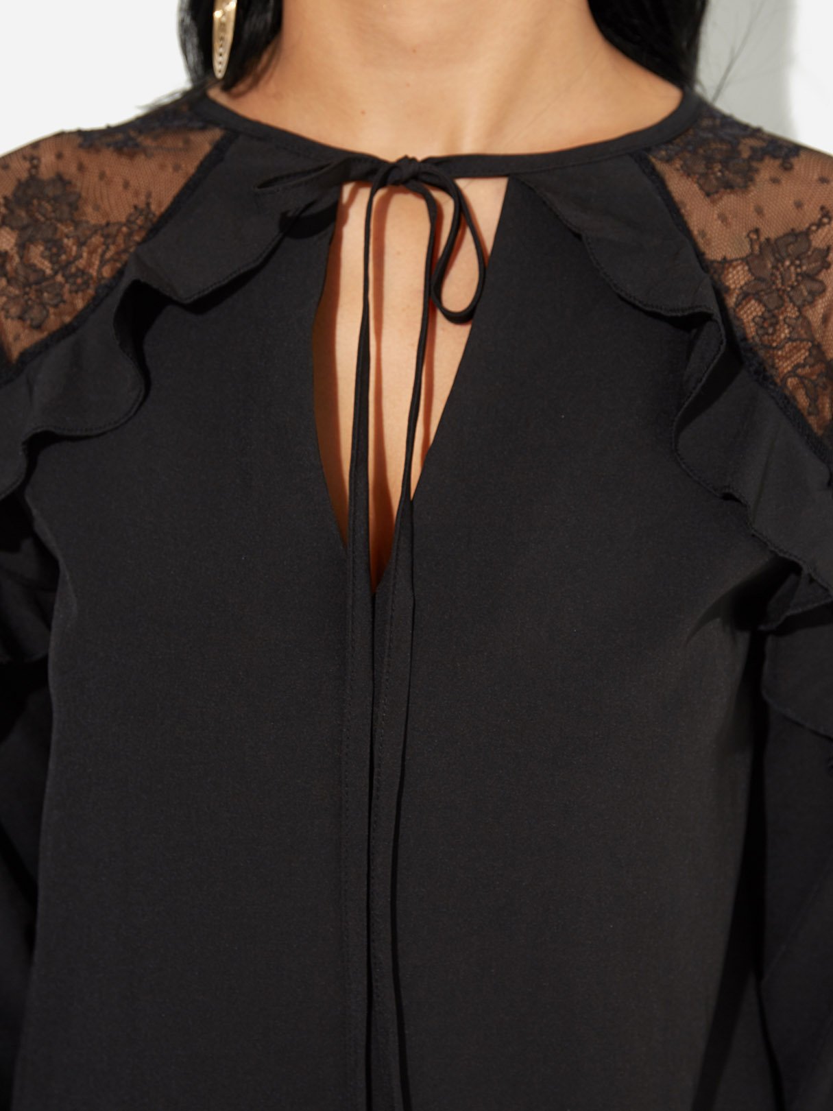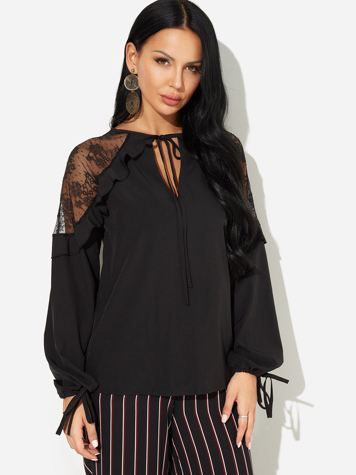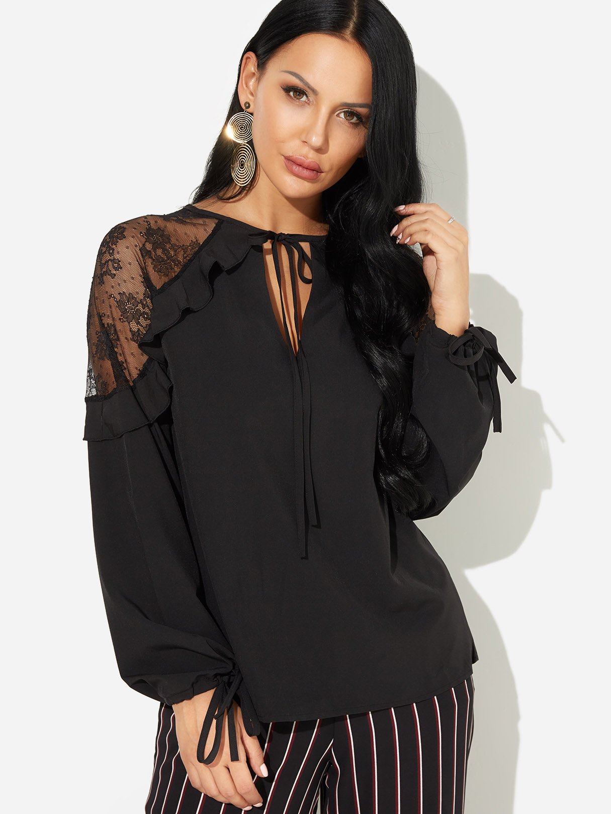 V-Neck Lace Self-Tie Long Sleeve Black Blouses