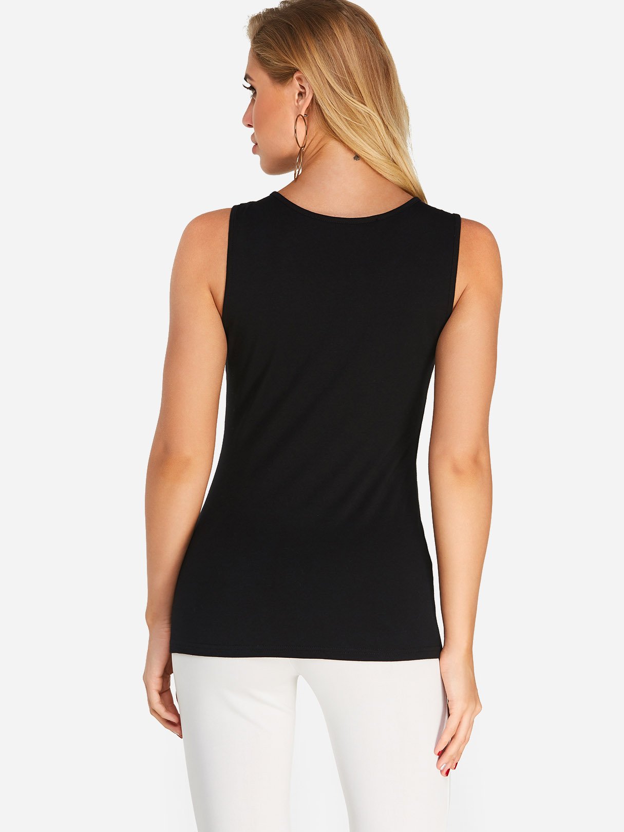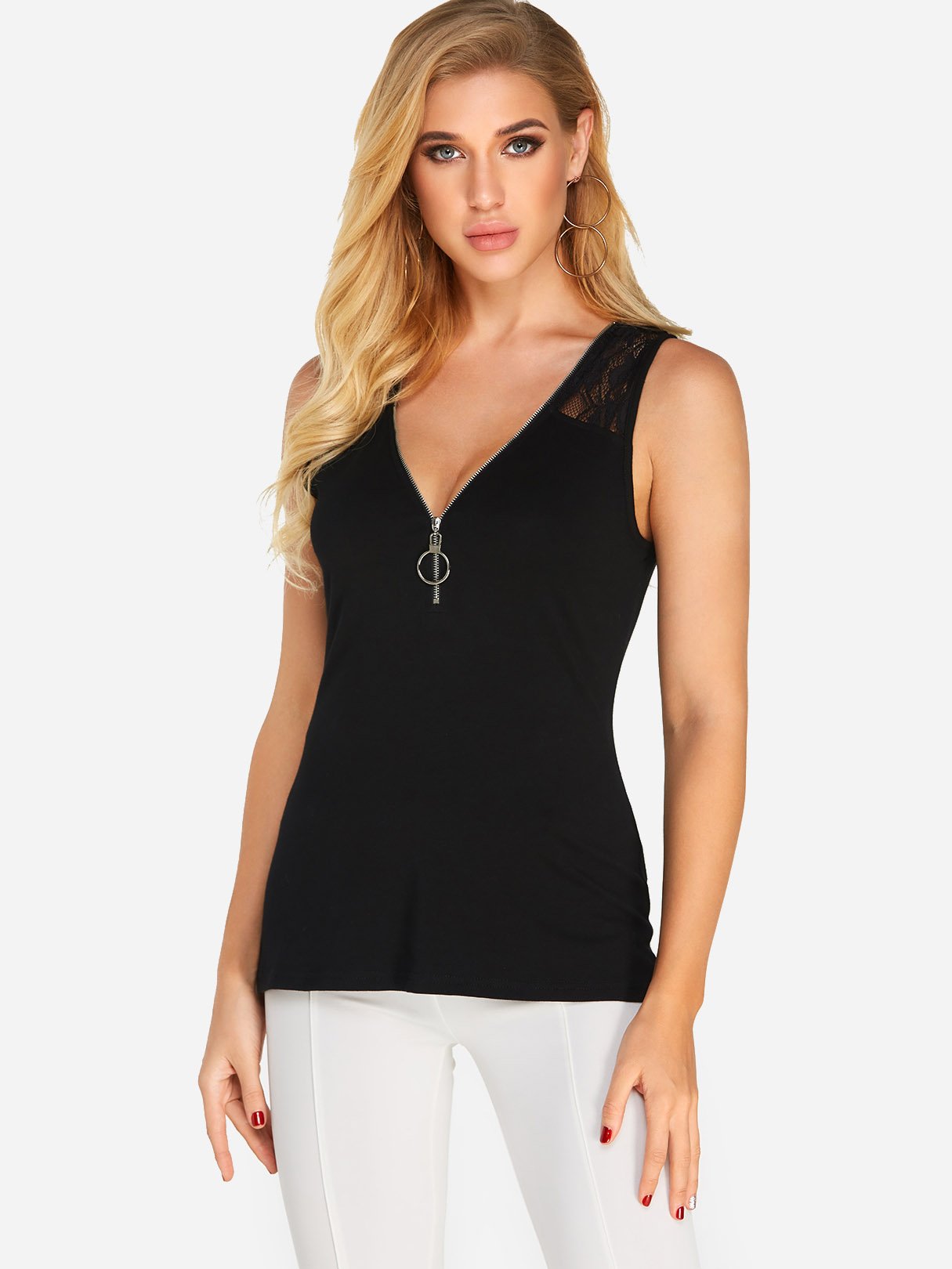 V-Neck Lace Zip Back Sleeveless Black Tank Top
