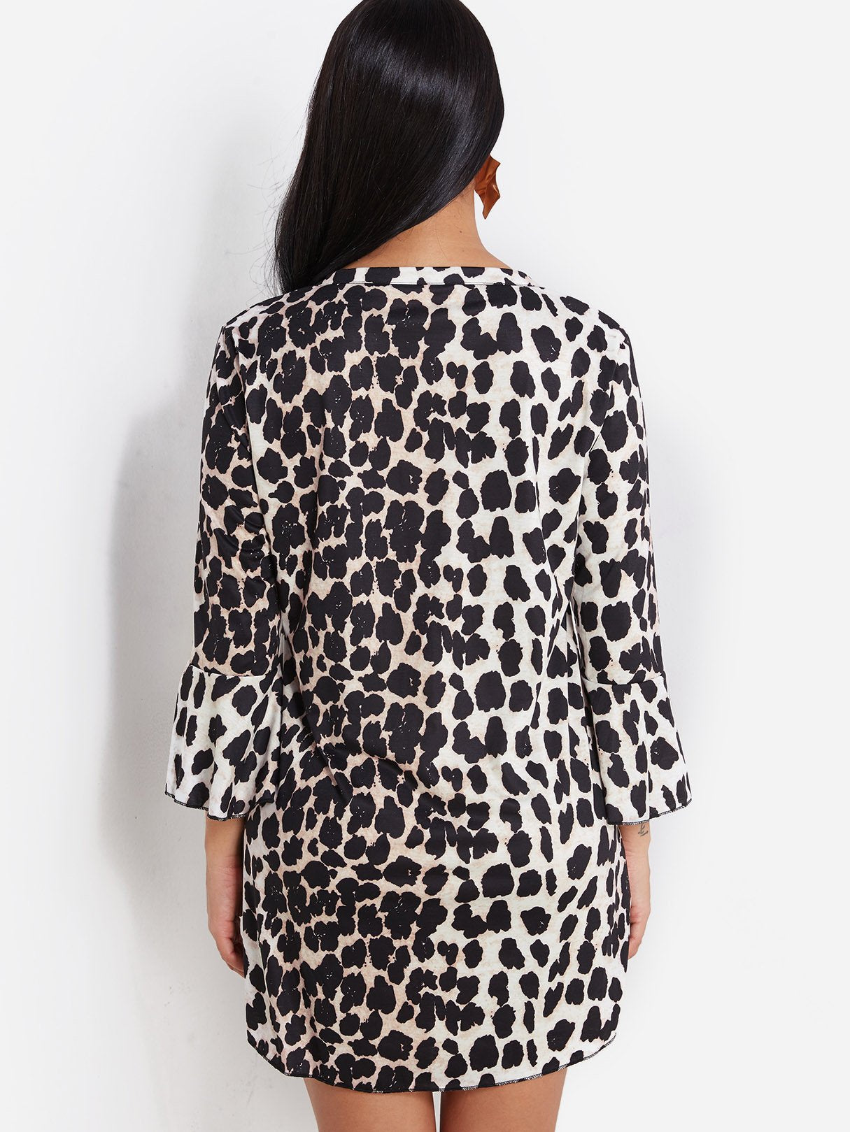 V-Neck Leopard 3/4 Length Sleeve Flounced Hem Dresses