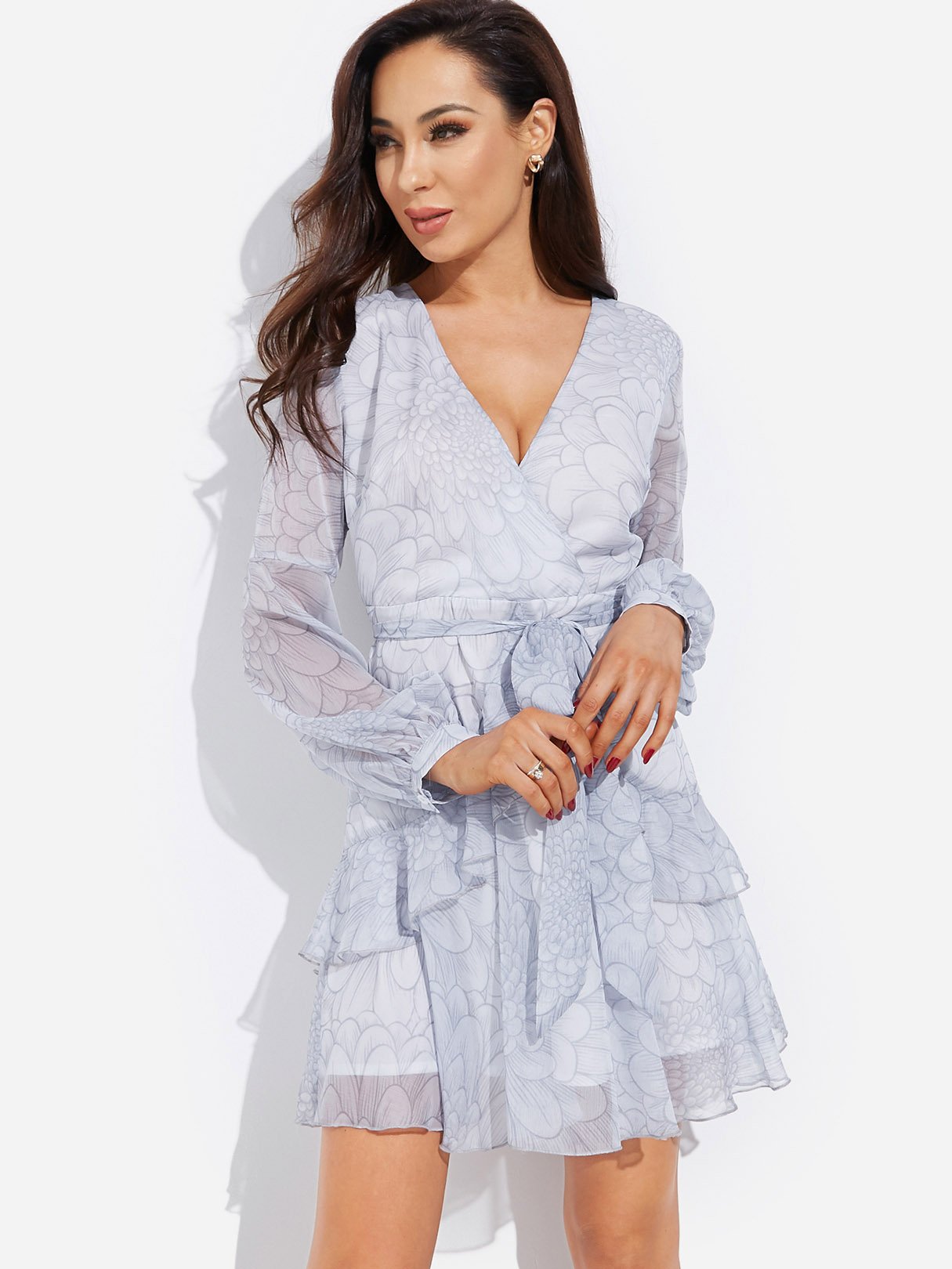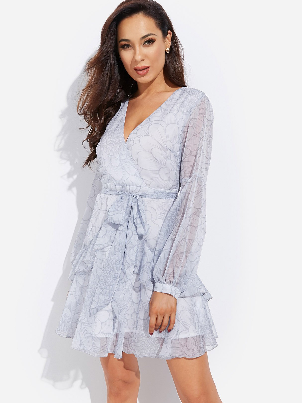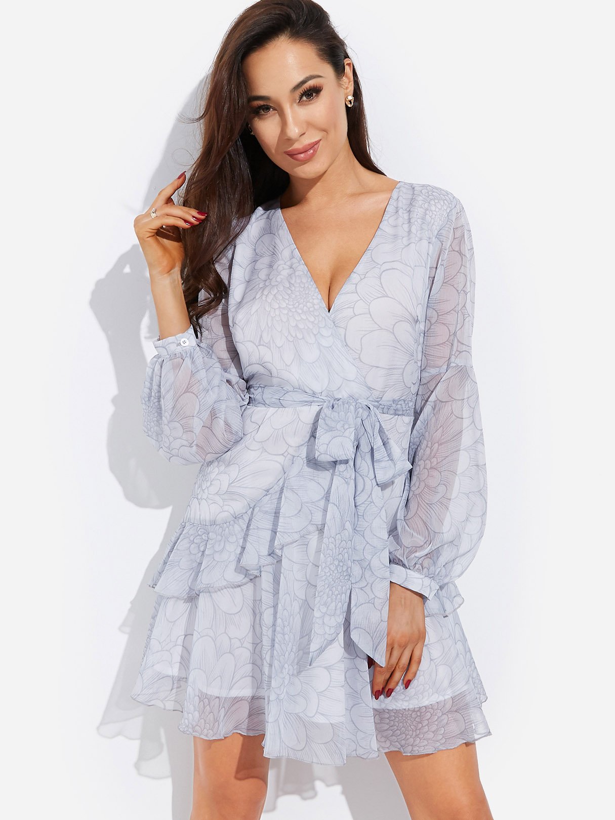 Material:PolyesterNeckline:V-NeckSeason:Spring,AutumnSleeves:Long SleevesPattern:Floral PrintStyle:Casual StyleDetail:Lace-Up Design,Belt Design,Wrap DesignHem Design:Flounced HemLength:MiniFit:Regular FitSleeves Type:Lantern Sleeves