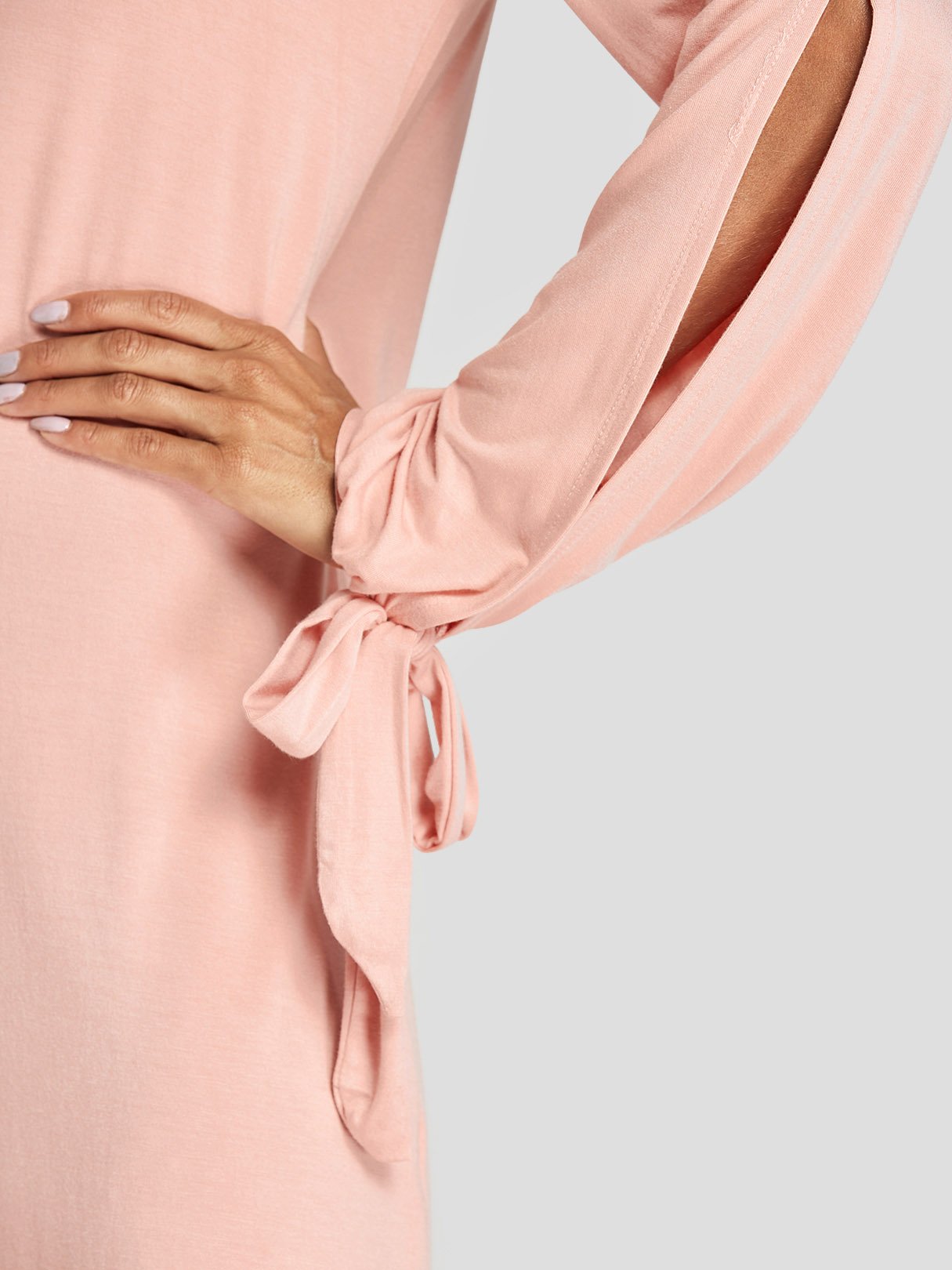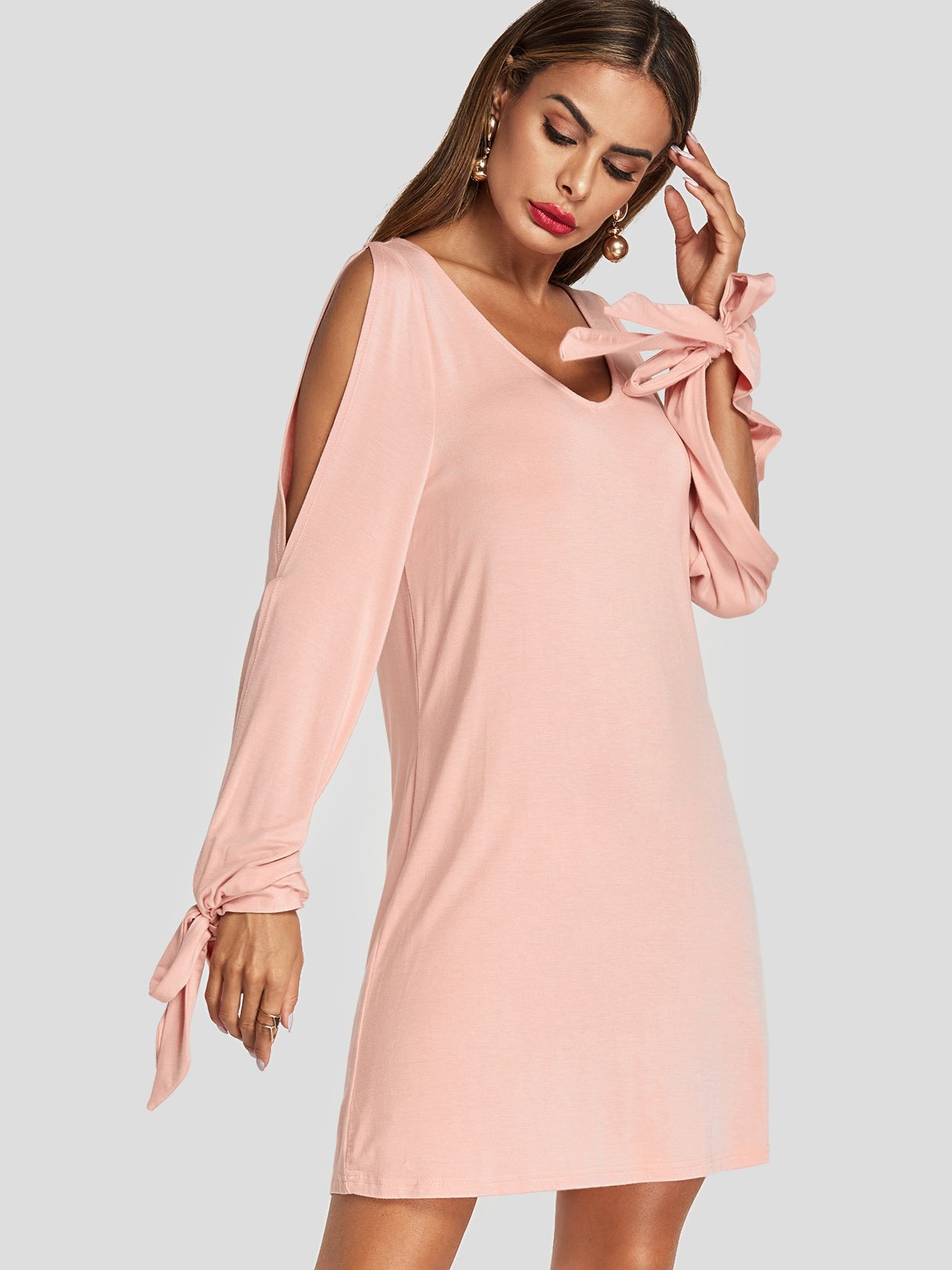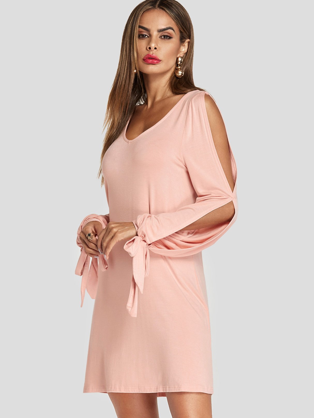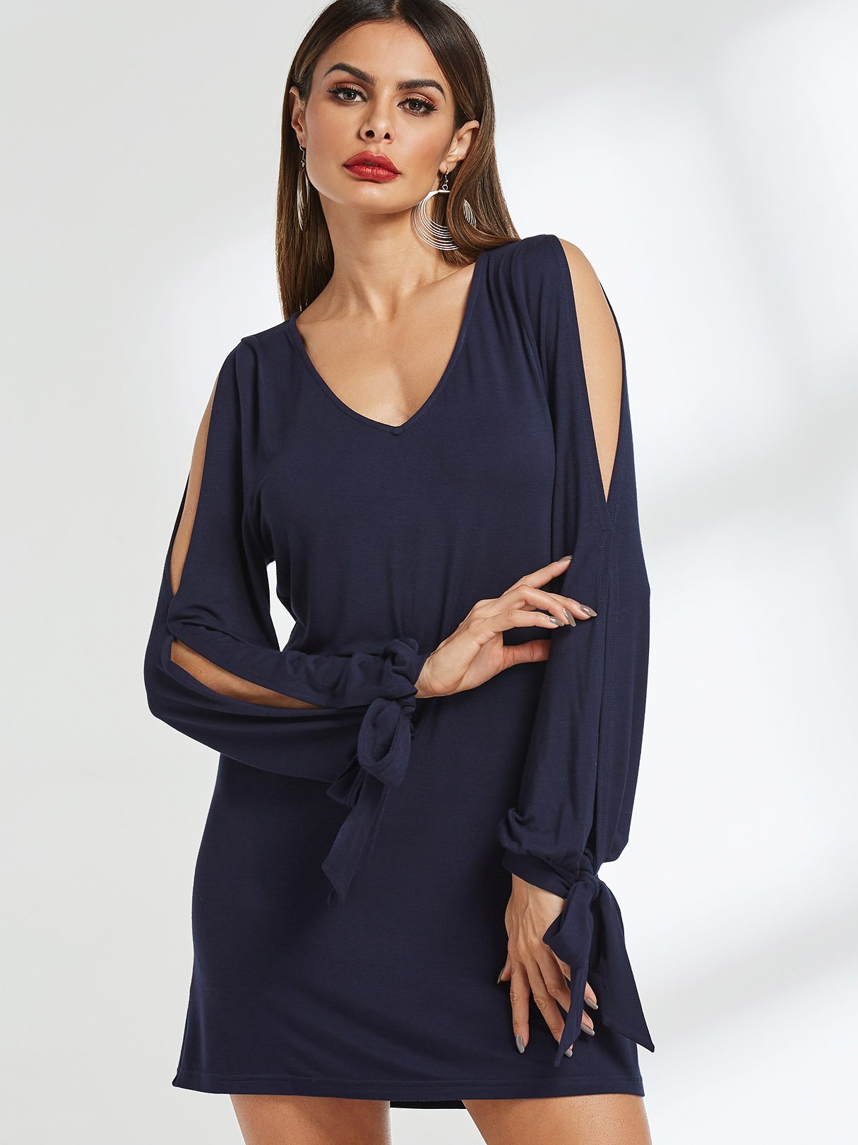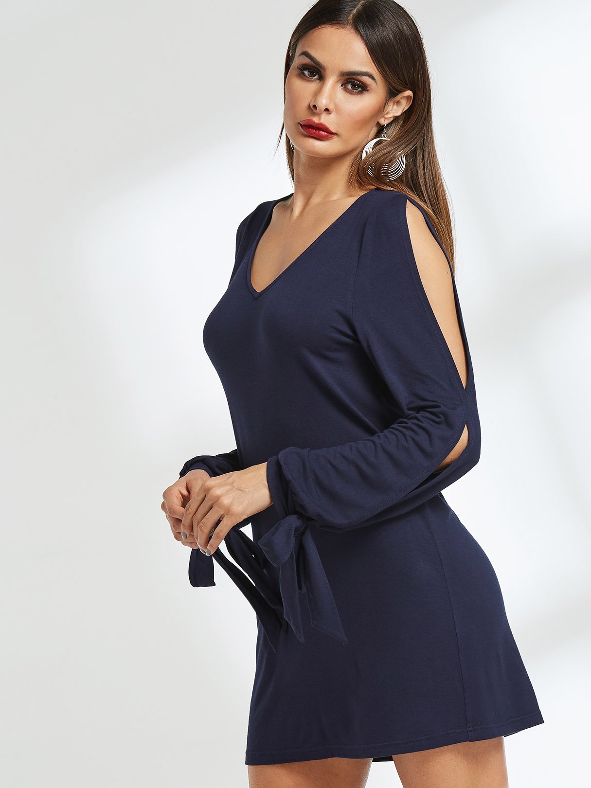 V-Neck Long Sleeve Plain Cut Out Slit Dresses