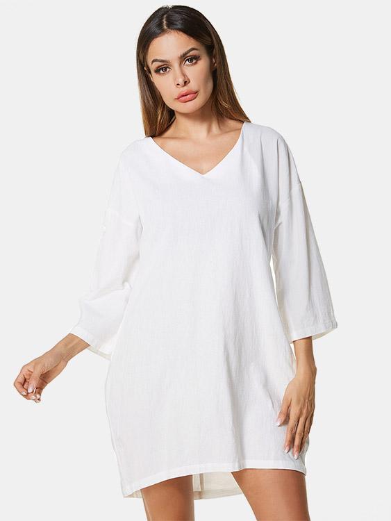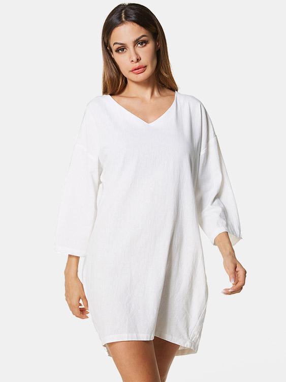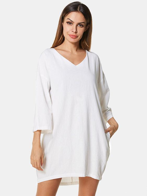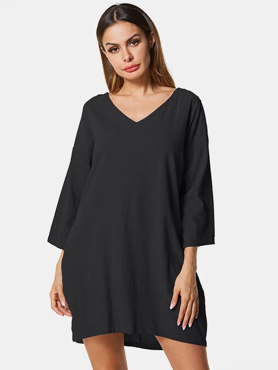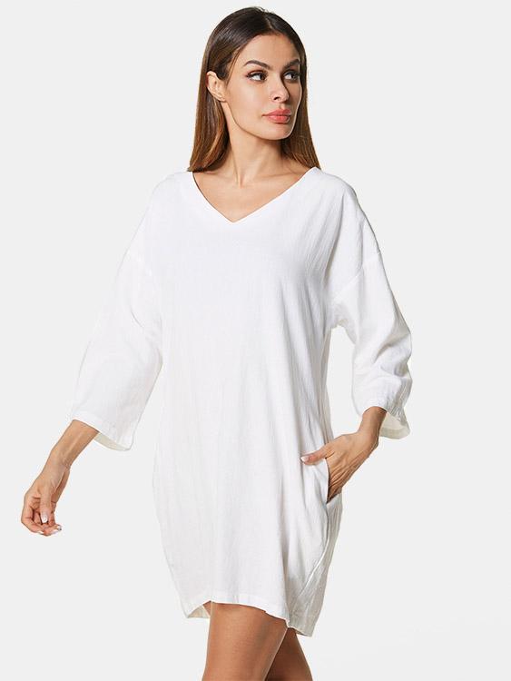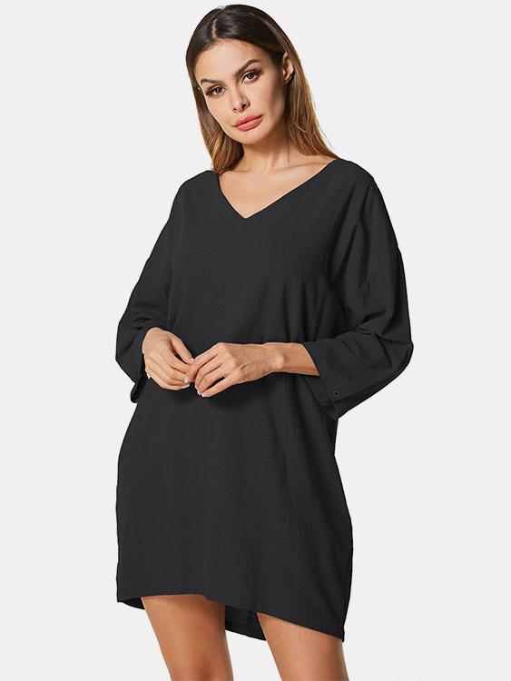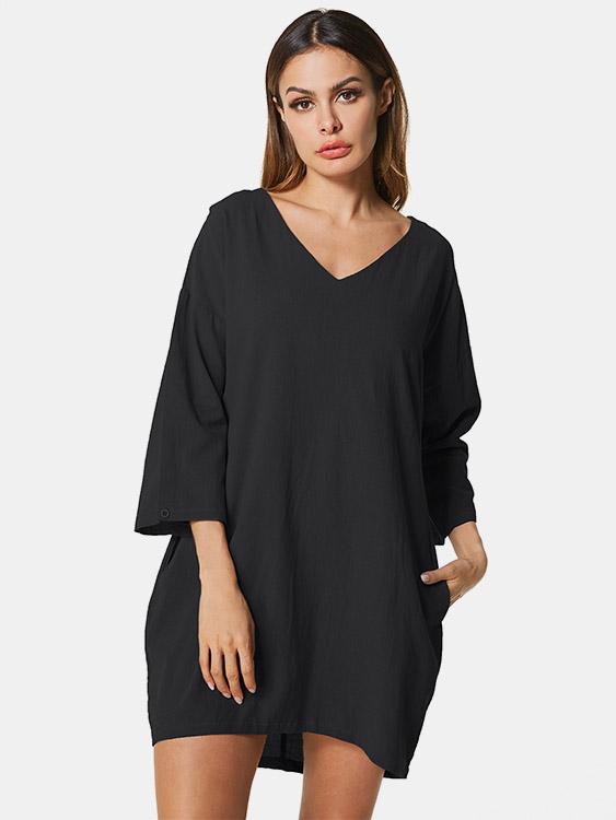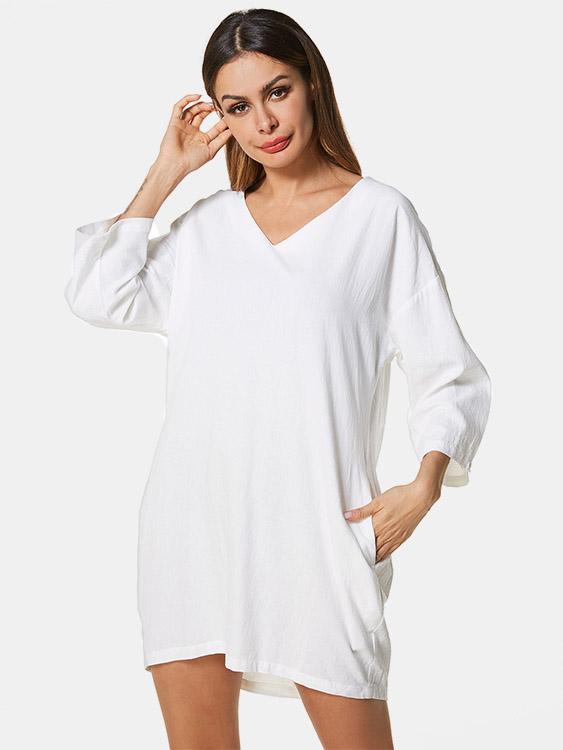 V-Neck Long Sleeve Plain Side Pockets Dresses