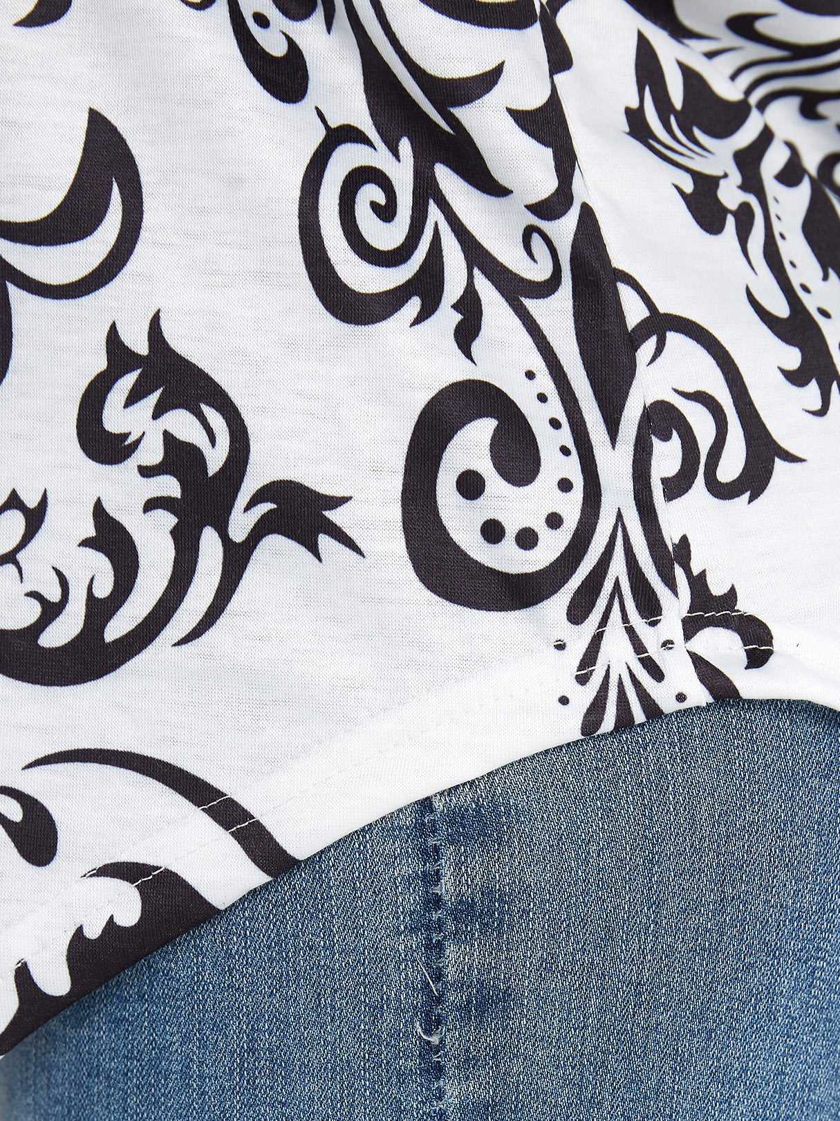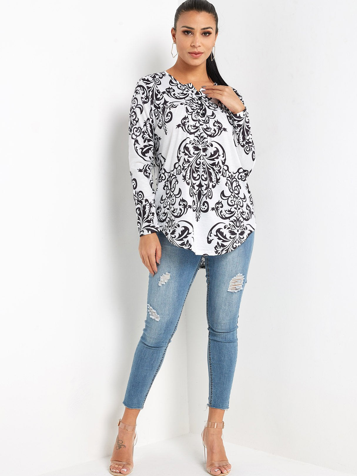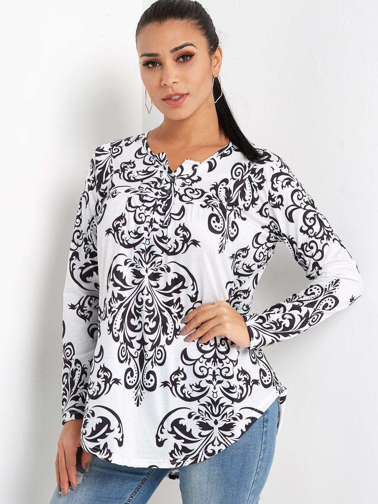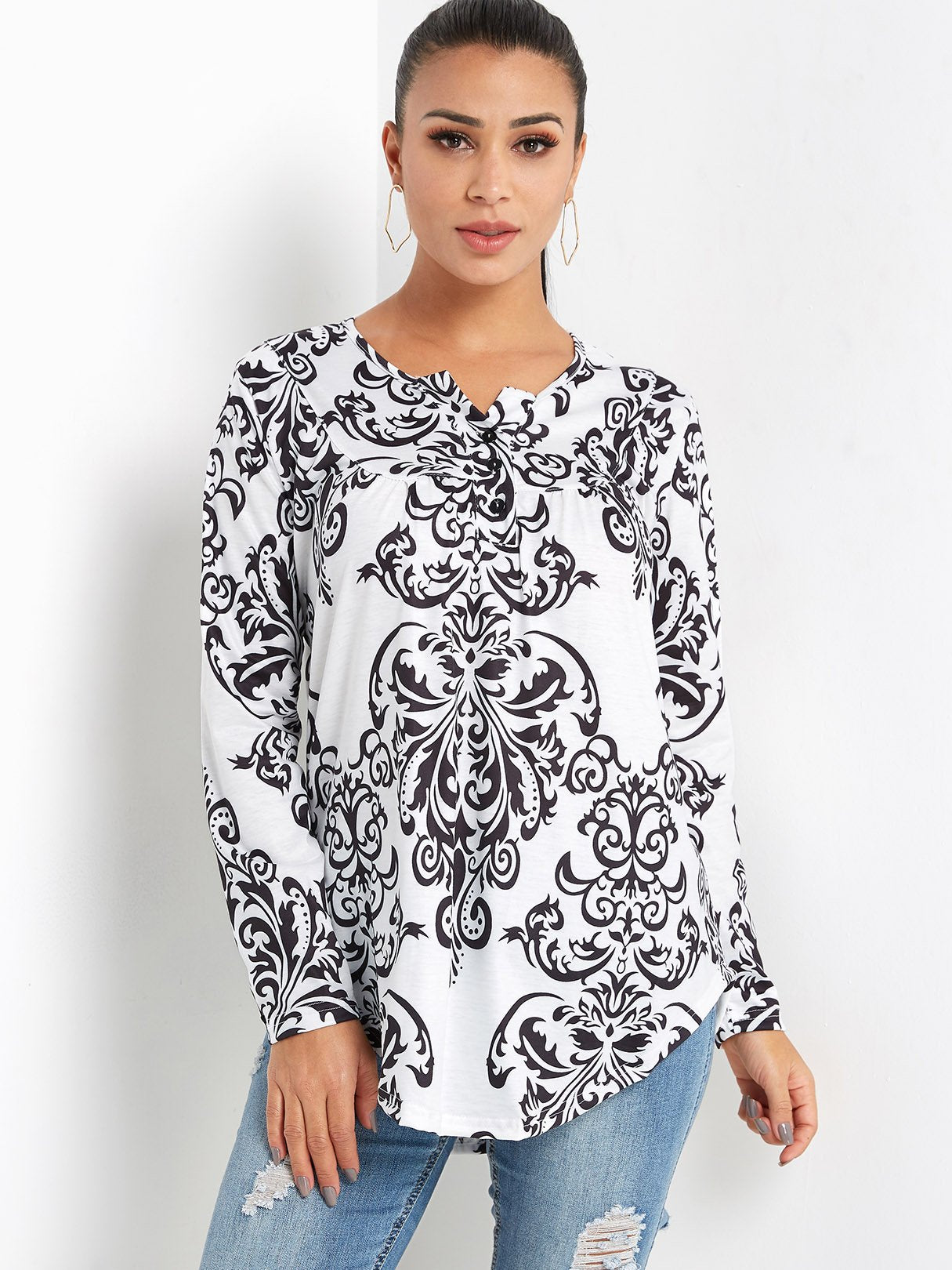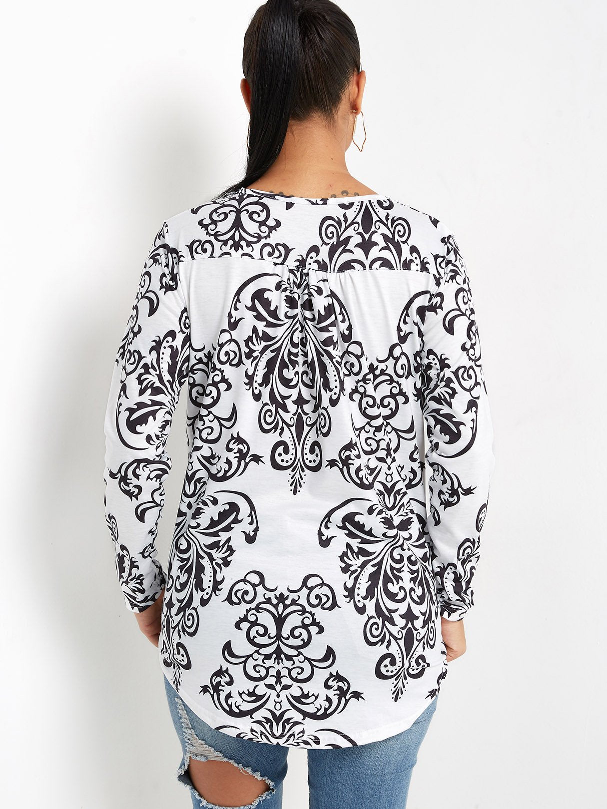 V-Neck Long Sleeve Tribal Print Black Blouses