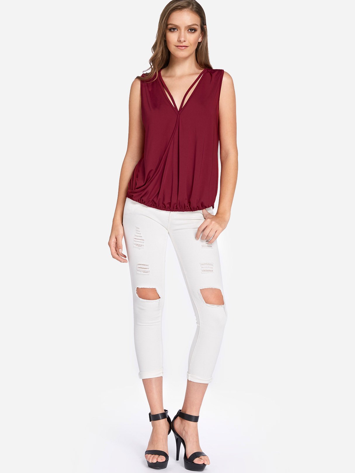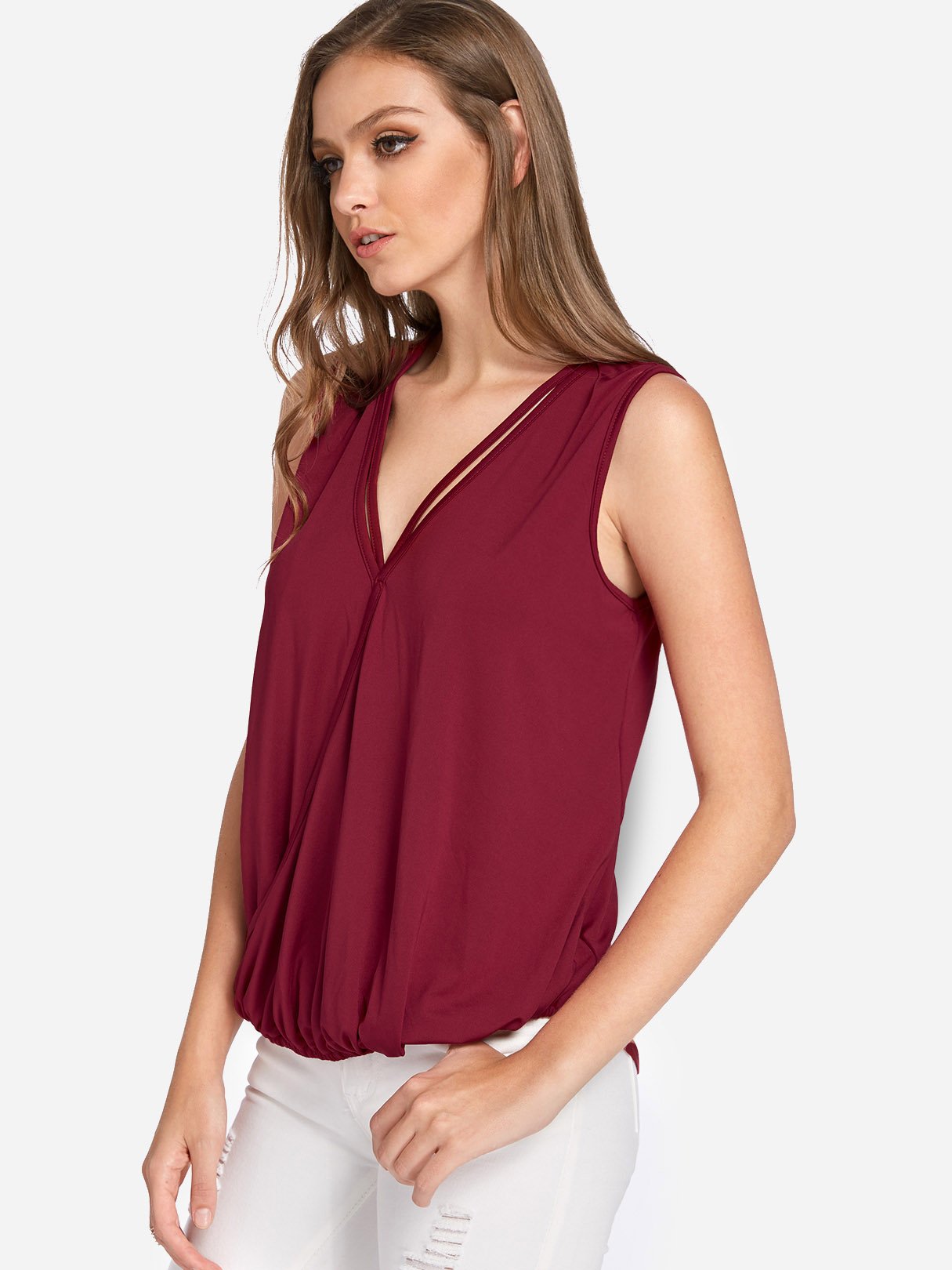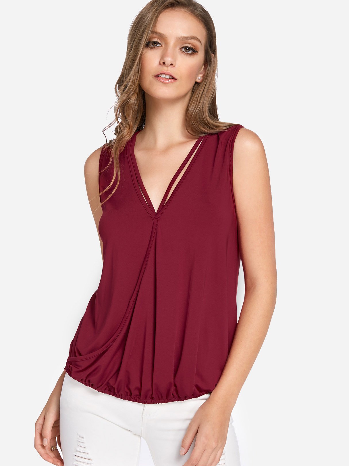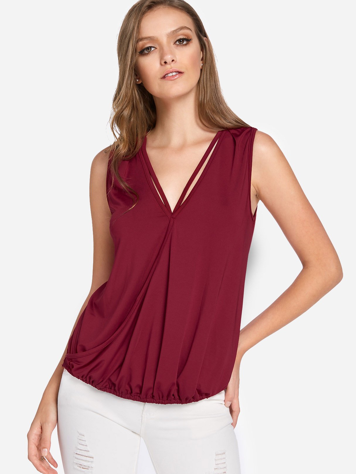 V-Neck Plain Crossed Front Spaghetti Strap Sleeveless Burgundy Tank Top
