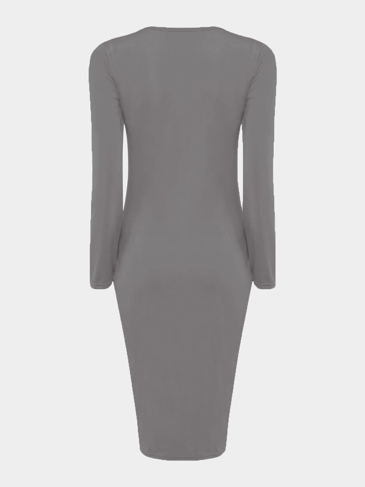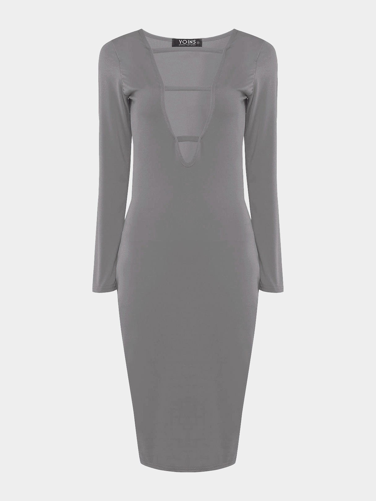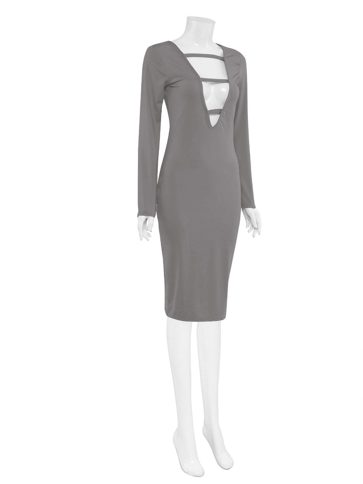 V-Neck Plain Hollow Long Sleeve Grey Sexy Dresses