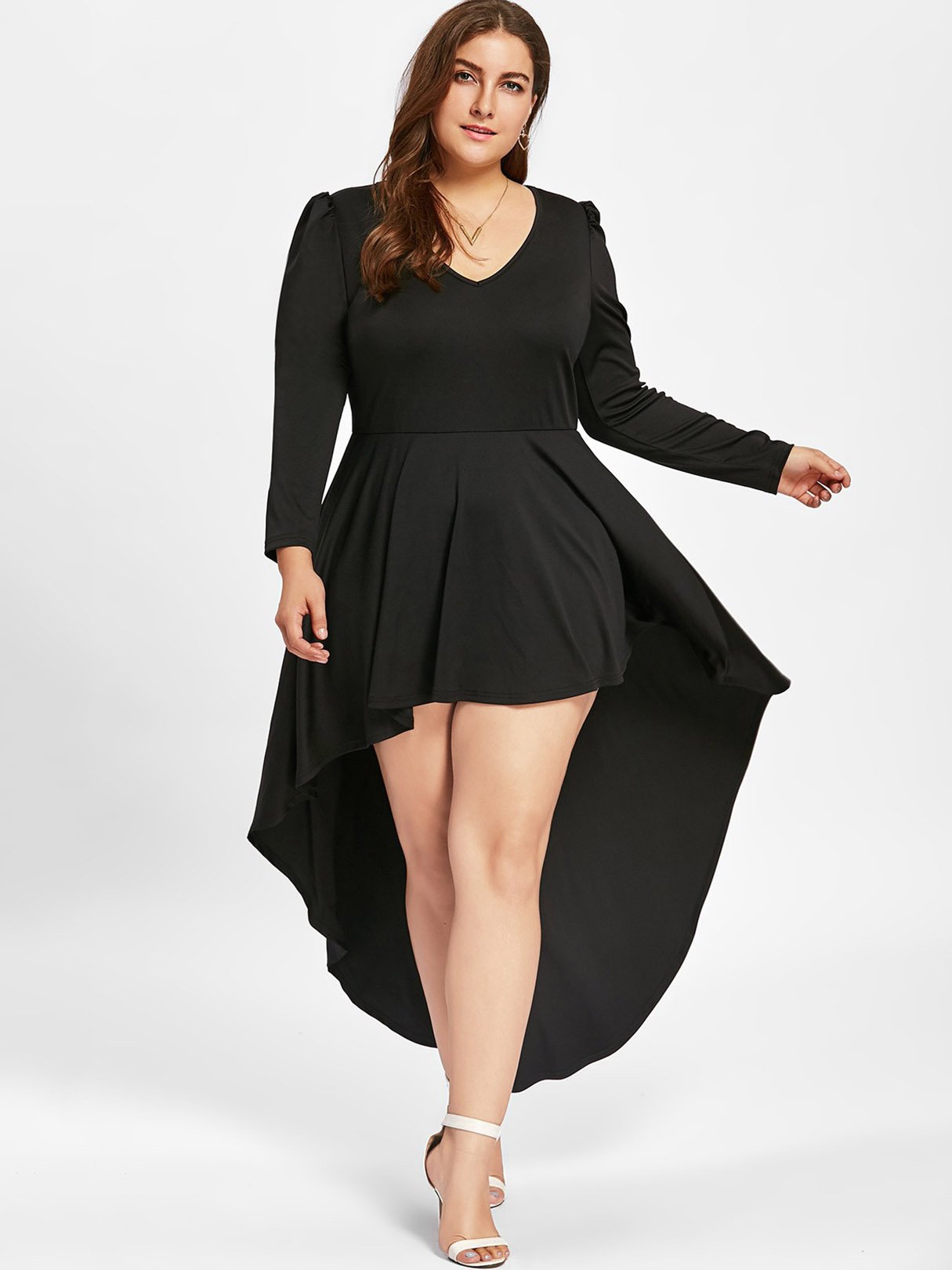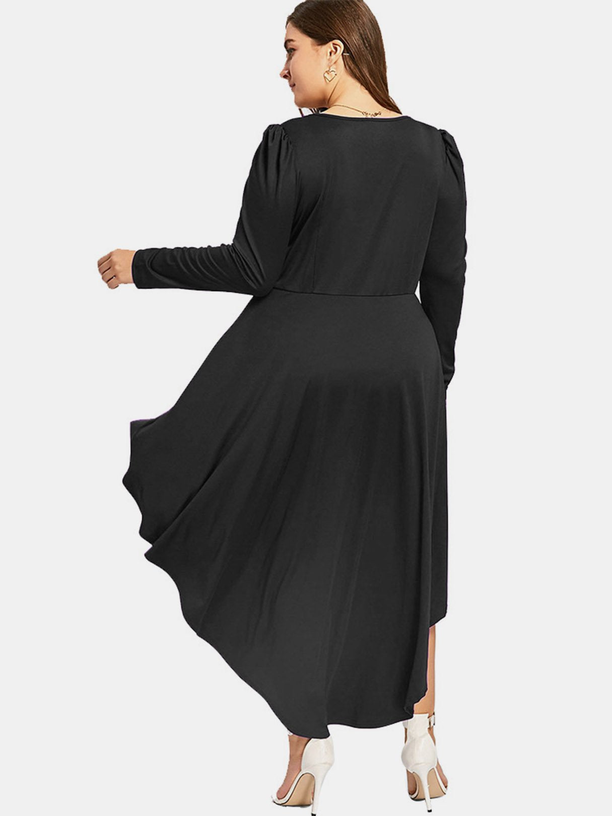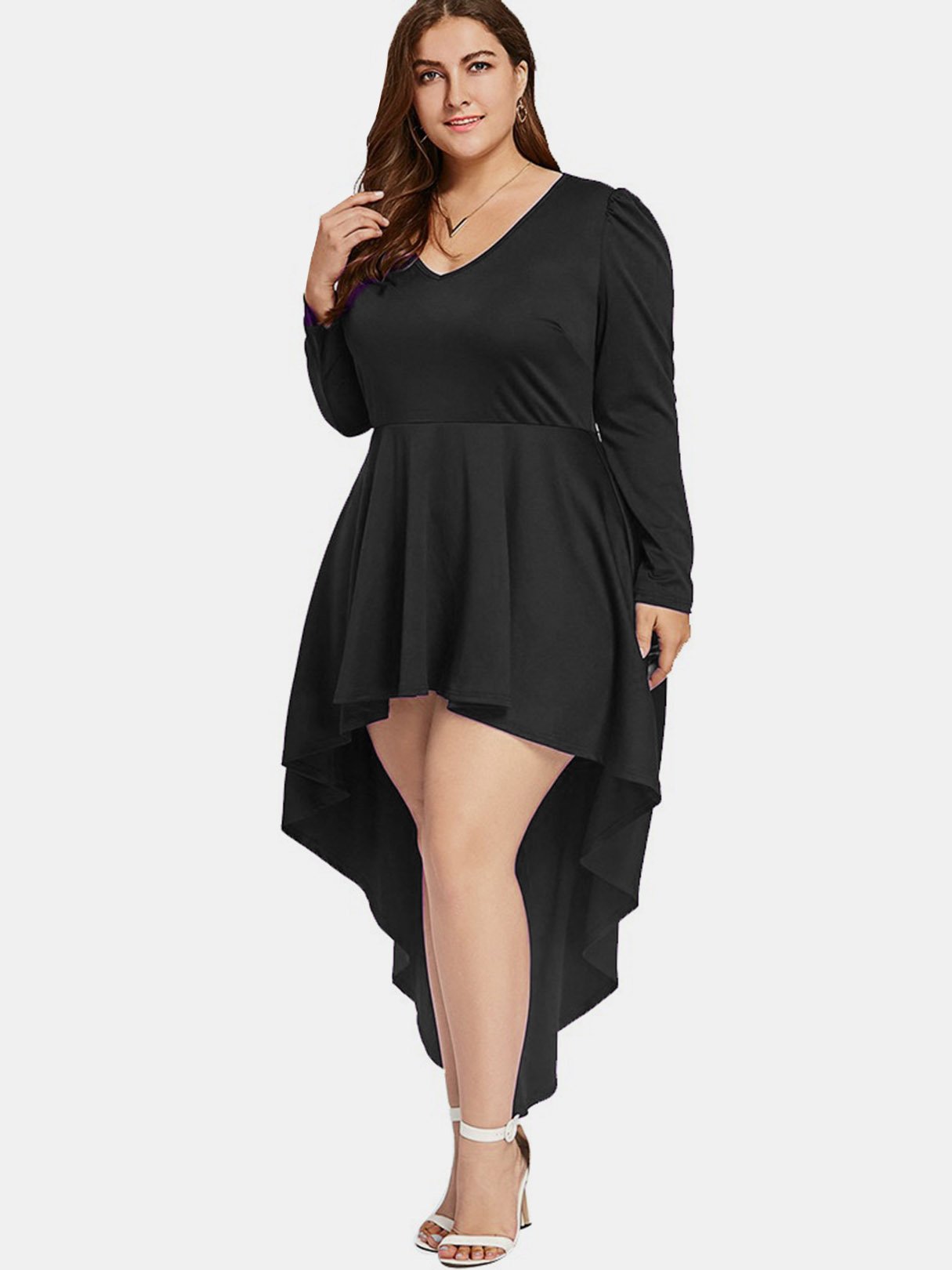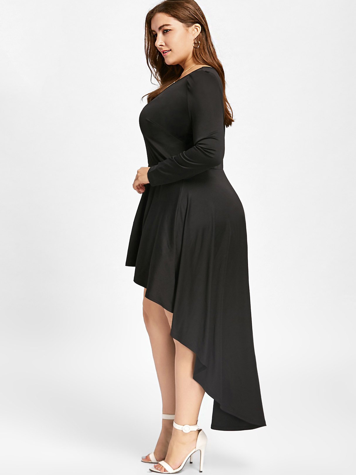 V-Neck Plain Long Sleeve Irregular Hem Black Plus Size Dress - Black / XL is backordered and will ship as soon as it is back in stock.
