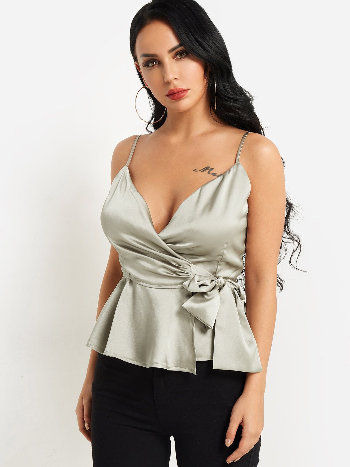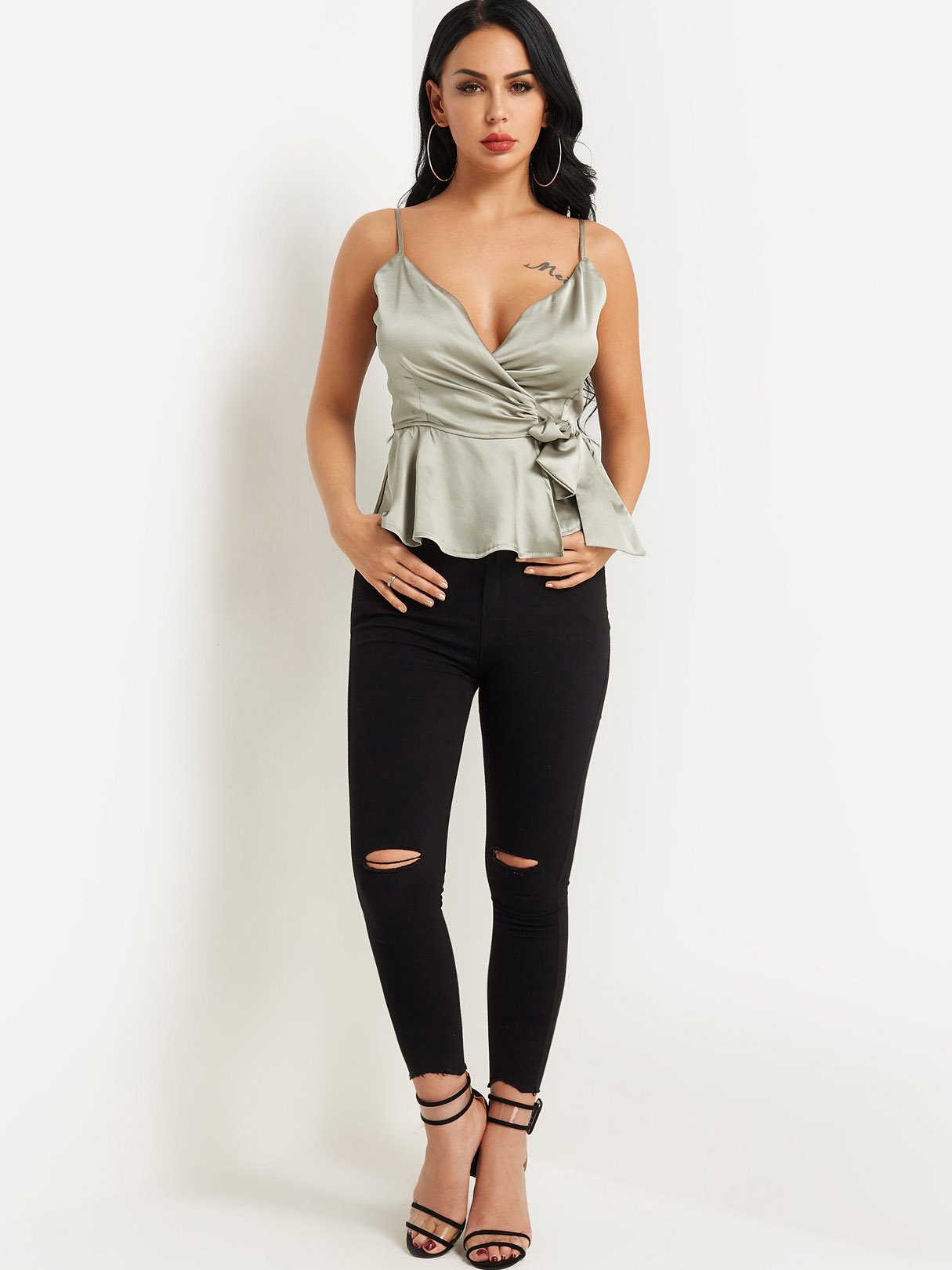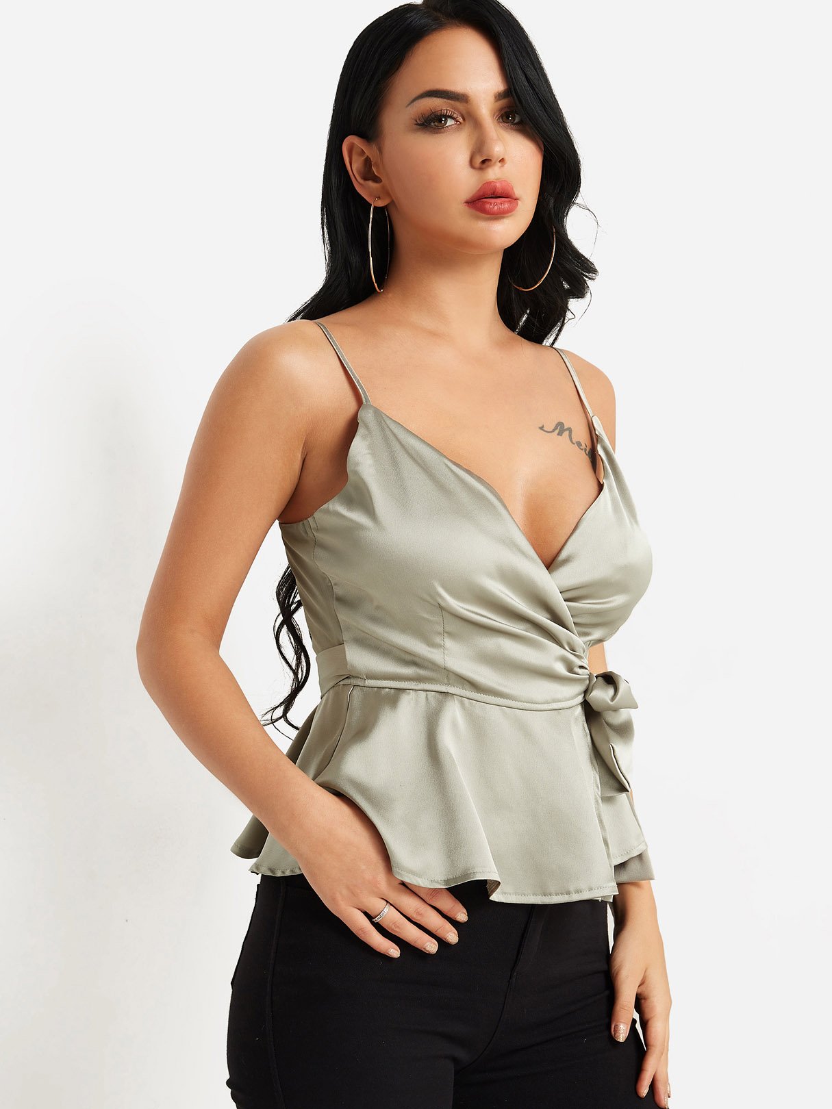 V-Neck Plain Self-Tie Sleeveless Flounced Hem Green Camis