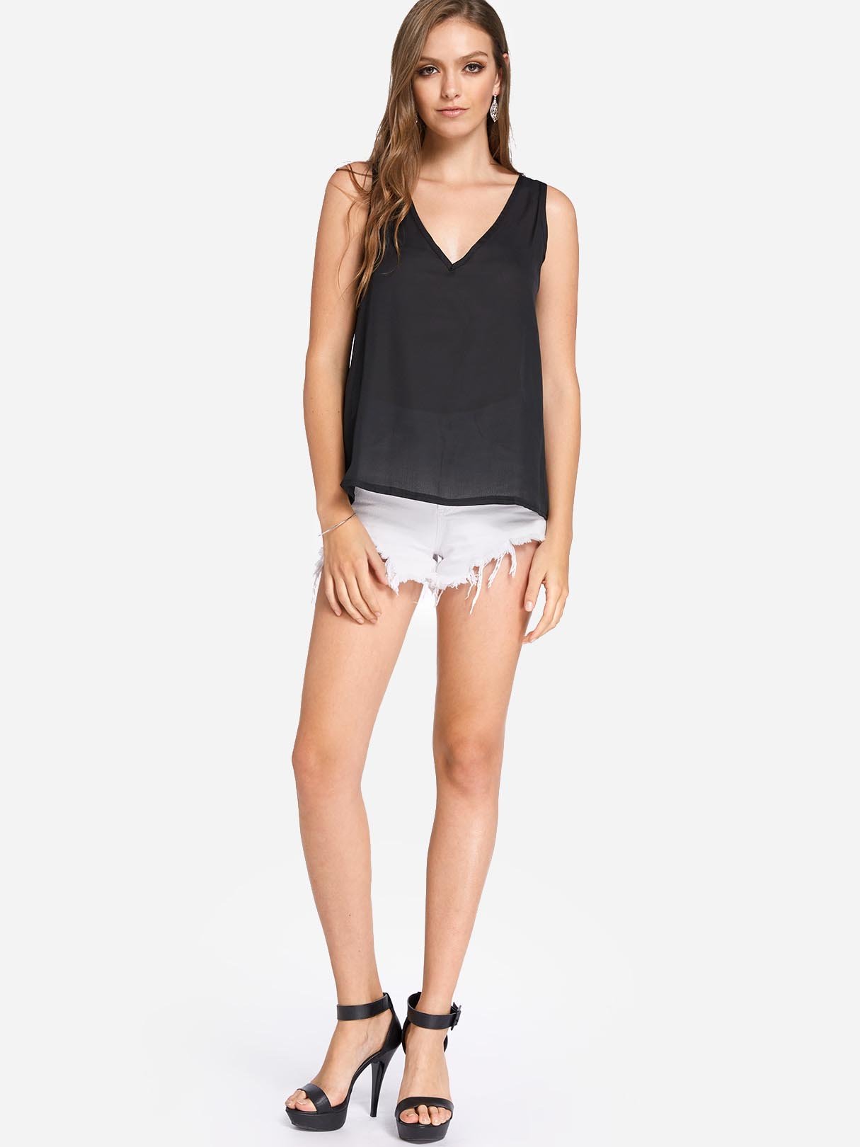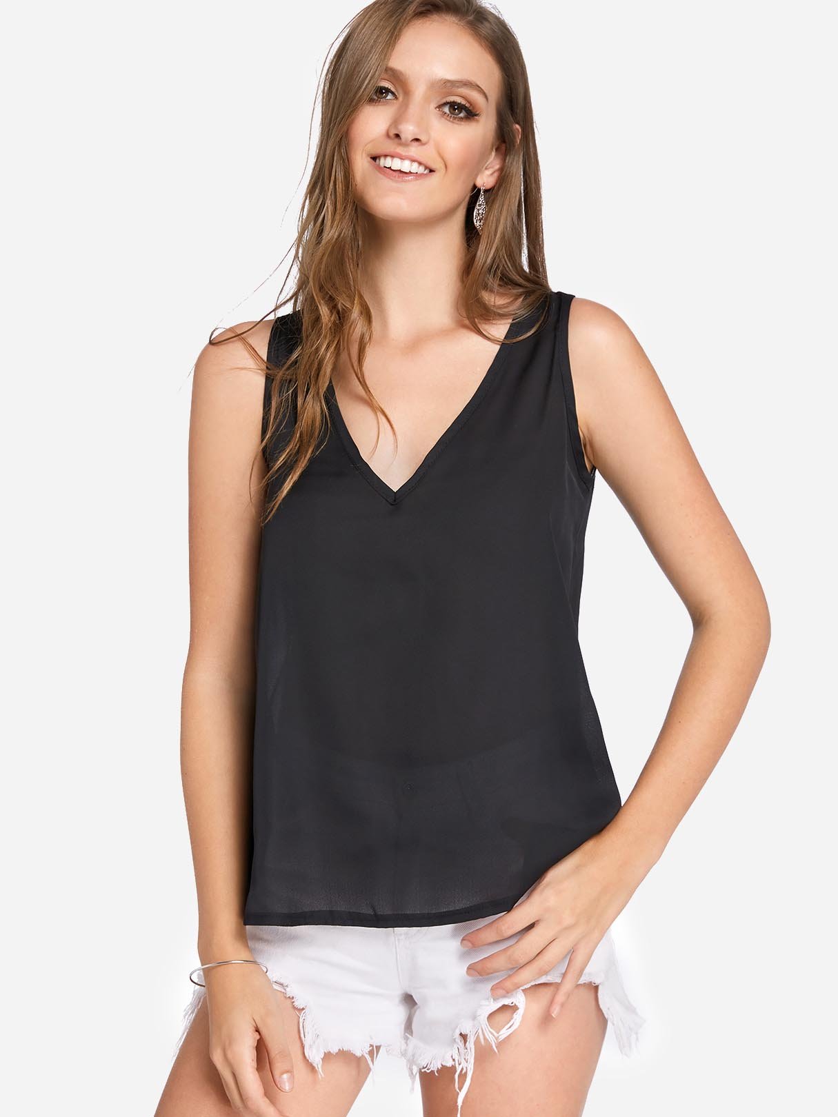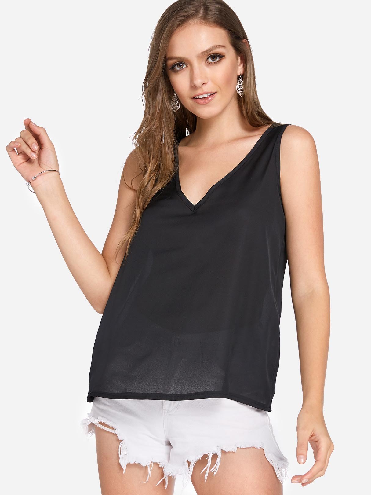 V-Neck Plain Spaghetti Strap Sleeveless Black Camis