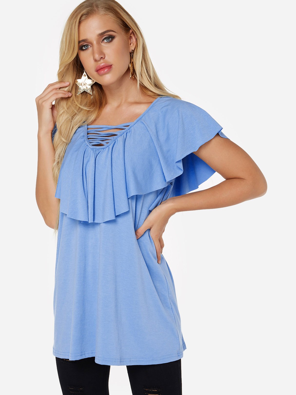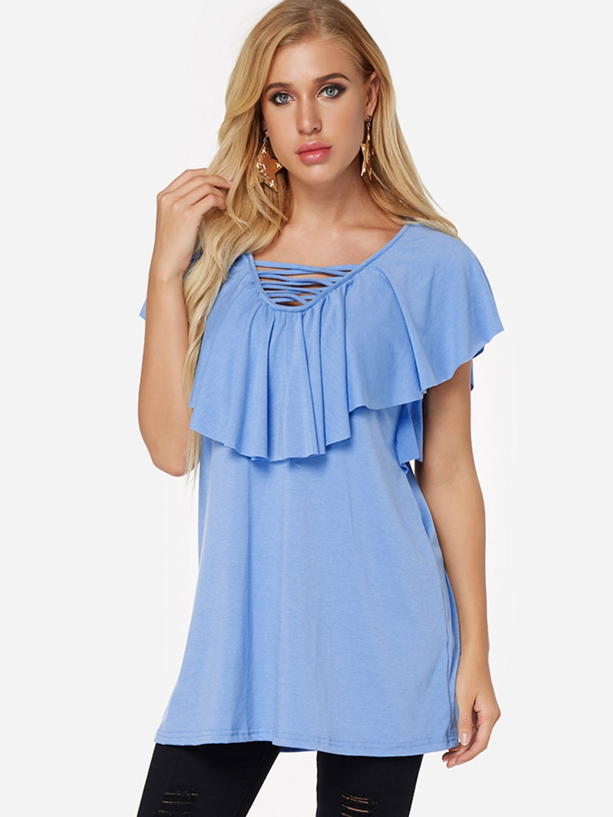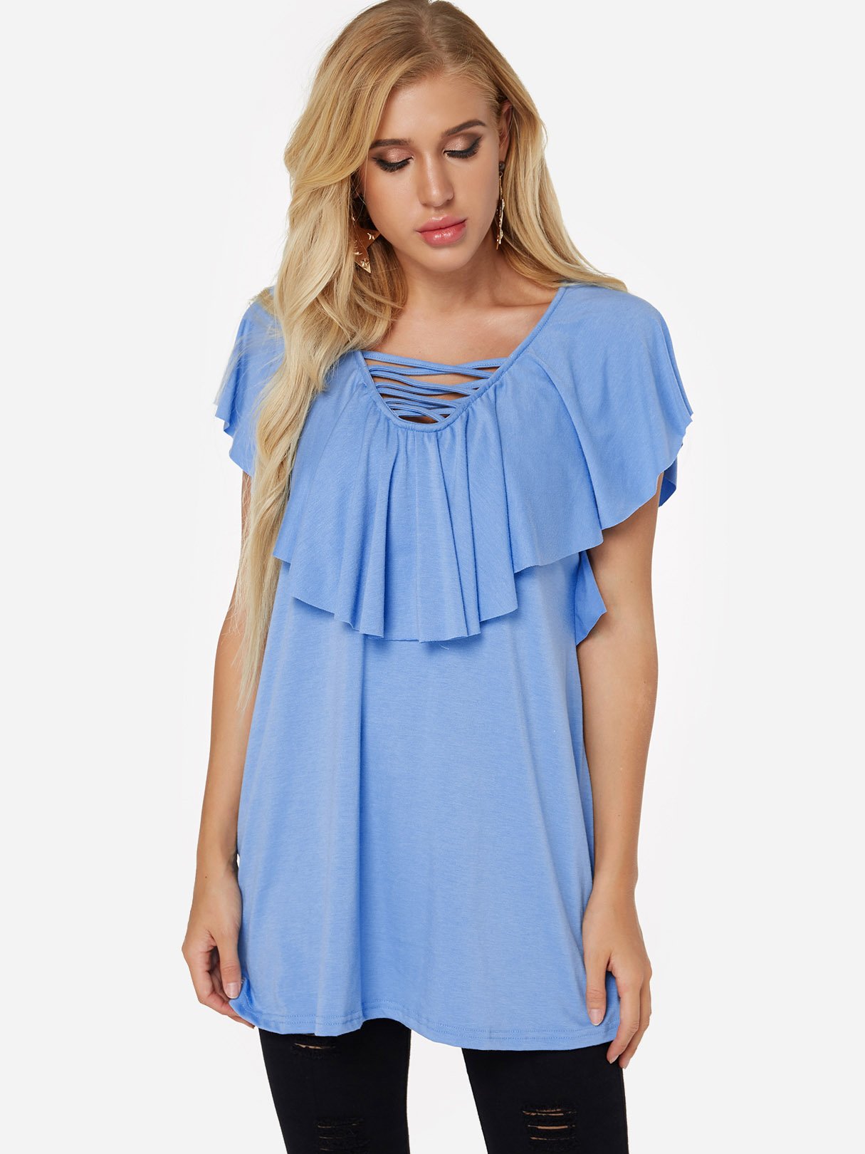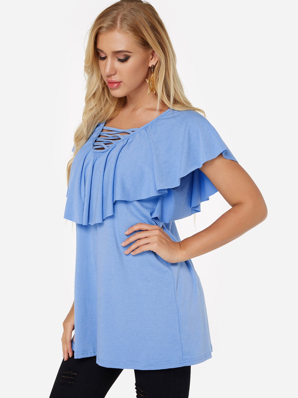 V-Neck Plain Tiered Lace-Up Short Sleeve Curved Hem Blue Top