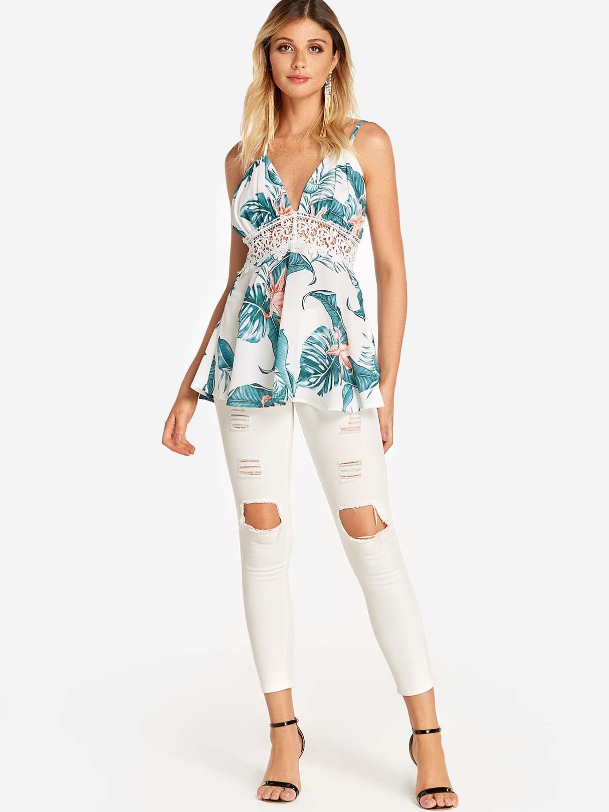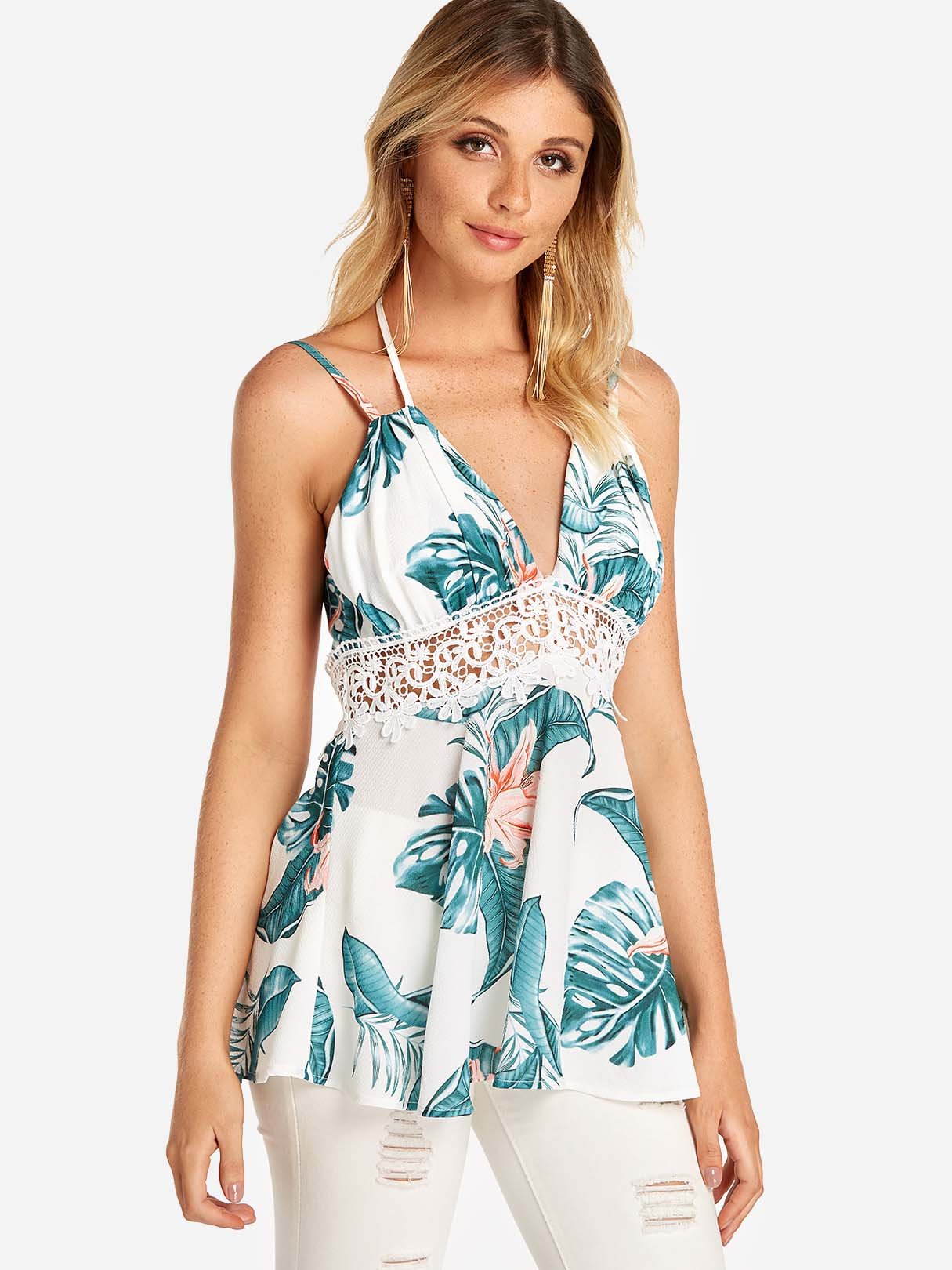 Material:PolyesterNeckline:V-NeckSeason:Spring,SummerSleeves:SleevelessPattern:PrintedStyle:Vacation StyleDetail:LaceFit:Regular Fit