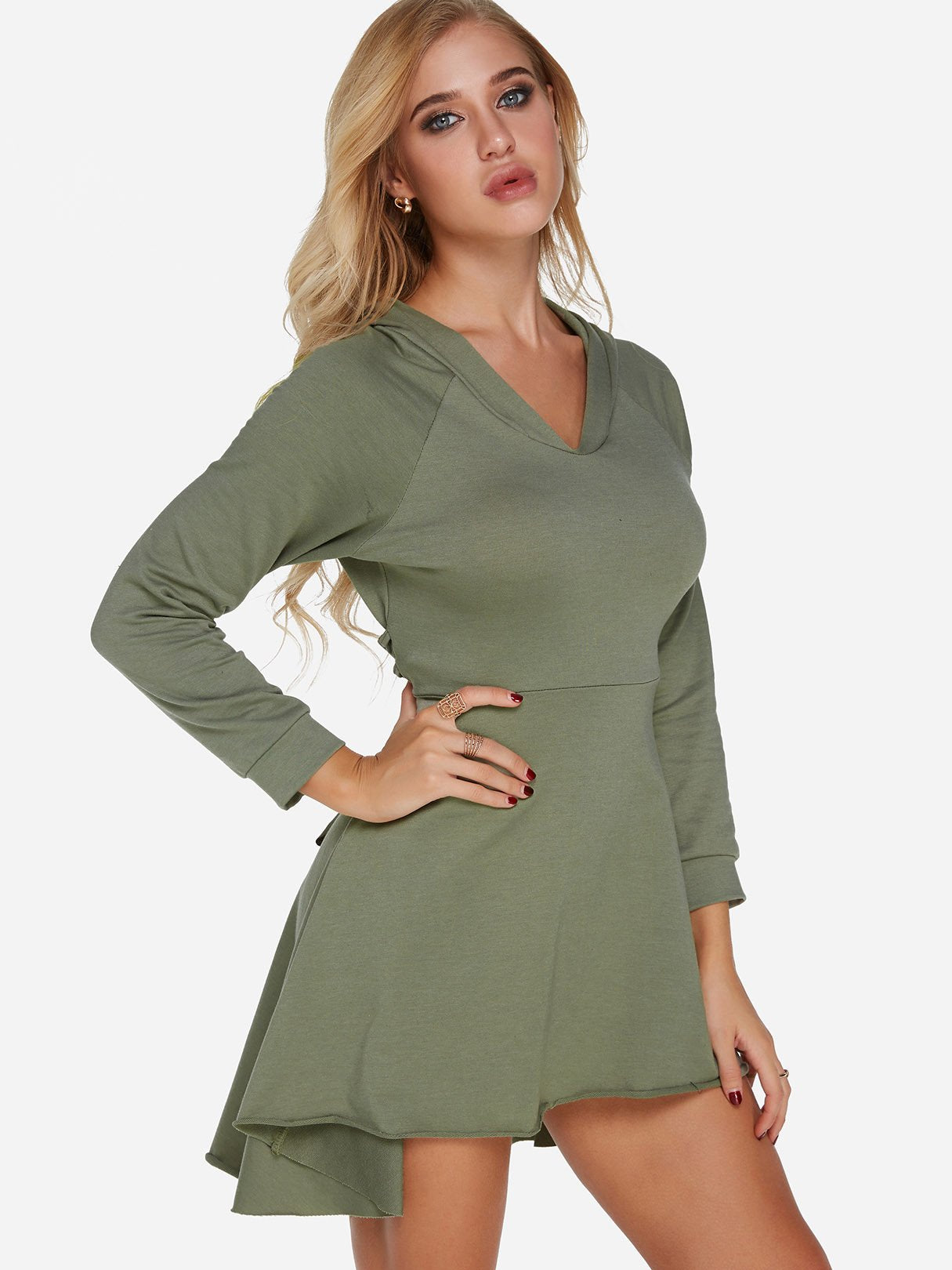 V-Neck Pullover Long Sleeve Plain Hooded Lace-Up Irregular Hem Dresses
