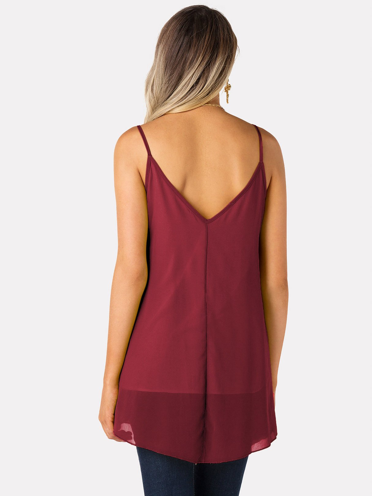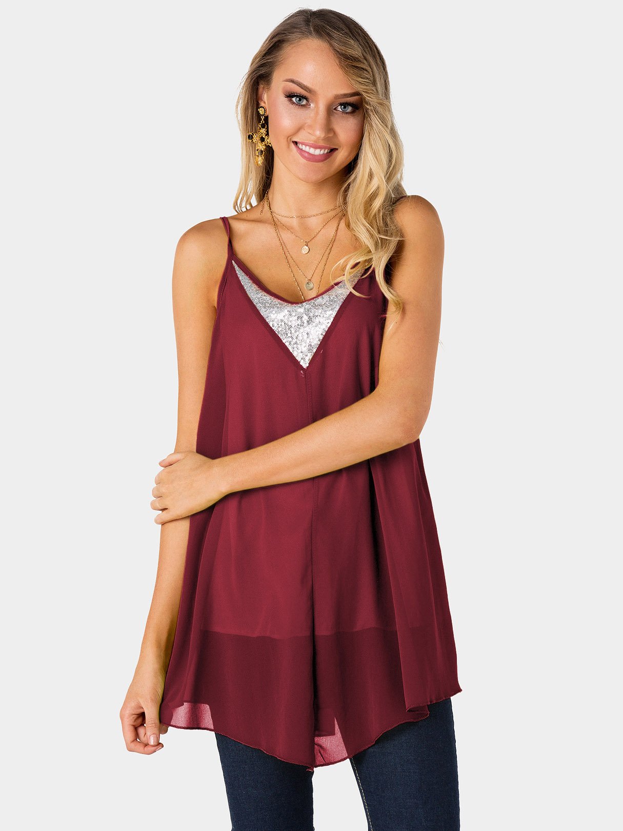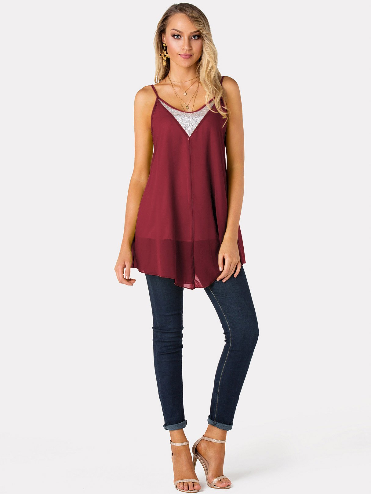 V-Neck Sequins Embellished Sleeveless Irregular Hem Burgundy Camis