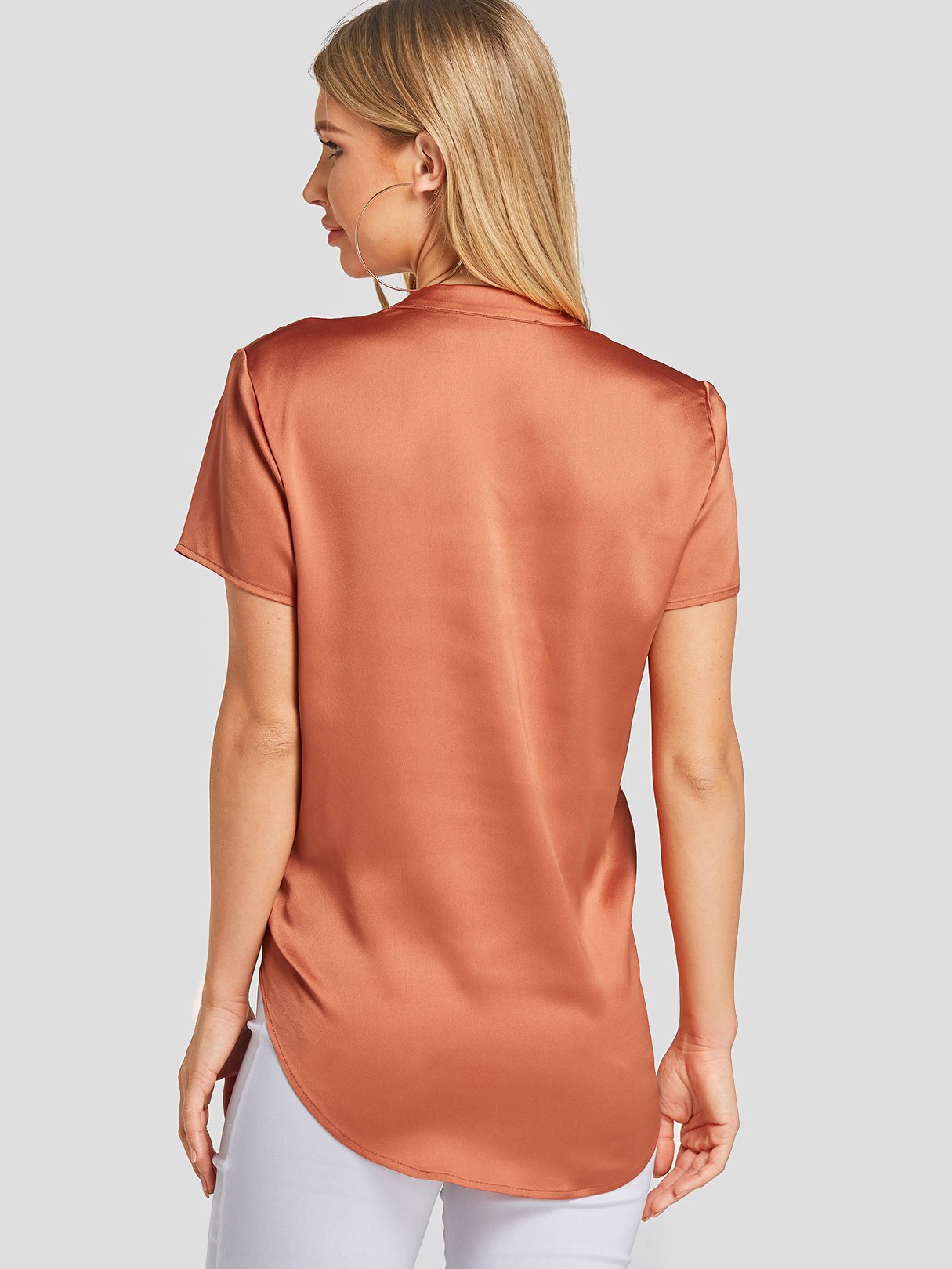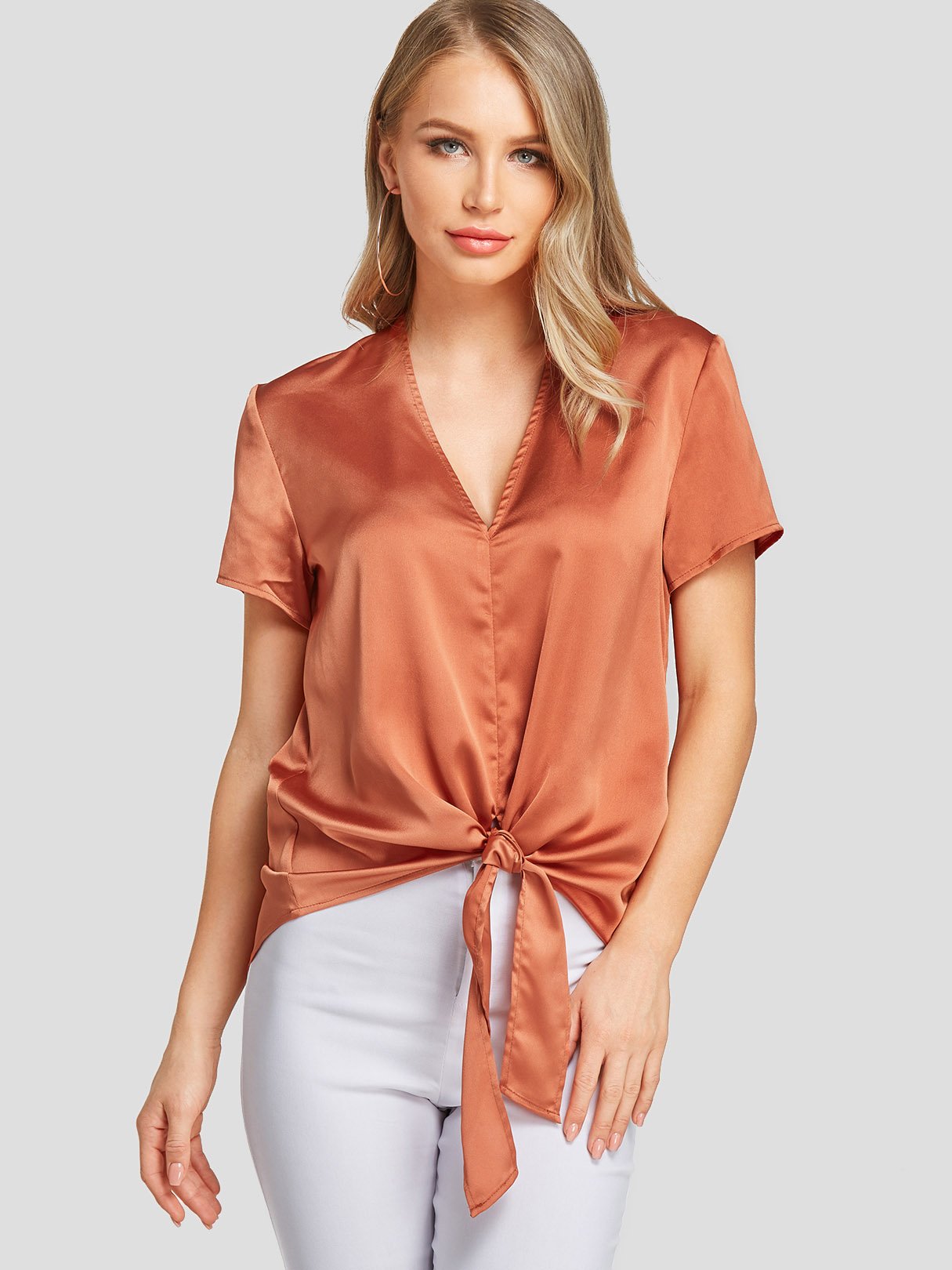 Material:Polyester,Satin,SpandexNeckline:V-NeckSeason:Spring,SummerSleeves:Short SleevesStyle:Simple StyleFit:Regular Fit