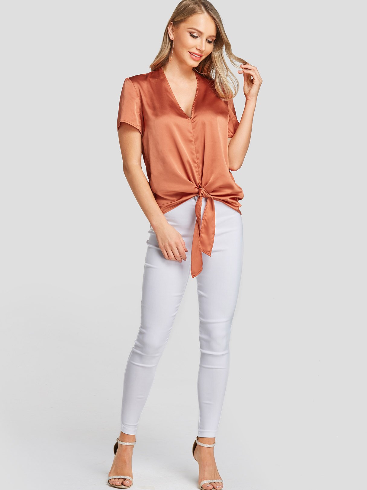 V-Neck Short Sleeve Brown Blouses - Brown / S is backordered and will ship as soon as it is back in stock.