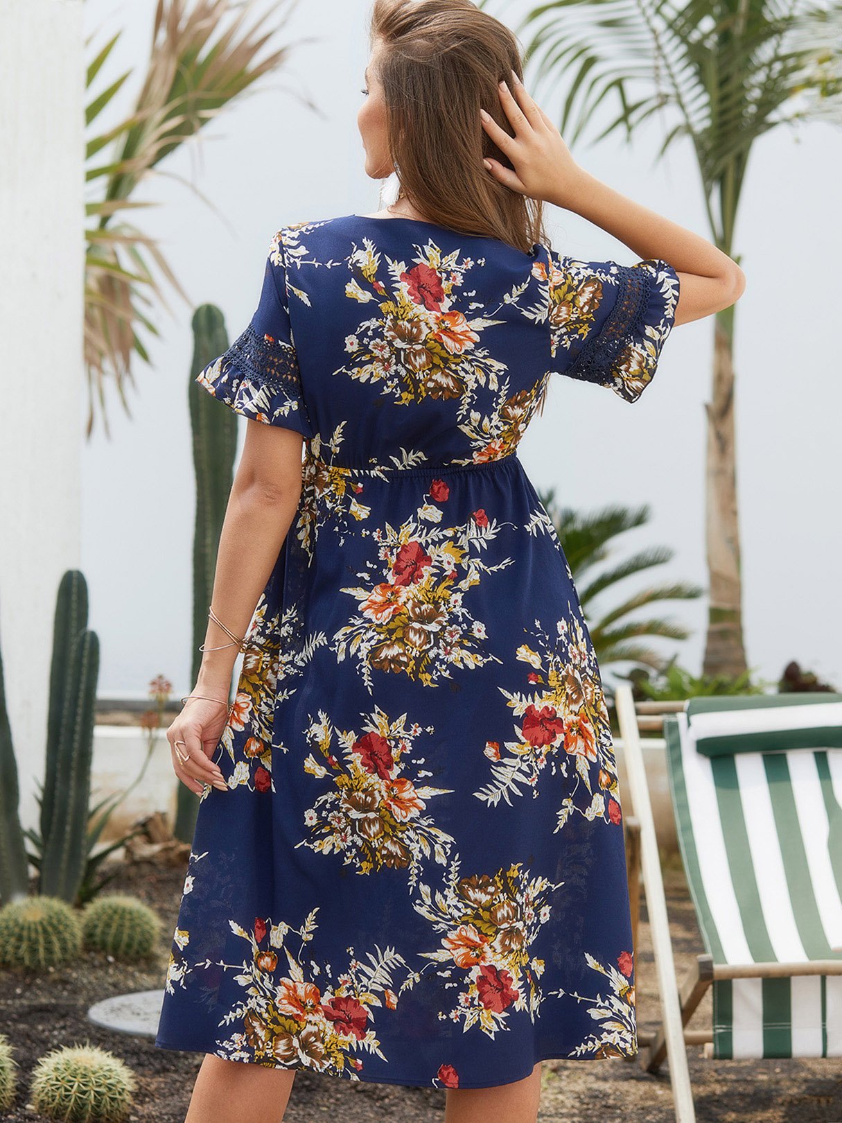 Material:PolyesterNeckline:V-NeckSeason:Spring,SummerSleeves:Short SleevesPattern:Floral PrintStyle:Vacation StyleDetail:Crochet Lace Embellished ,Self-Tie DesignLength:MidiFit:Regular FitSleeves Type:Ruffle SleevesOccasion:Vacation