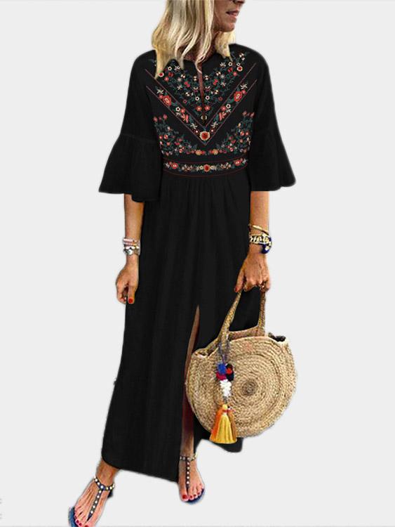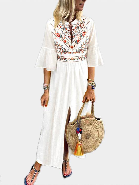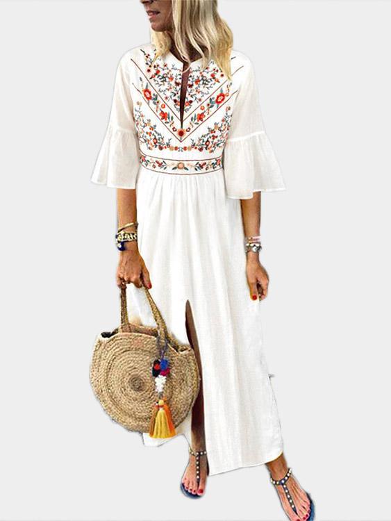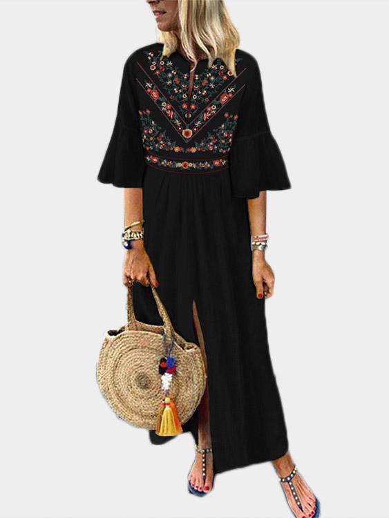 V-Neck Short Sleeve Floral Print Slit Hem Dresses