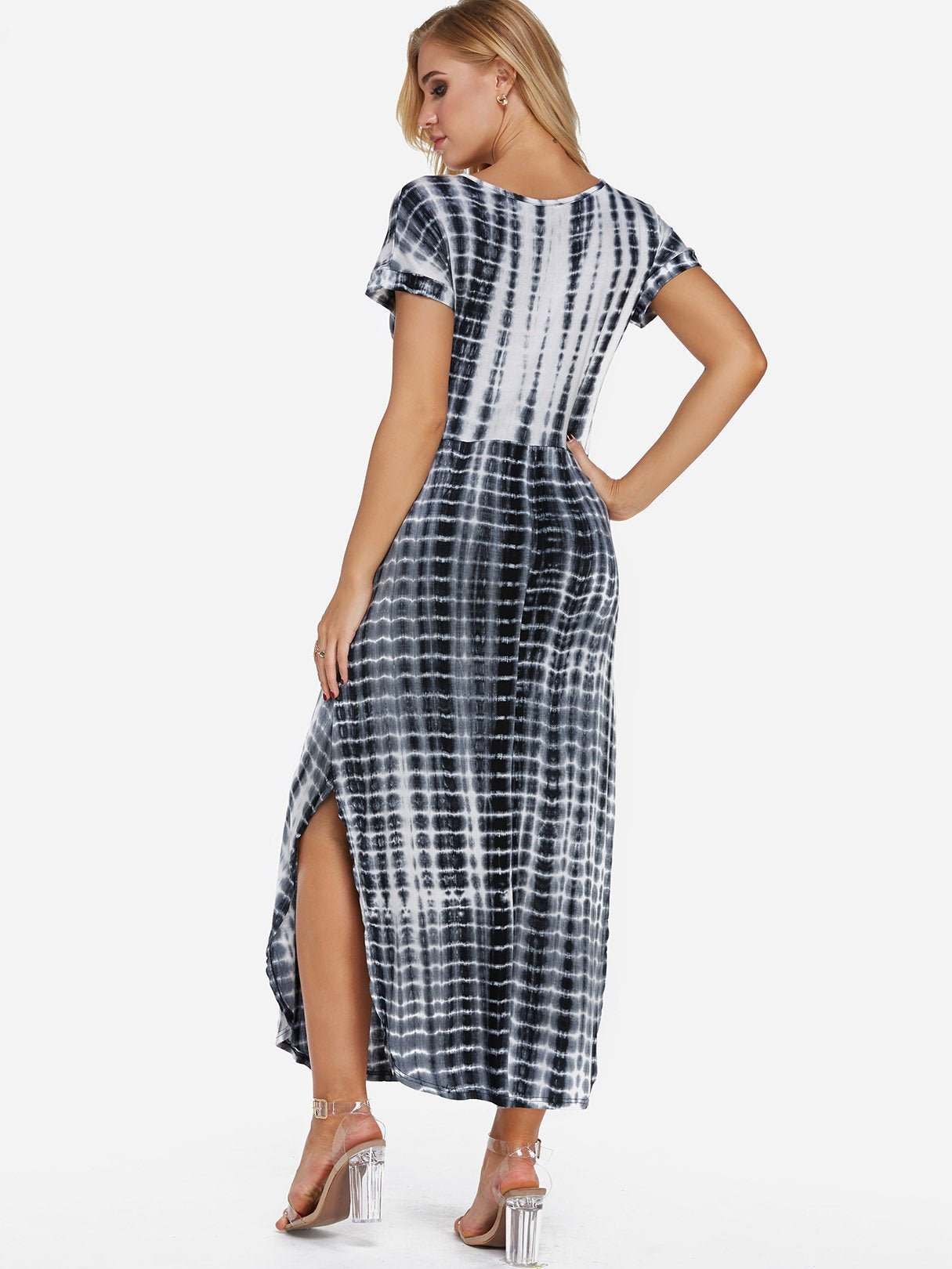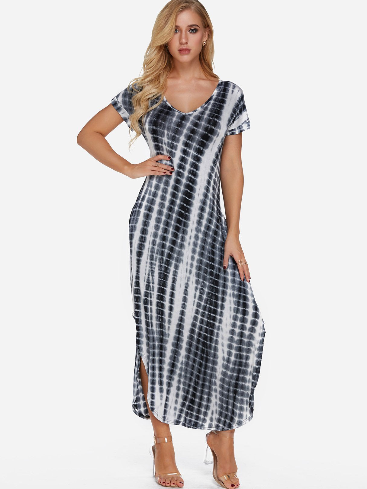 V-Neck Short Sleeve Printed Slit Hem Dresses