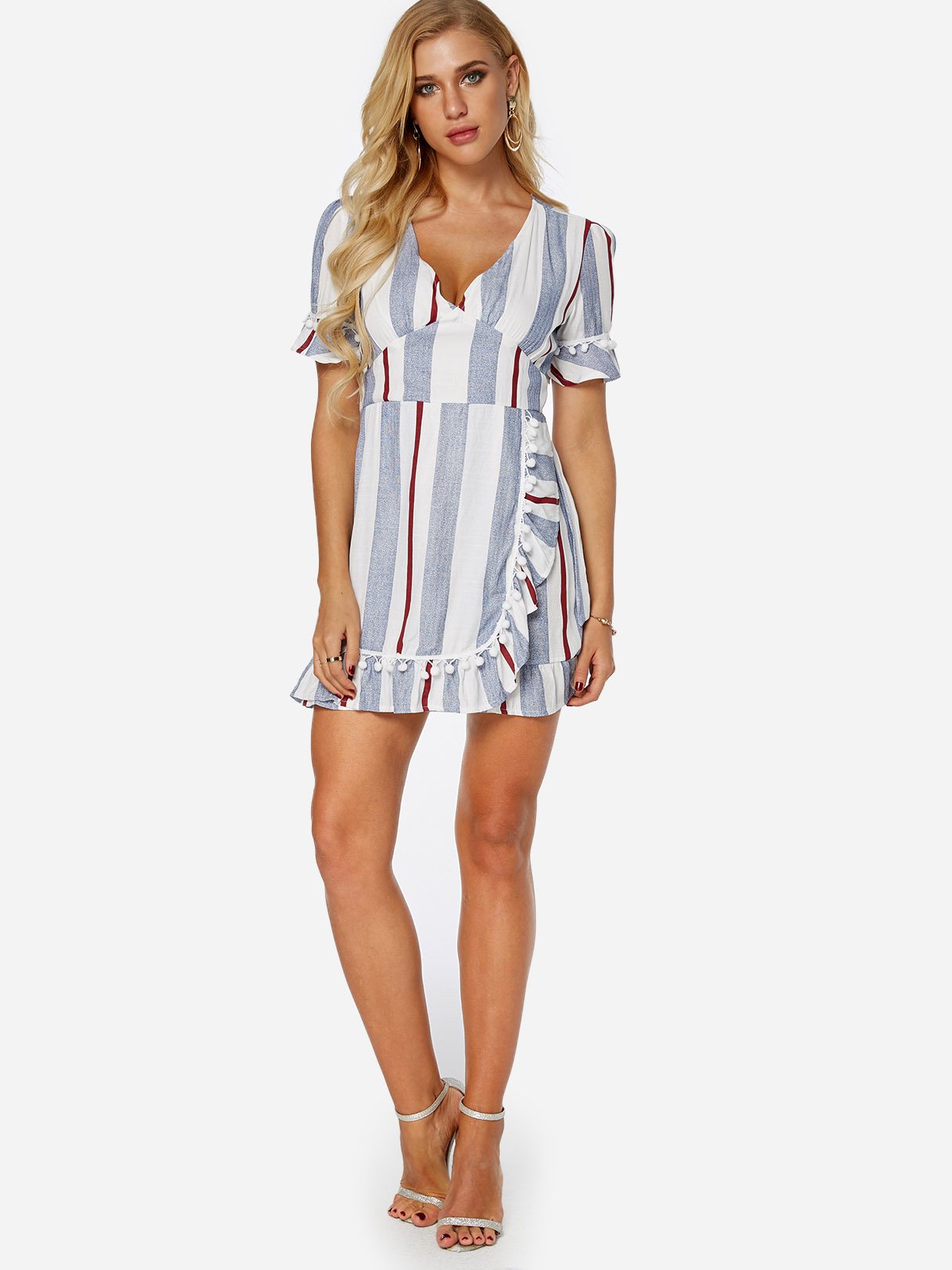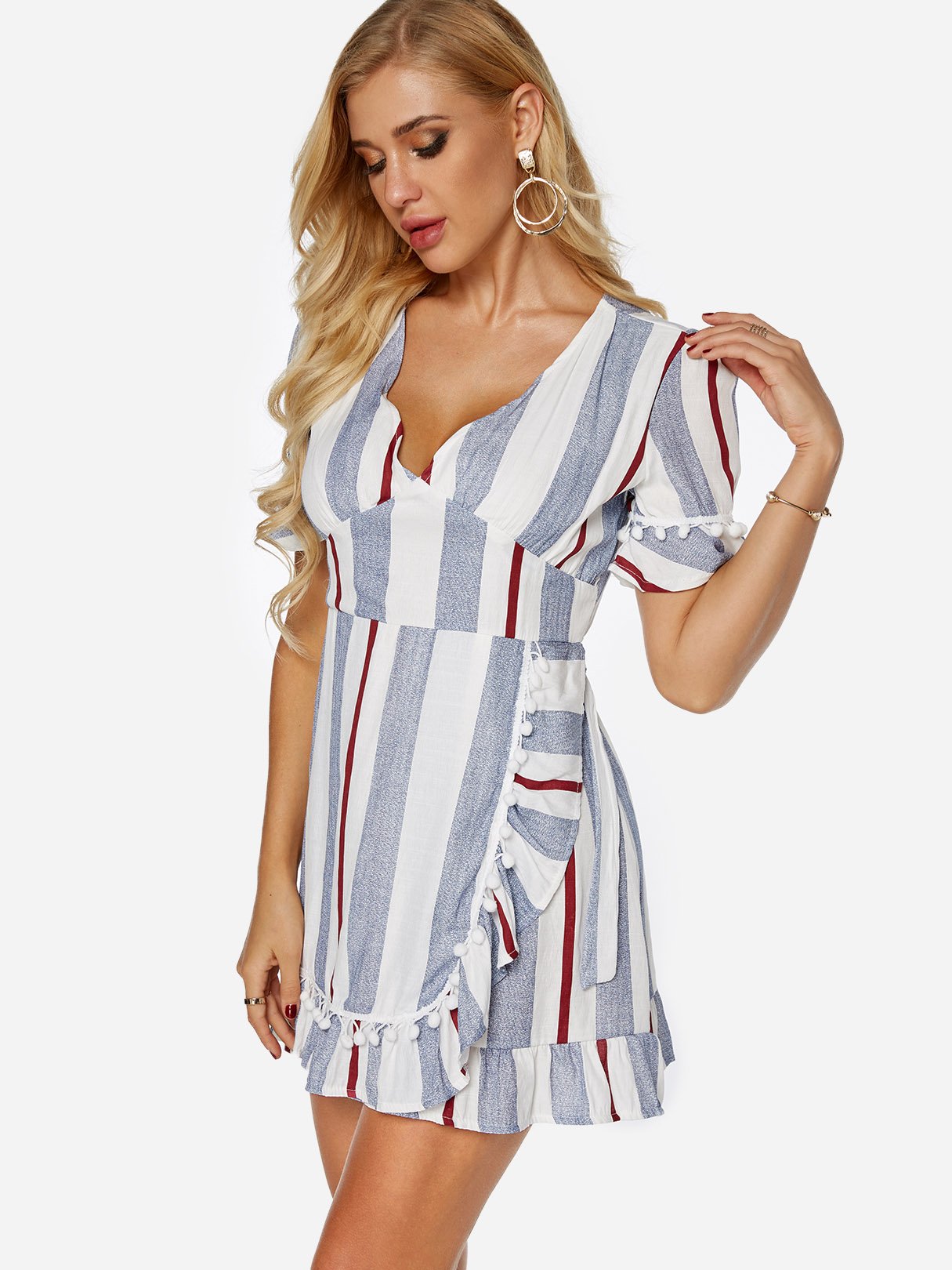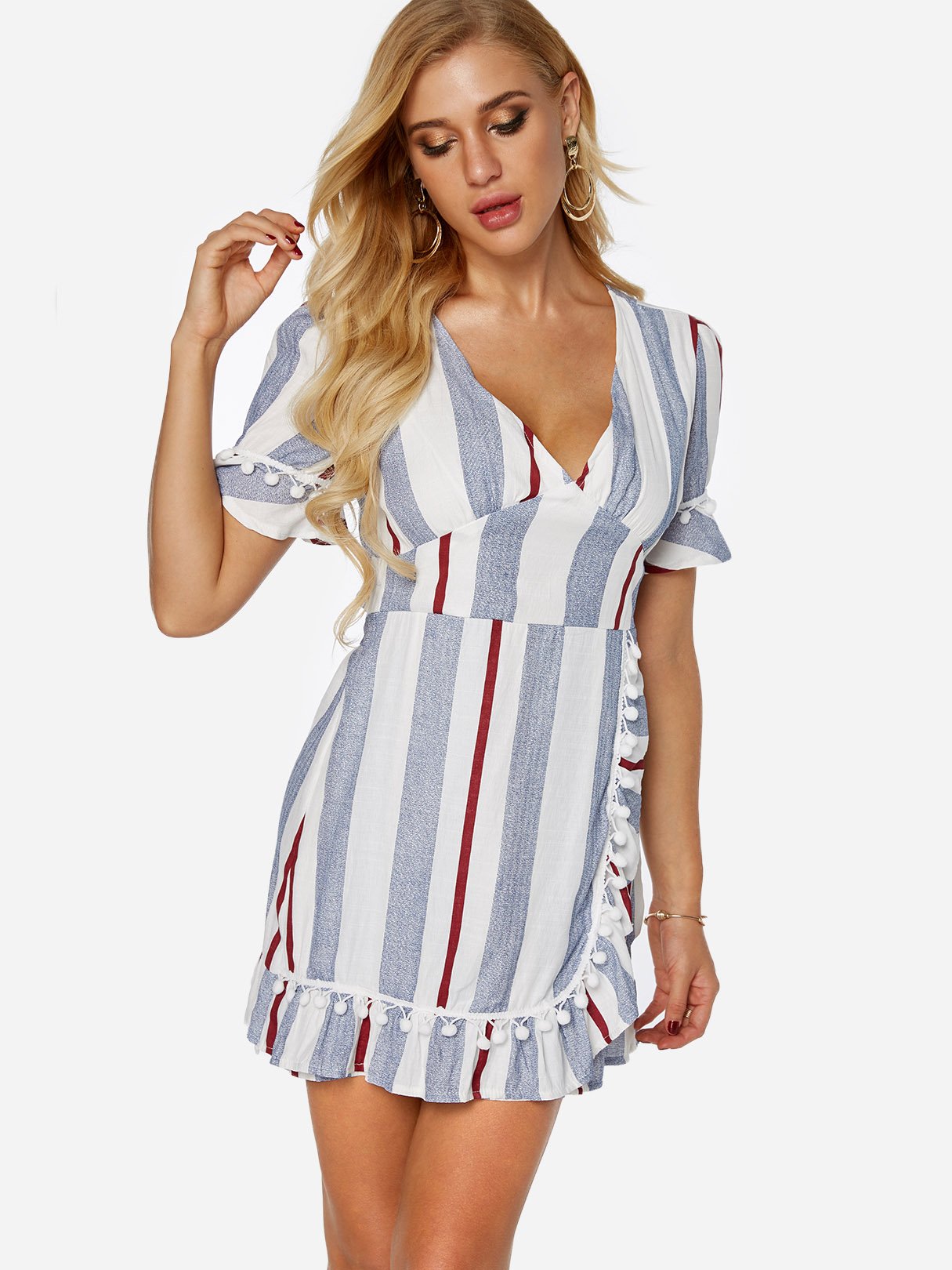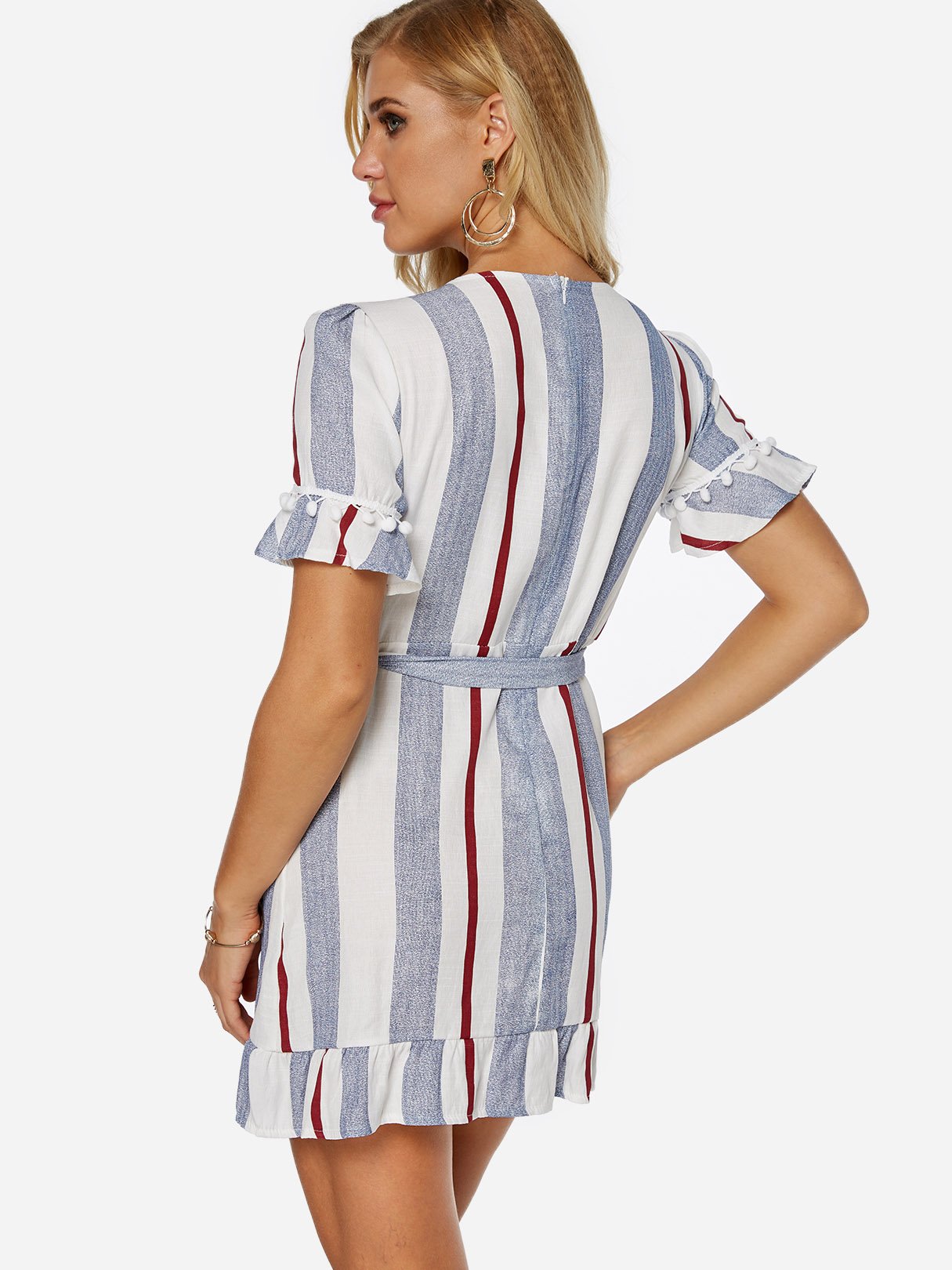 V-Neck Short Sleeve Stripe Zip Back Self-Tie Flounced Hem Dresses