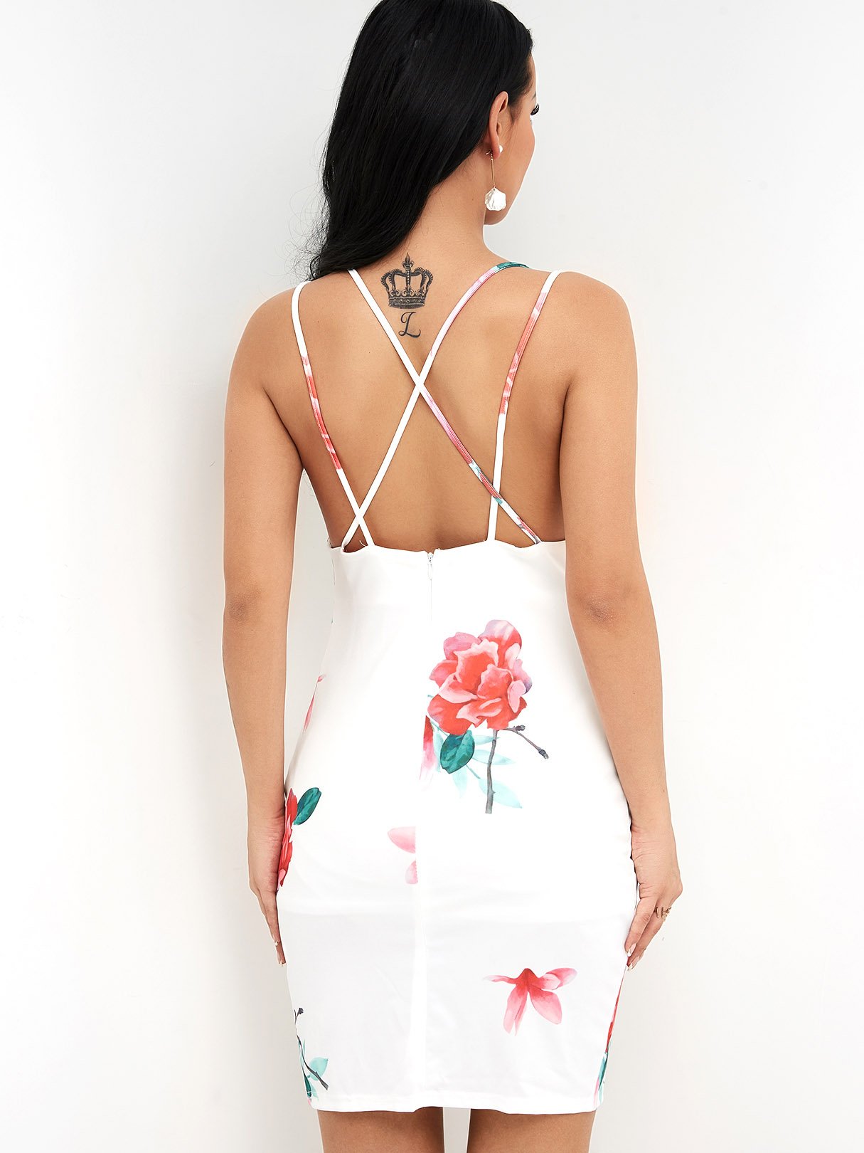Material:PolyesterNeckline:V-NeckSeason:Spring,Summer,AutumnSleeves:SleevelessPattern:Floral PrintStyle:Sexy StyleDetail:Backless Design,Lace-Up Design,Slit Design,Criss-CrossHem Design:Slit Hem,Bodycon HemLength:MiniFit:Bodycon Fit