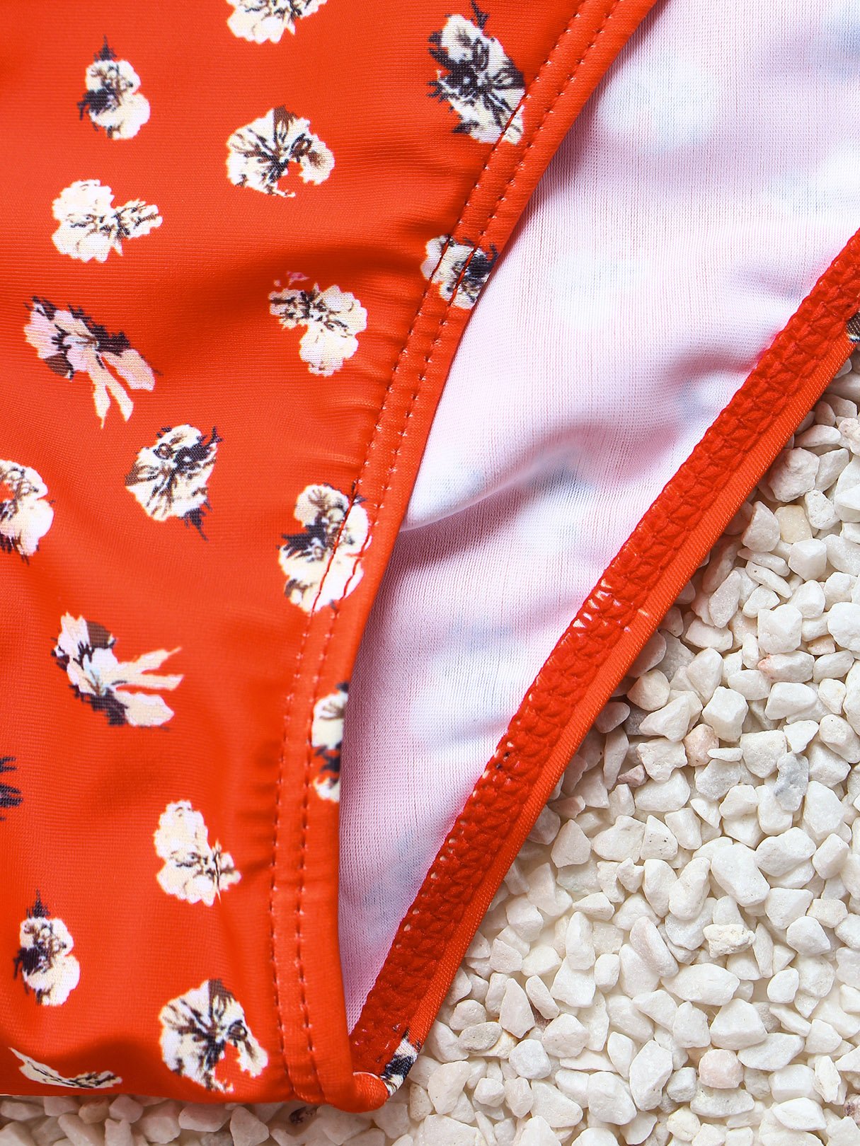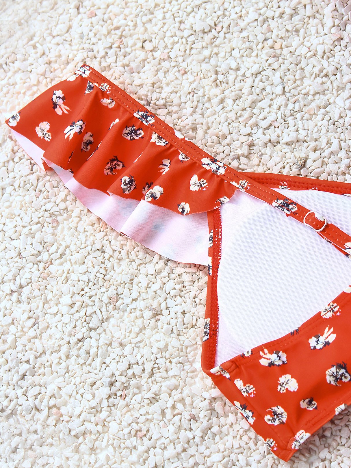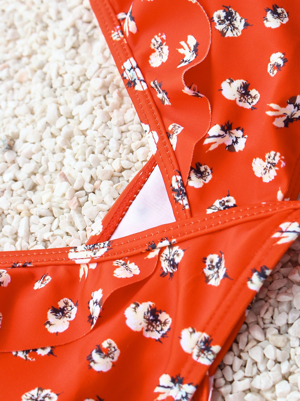 V-Neck Sleeveless Floral Print Crossed Front Tie-Up Ruffle Hem Bikinis